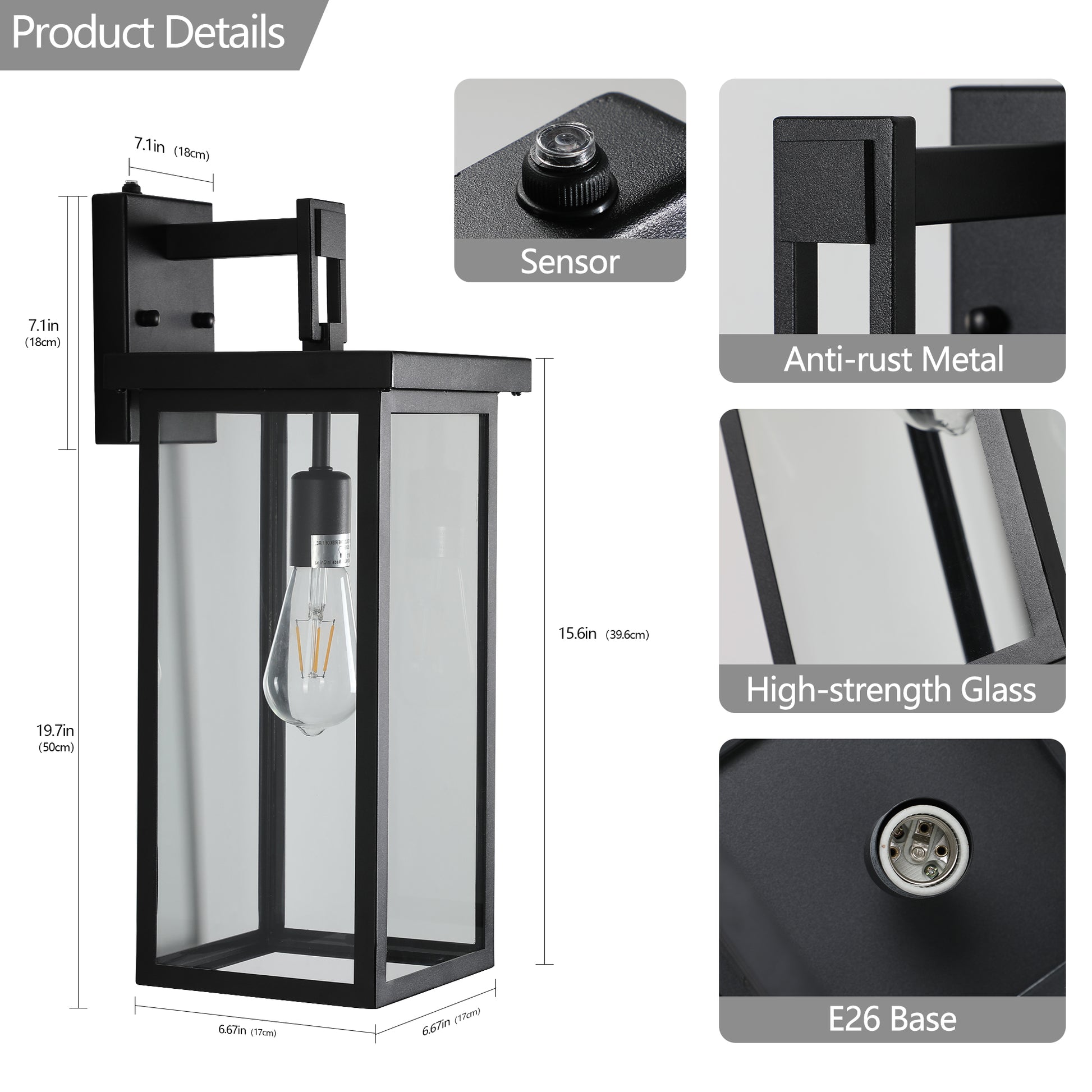 Set Of 2 Modern Outdoor Wall Lanterns With Black Metal Frame And Clear Glass, Ambient Light Sensors,Weatherproof Wall Sconces For Porch, Garage, Or Entryway Lighting, E26 Bulb Compatible Black Modern Glass Aluminium