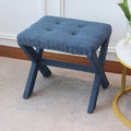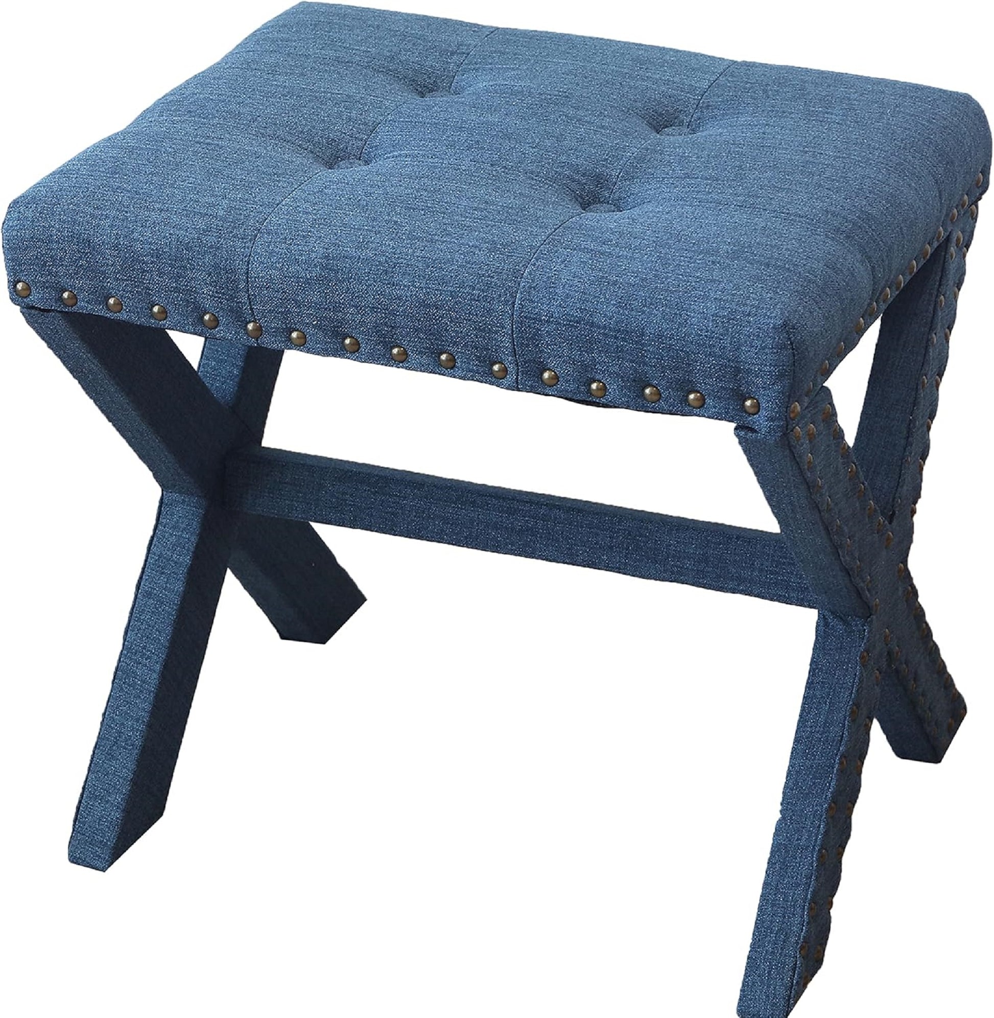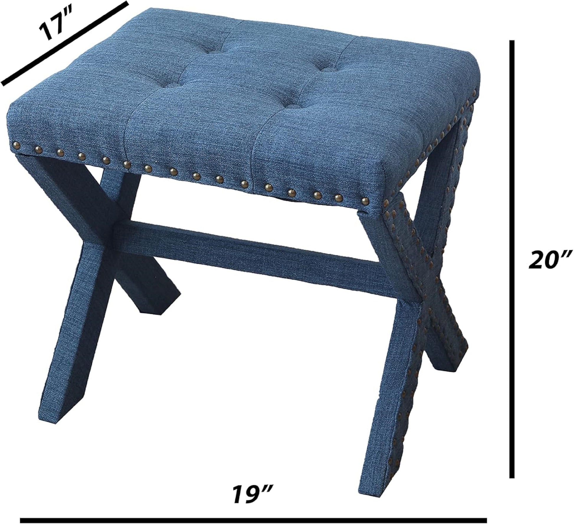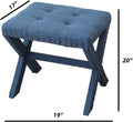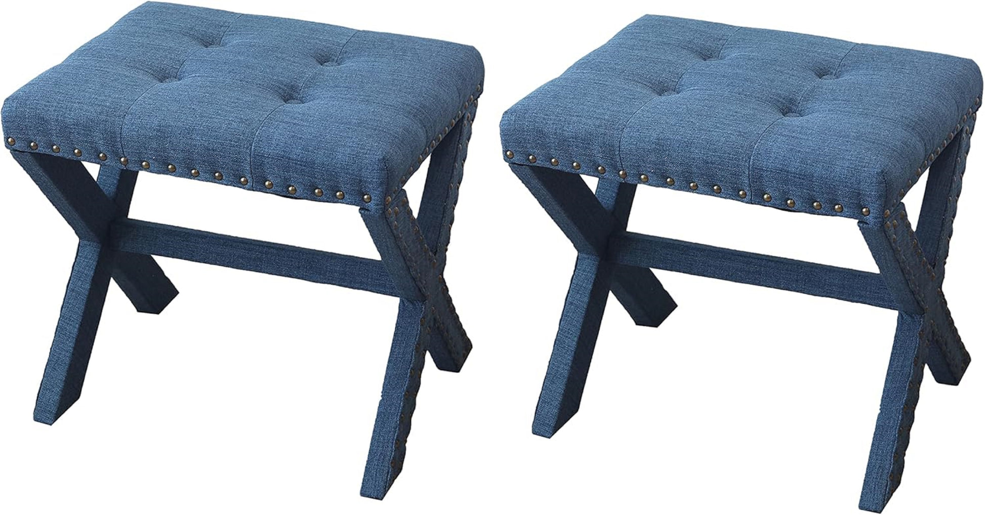 Introducing our modern chic vanity stool set of 2 the perfect addition to your bedroom or dressing room. Made with high-quality materials, this stool is both stylish and functional. The X-Base legs provide a sturdy foundation while adding a modern touch to the design.STYLISH Beauty ROUTINE: Our vanity chair elevates your daily beauty routine with its tufted soft linen seat, X-base & nail-head trim; It's the ultimate makeup stool for any fashion-forward individual.COMPACT & LIGHTWEIGHT: At 5 lbs, our accent chair is perfect as a standalone piece or a vanity bench; Compact, versatile, and easy to move around, you can perfectly fit this vanity seat to any room.MAXIMUM COMFORT: This comfy chair is upholstered in soft and luxurious fabric that feels great against the skin; It's an impeccable vanity stool chair for all your daily grooming needs.RELIABLE : This sturdy decorative chair provides style and comfort during long beauty sessions; With a solid wood X-shaped base & generously padded seat, it's the perfect sitting stool for any room.IDEAL MEASUREMENTS: Our vanity bench seat measures 19" L x 17" D x 17" H & has a capacity of 300 lbs; It is suitable as a cute vanity chair, entryway stool, or comfy accent chair for your bedroom. Listing Includes:- 2pc Vanity Stools Only.