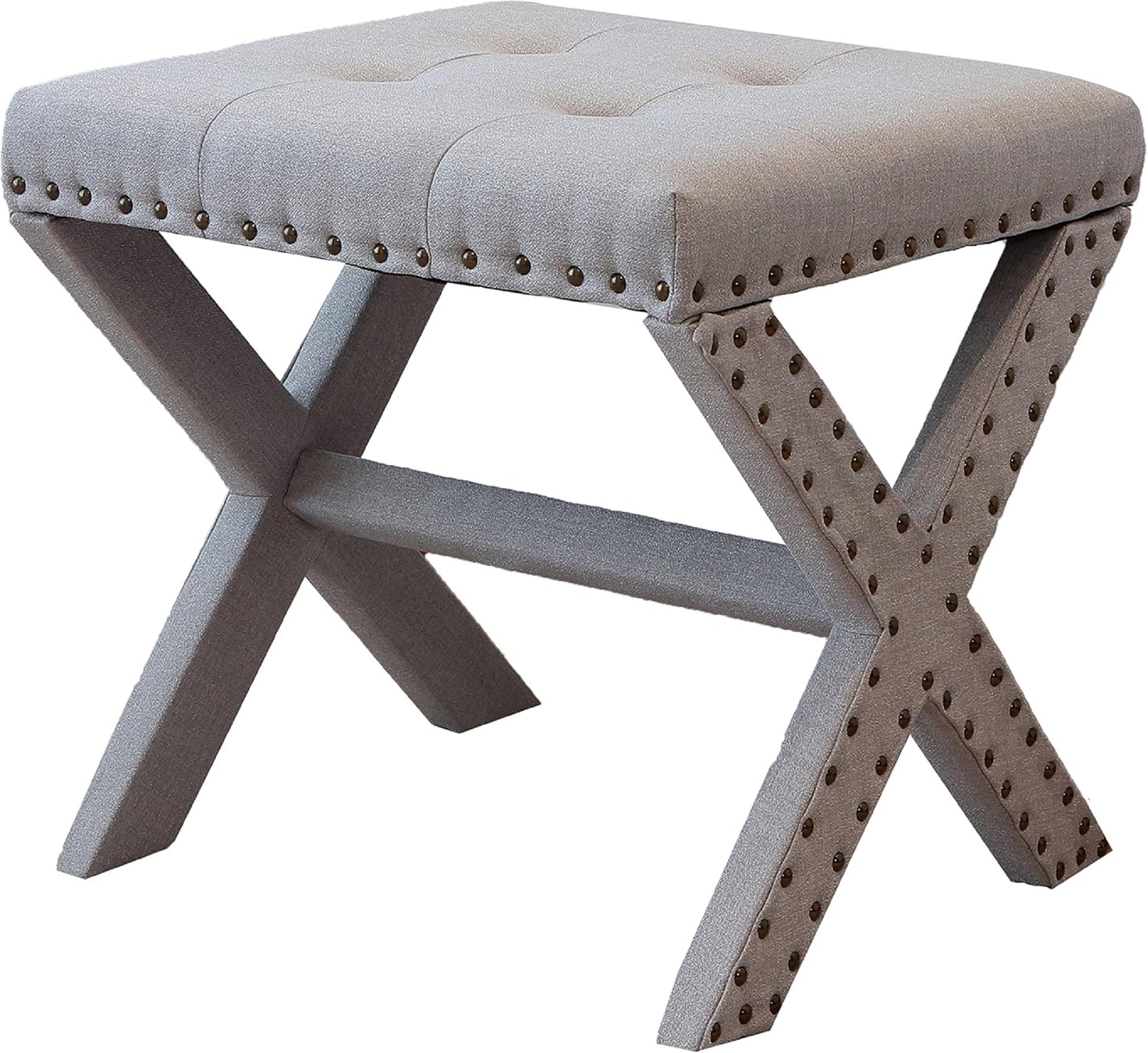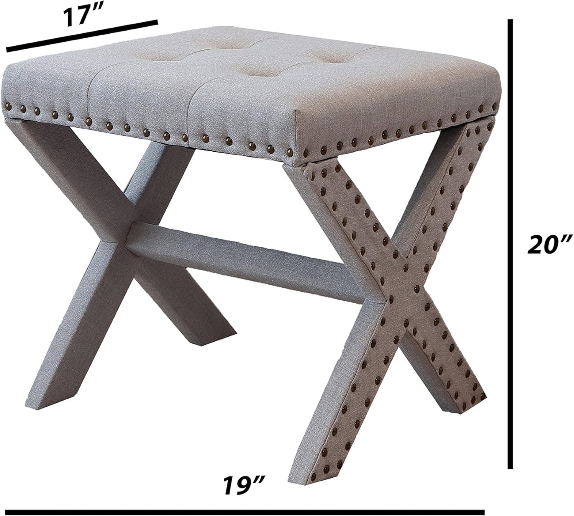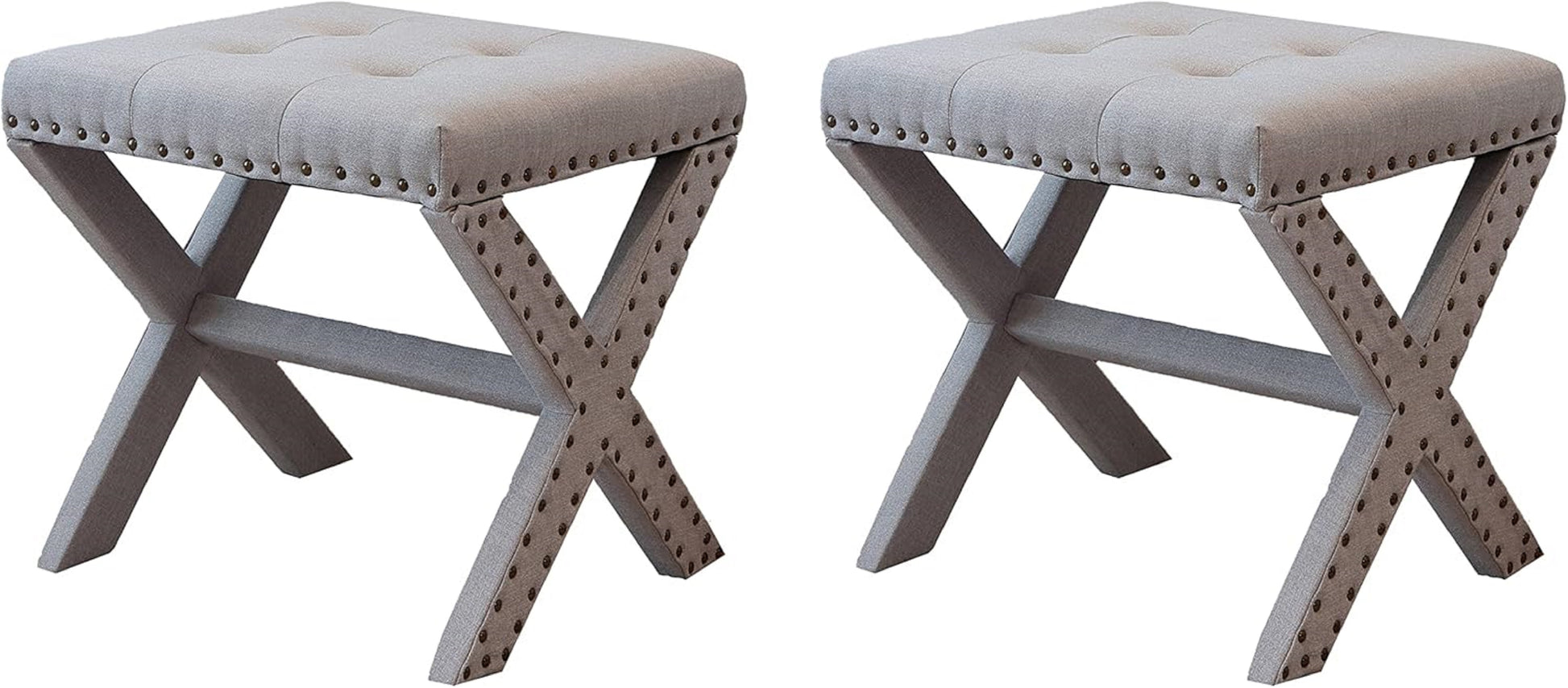 Introducing our modern chic vanity stool set of 2 the perfect addition to your bedroom or dressing room. Made with high-quality materials, this stool is both stylish and functional. The X-Base legs provide a sturdy foundation while adding a modern touch to the design.STYLISH Beauty ROUTINE: Our vanity chair elevates your daily beauty routine with its tufted soft linen seat, X-base & nail-head trim; It's the ultimate makeup stool for any fashion-forward individual.COMPACT & LIGHTWEIGHT: At 5 lbs, our accent chair is perfect as a standalone piece or a vanity bench; Compact, versatile, and easy to move around, you can perfectly fit this vanity seat to any room.MAXIMUM COMFORT: This comfy chair is upholstered in soft and luxurious fabric that feels great against the skin; It's an impeccable vanity stool chair for all your daily grooming needs.RELIABLE : This sturdy decorative chair provides style and comfort during long beauty sessions; With a solid wood X-shaped base & generously padded seat, it's the perfect sitting stool for any room.IDEAL MEASUREMENTS: Our vanity bench seat measures 19" L x 17" D x 17" H & has a capacity of 300 lbs; It is suitable as a cute vanity chair, entryway stool, or comfy accent chair for your bedroom. Listing Includes:- 2pc Vanity Stools Only.