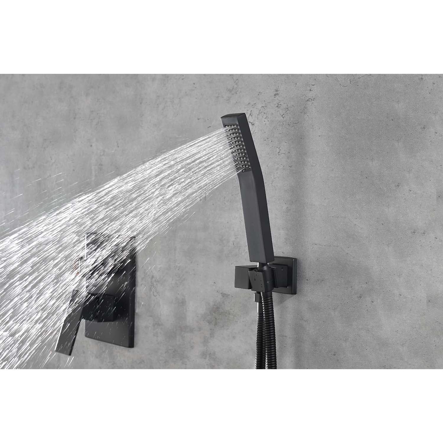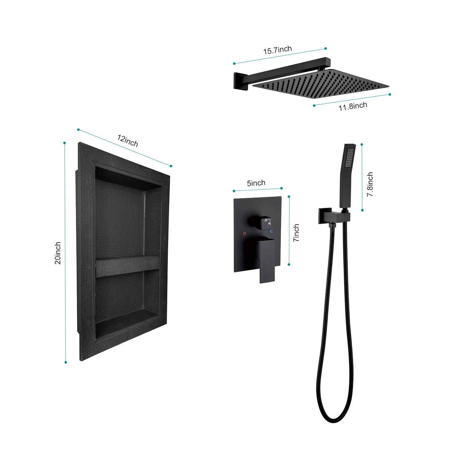 Shower System With Rain Shower Head, Hand Shower Head, Water Control Valve, Shower Bracket, Hose And Niche Matte Black Wall Mounted Bathroom Brass