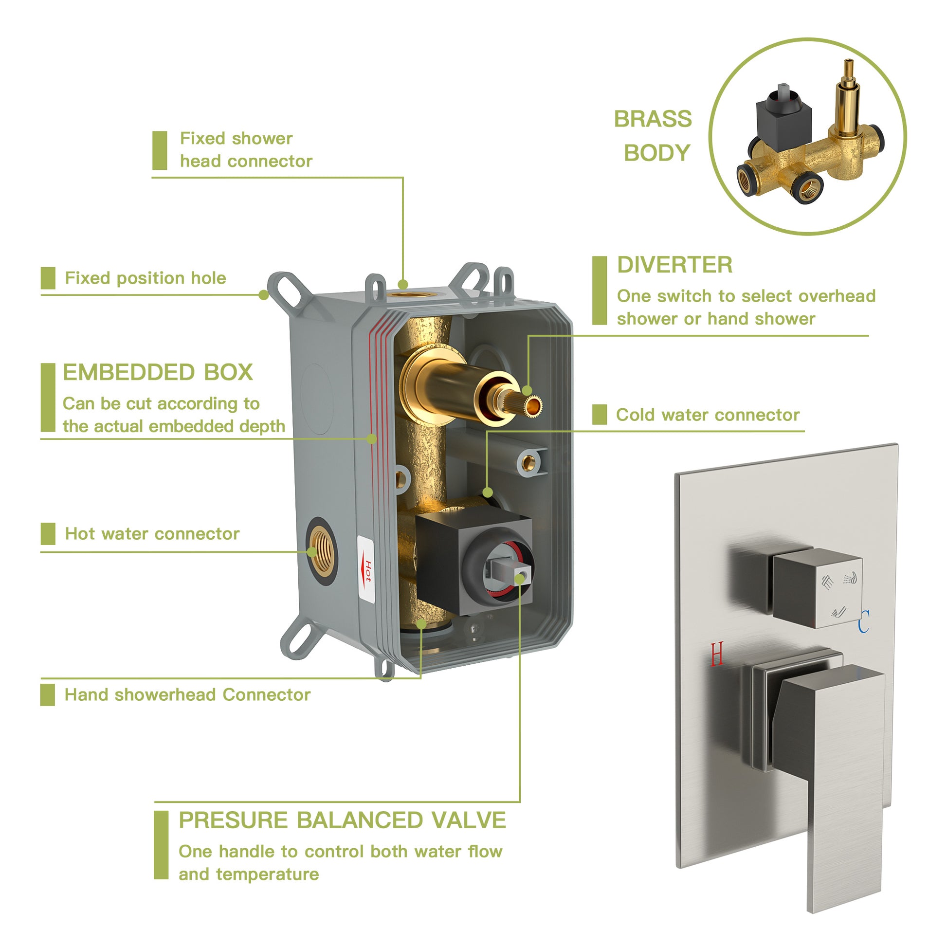 Shower System With Waterfall Tub Spout,12 Inch Wall Mounted Square Shower System With Rough In Valve, Brushed Nickel Brushed Nickel Stainless Steel