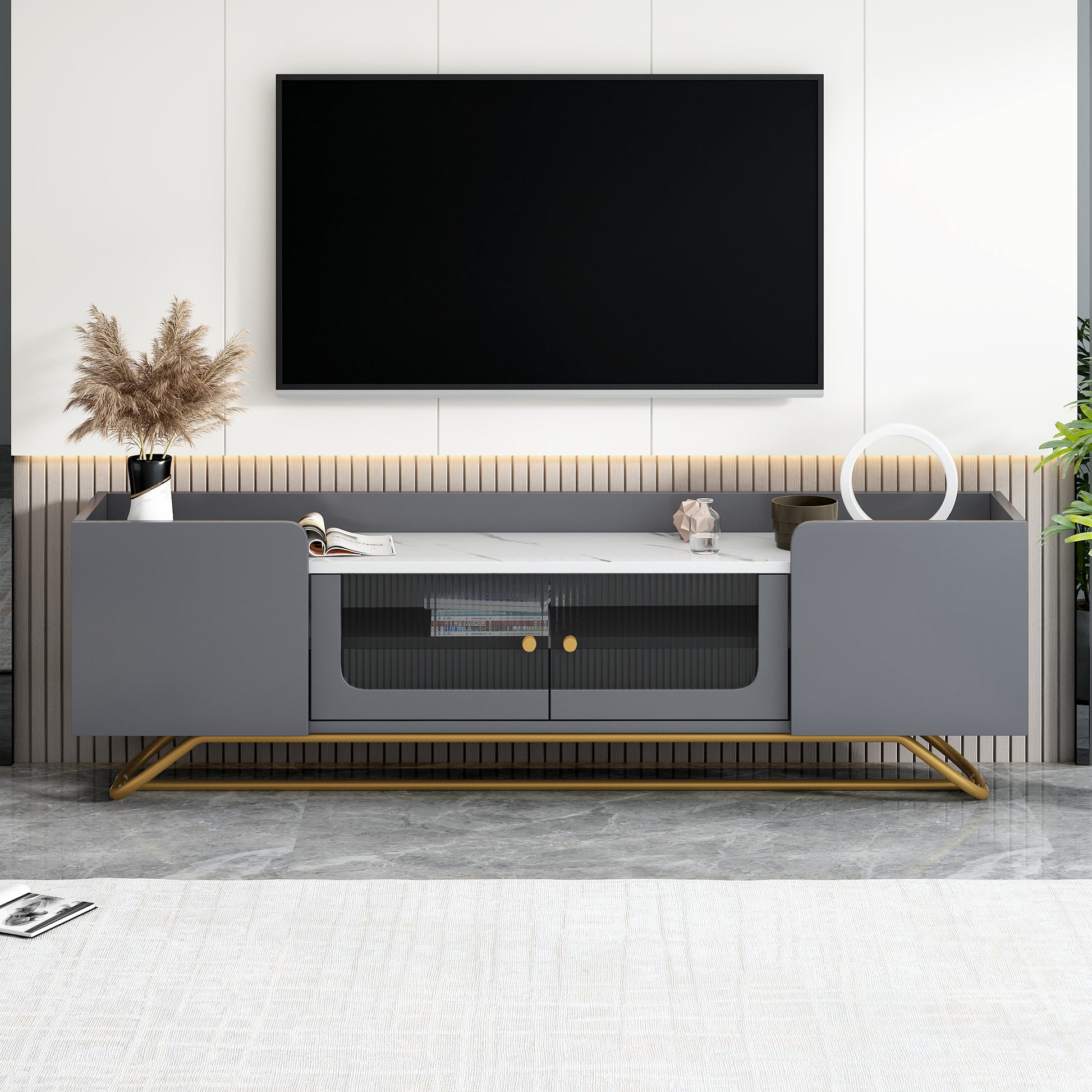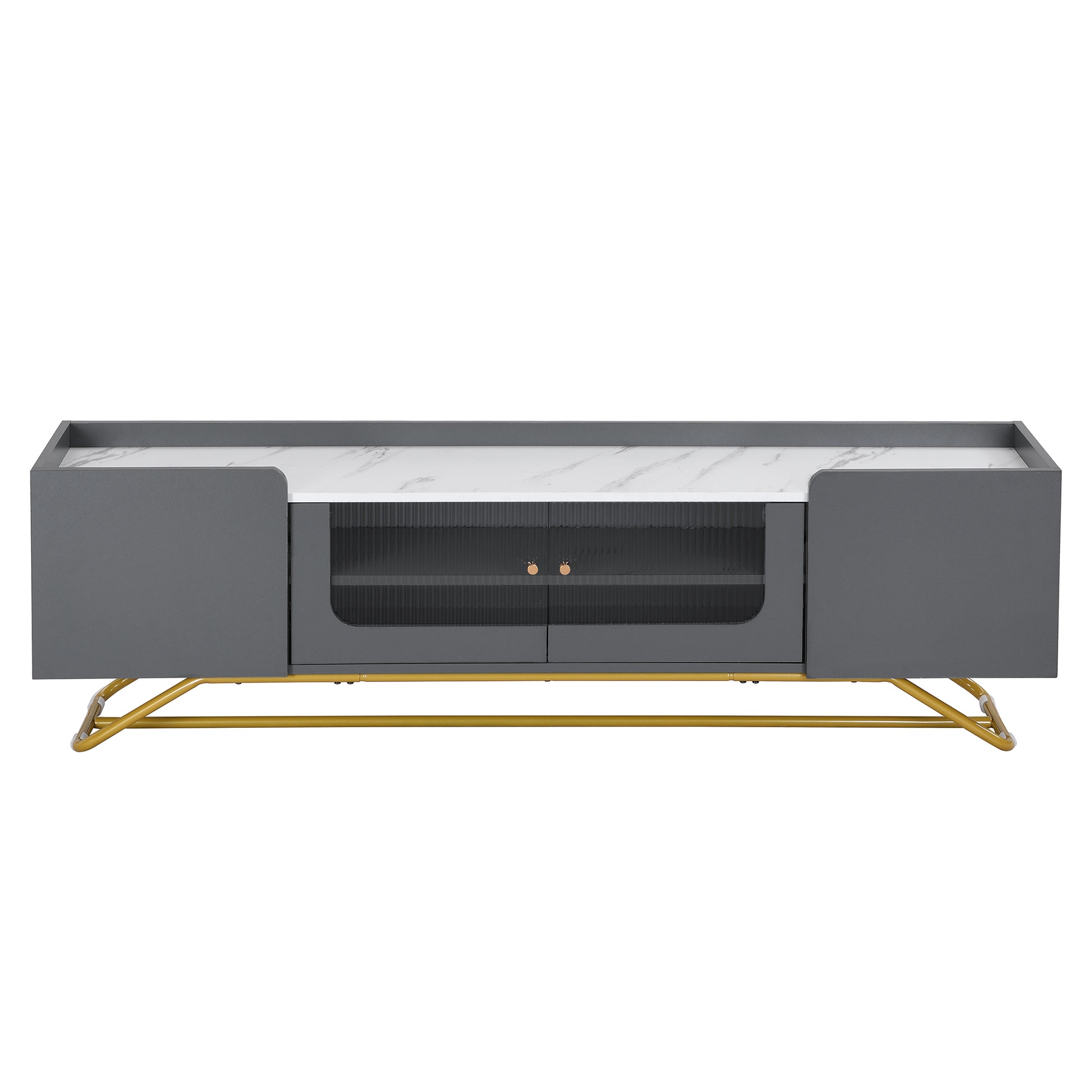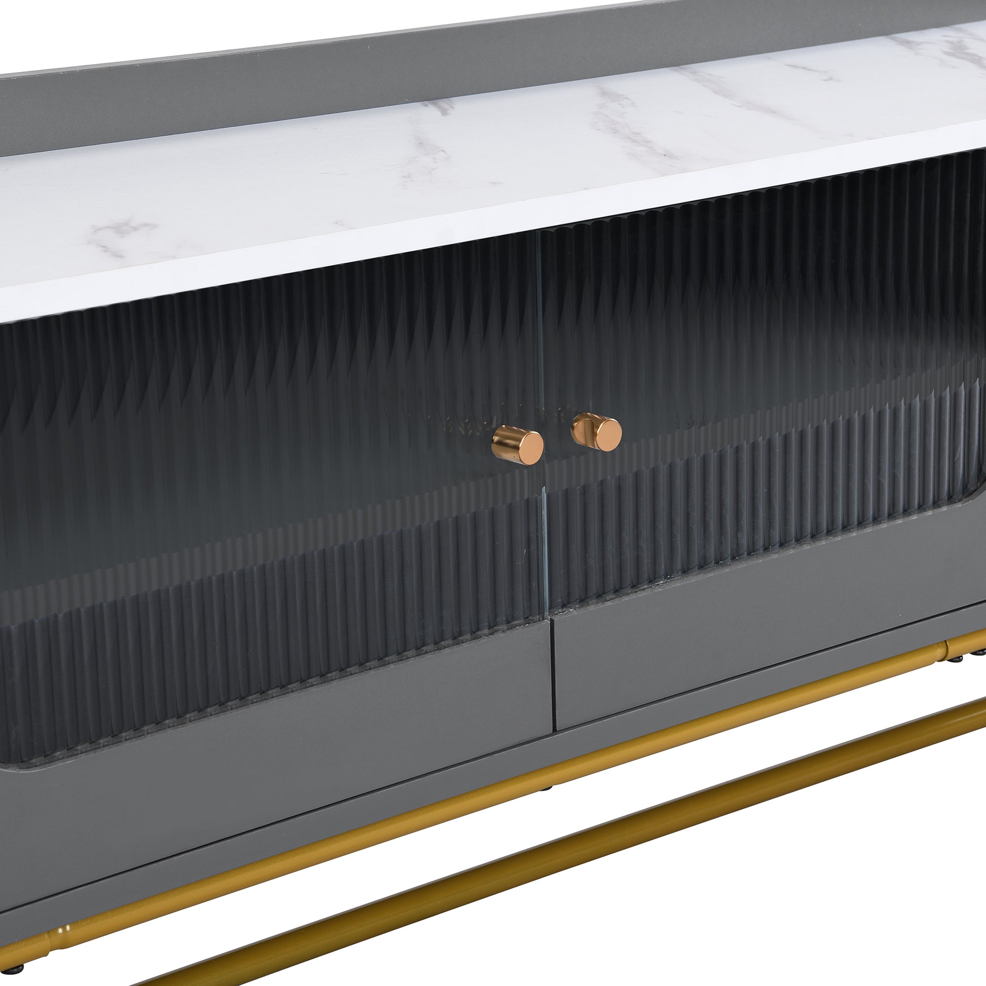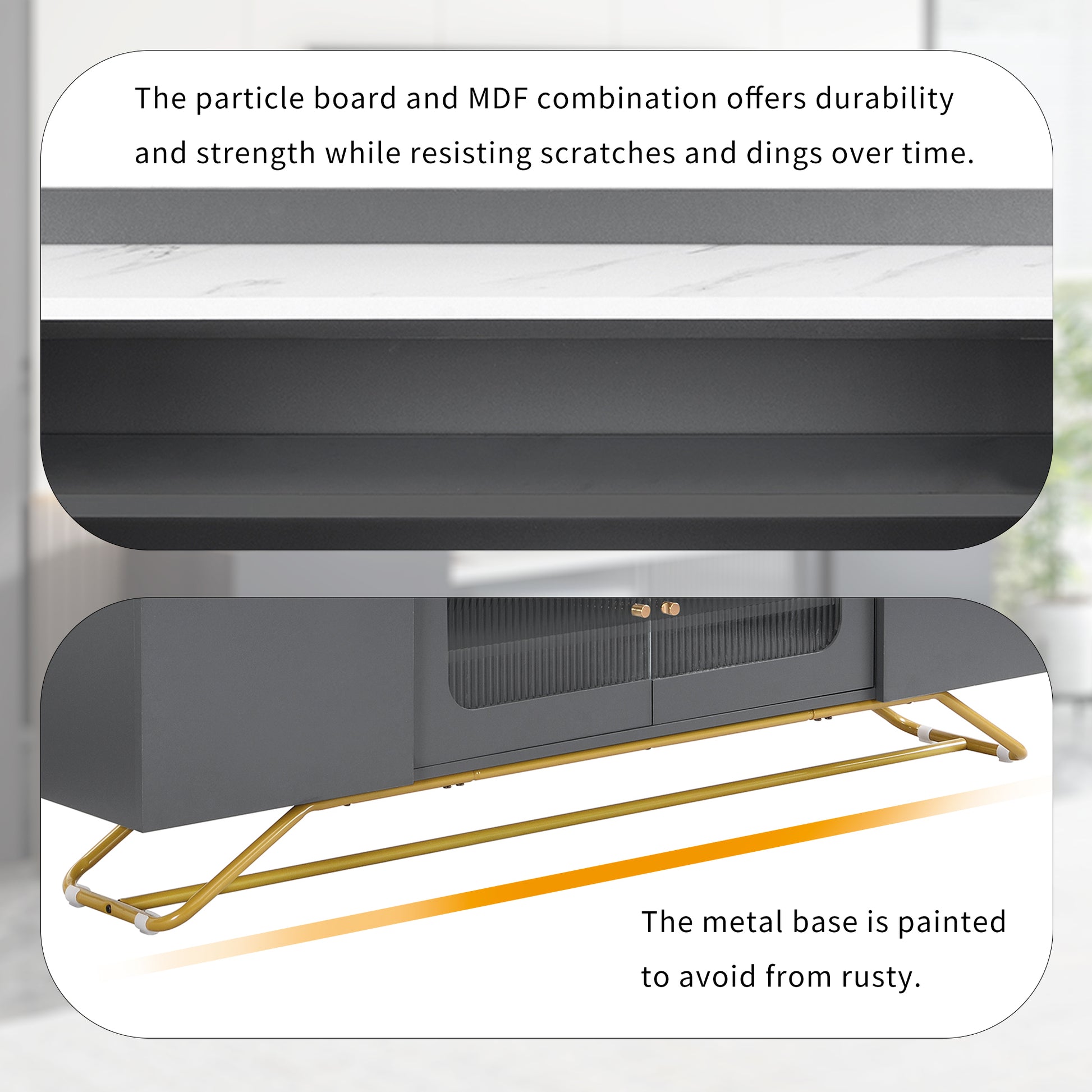 Sleek Design Tv Stand With Fluted Glass, Contemporary Entertainment Center For Tvs Up To 70", Faux Marble Top Tv Console Table With Gold Frame Base, Grey Grey Primary Living Space 70 79 Inches 70 79 Inches Modern 70 Inches Particle Board