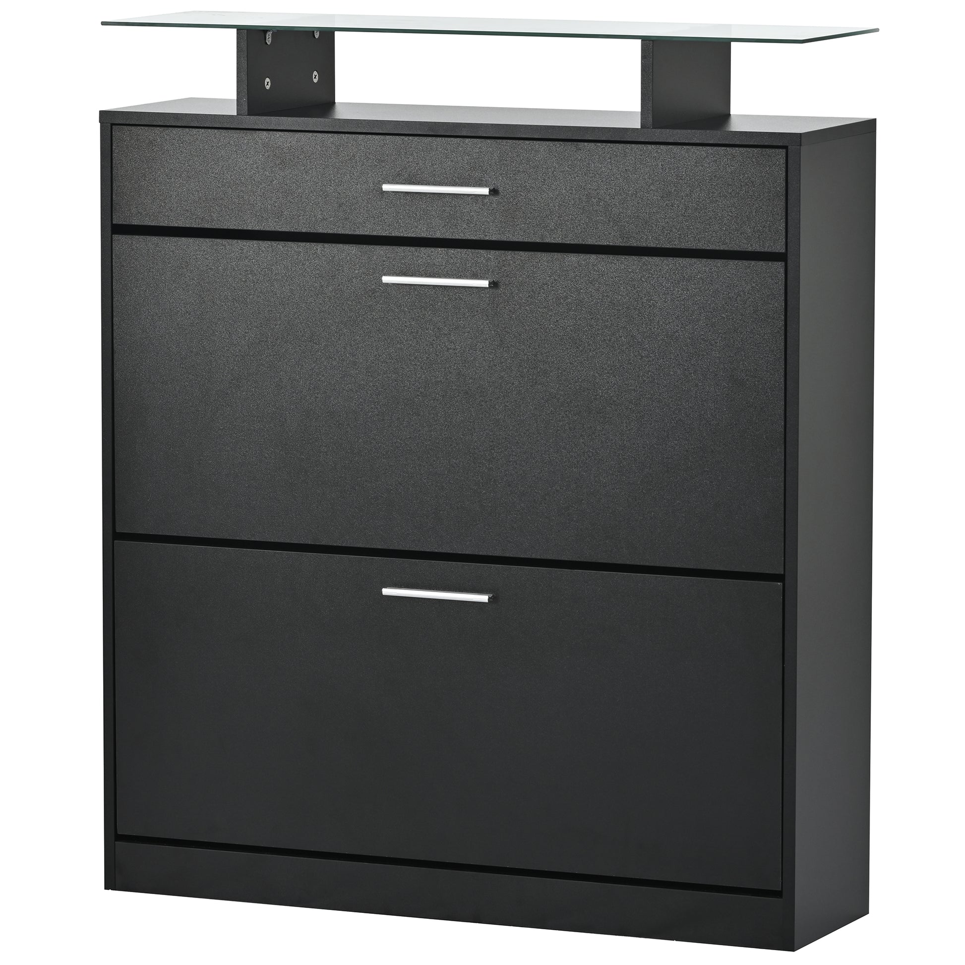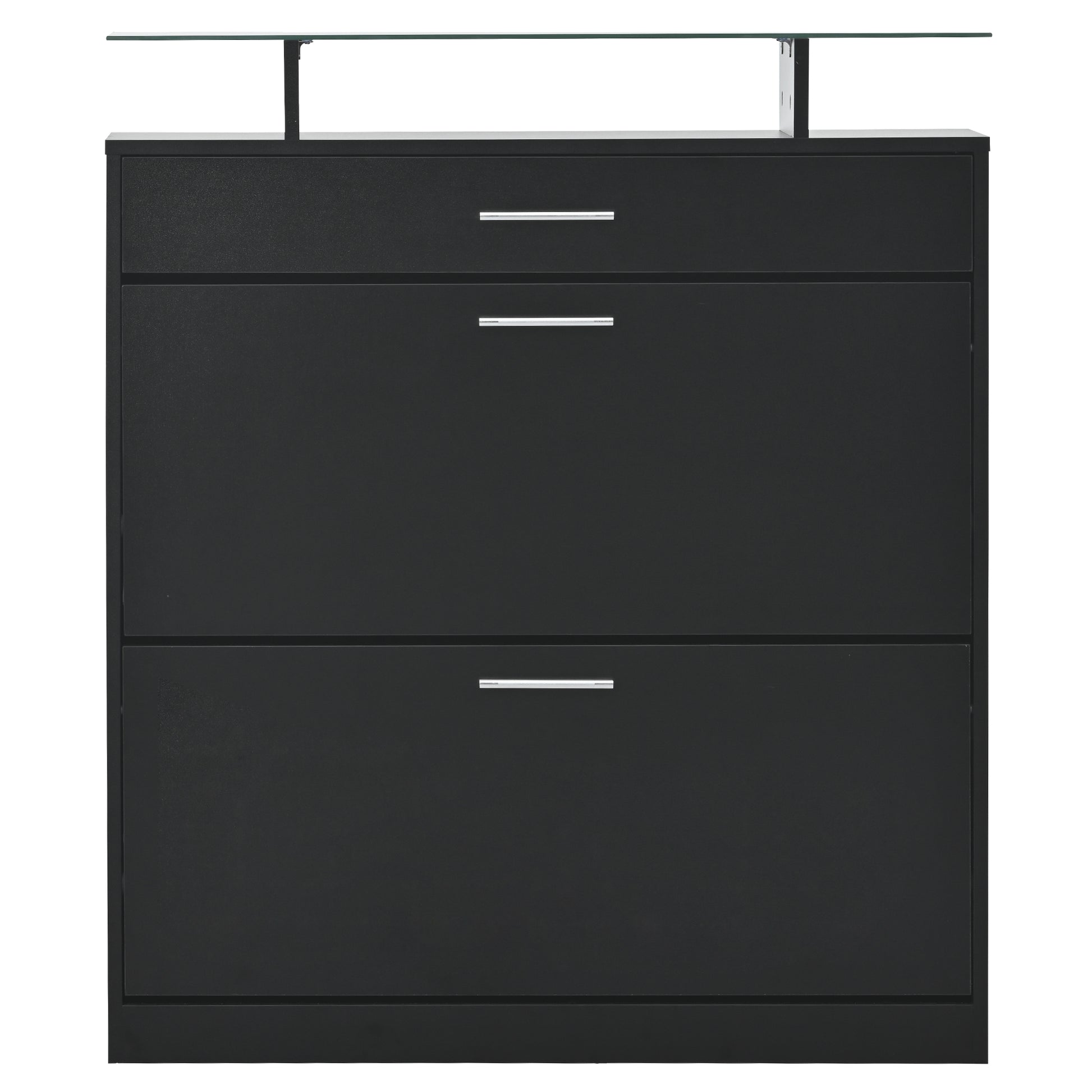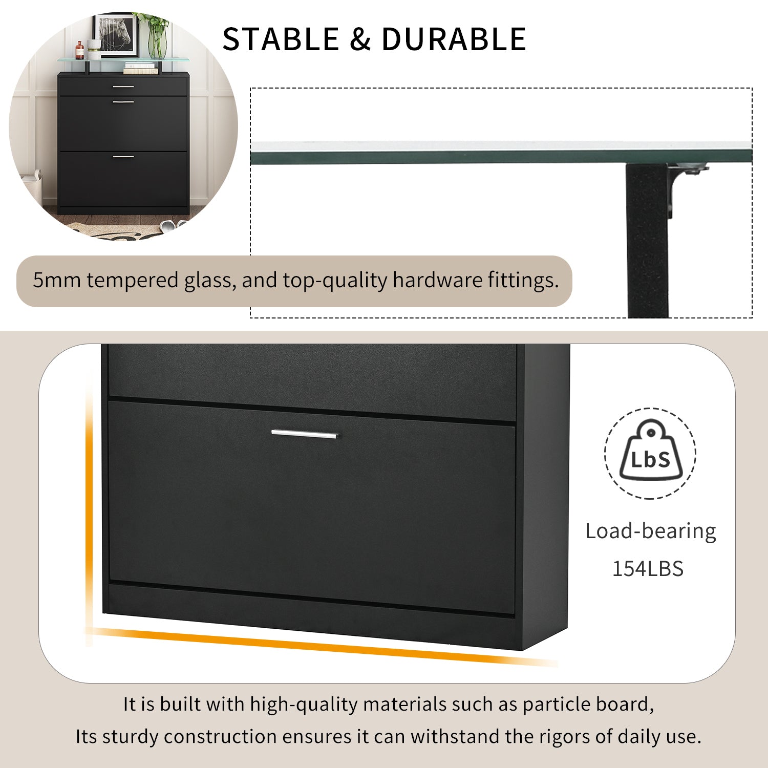 Slim Entryway Organizer With 2 Flip Drawers, Tempered Glass Top Shoe Storage Cabinet With Drawer, Free Standing Shoe Rack With Led Light For Hallway, Black Square 3 4 Drawers Black Primary Living Space Glass Shelves Modern Particle Board