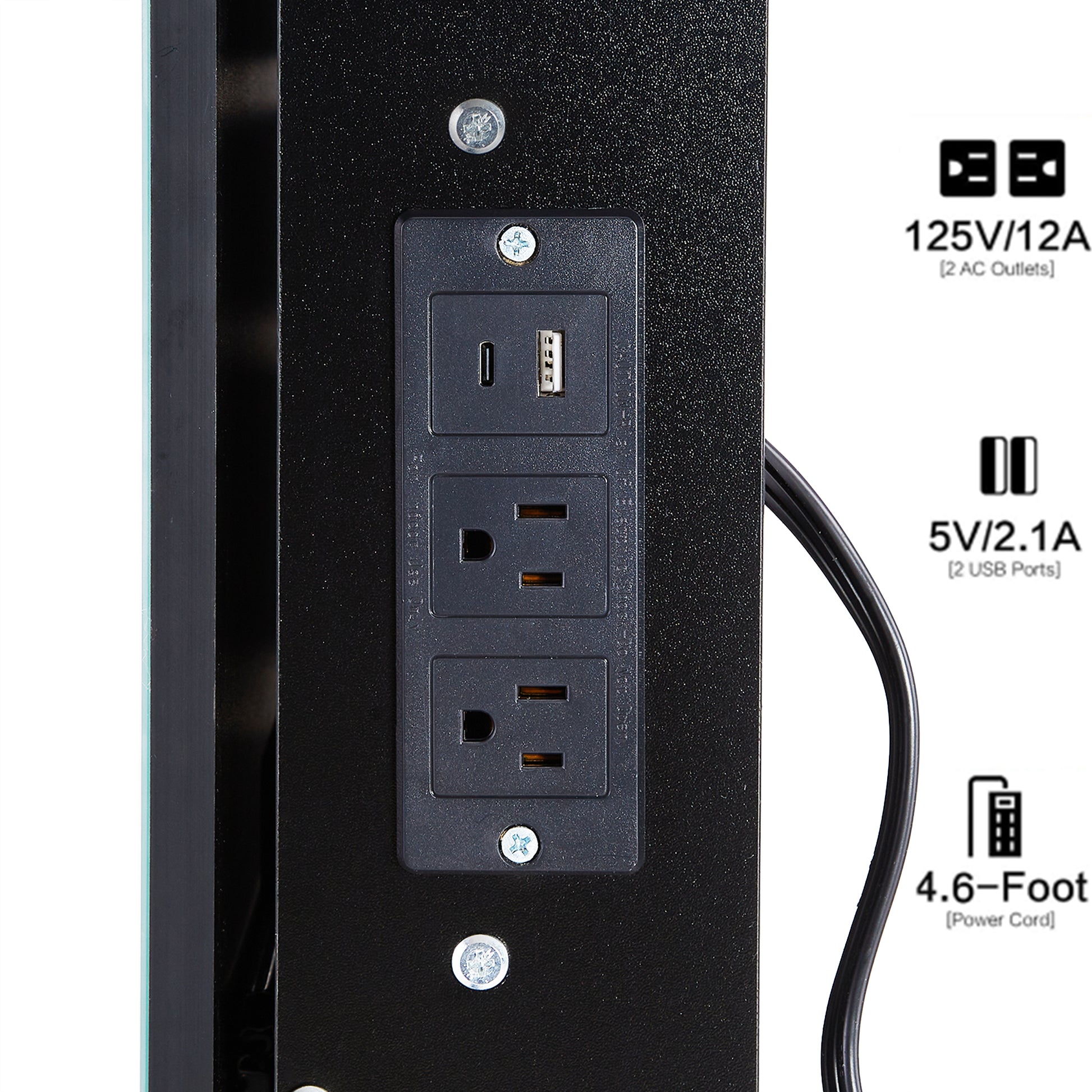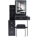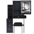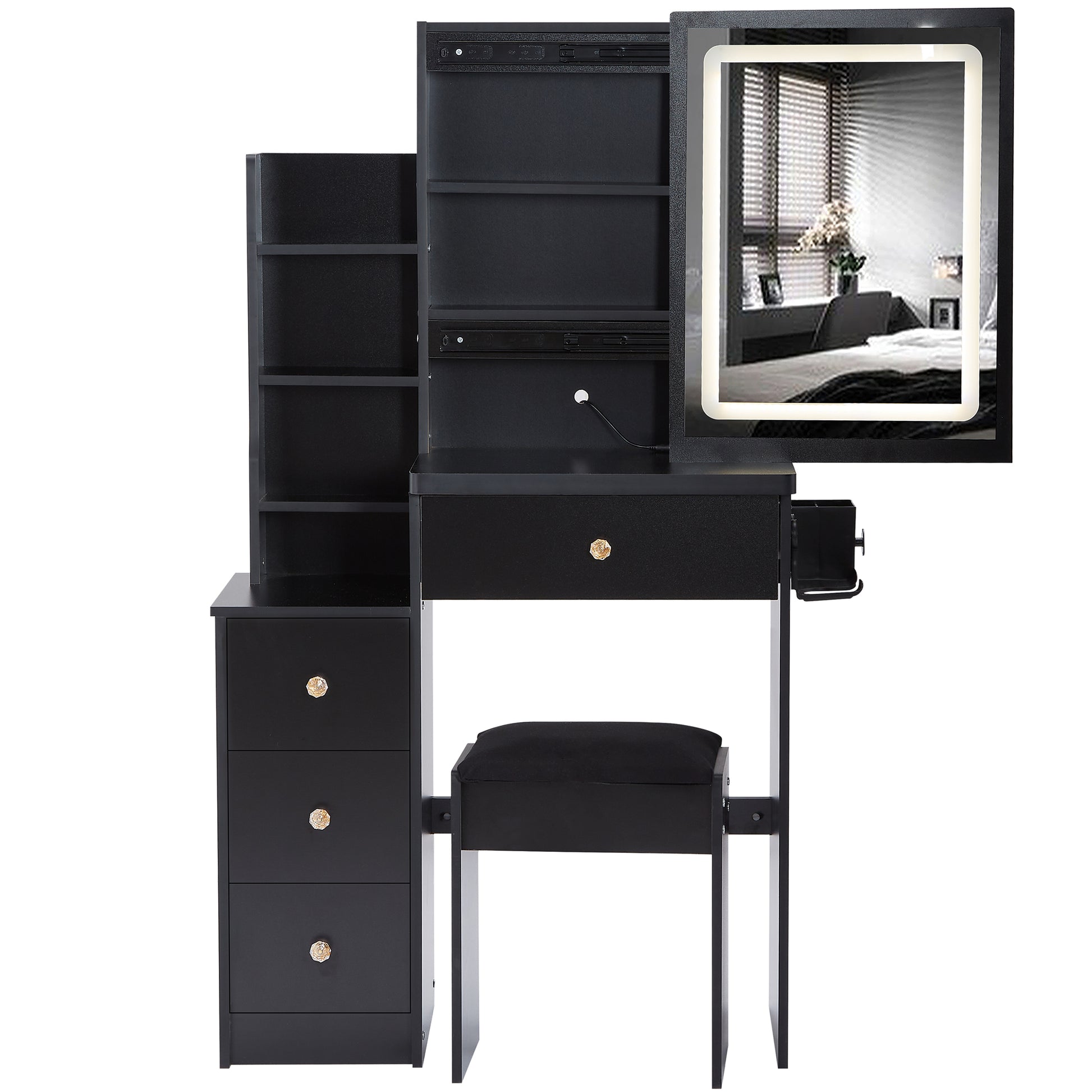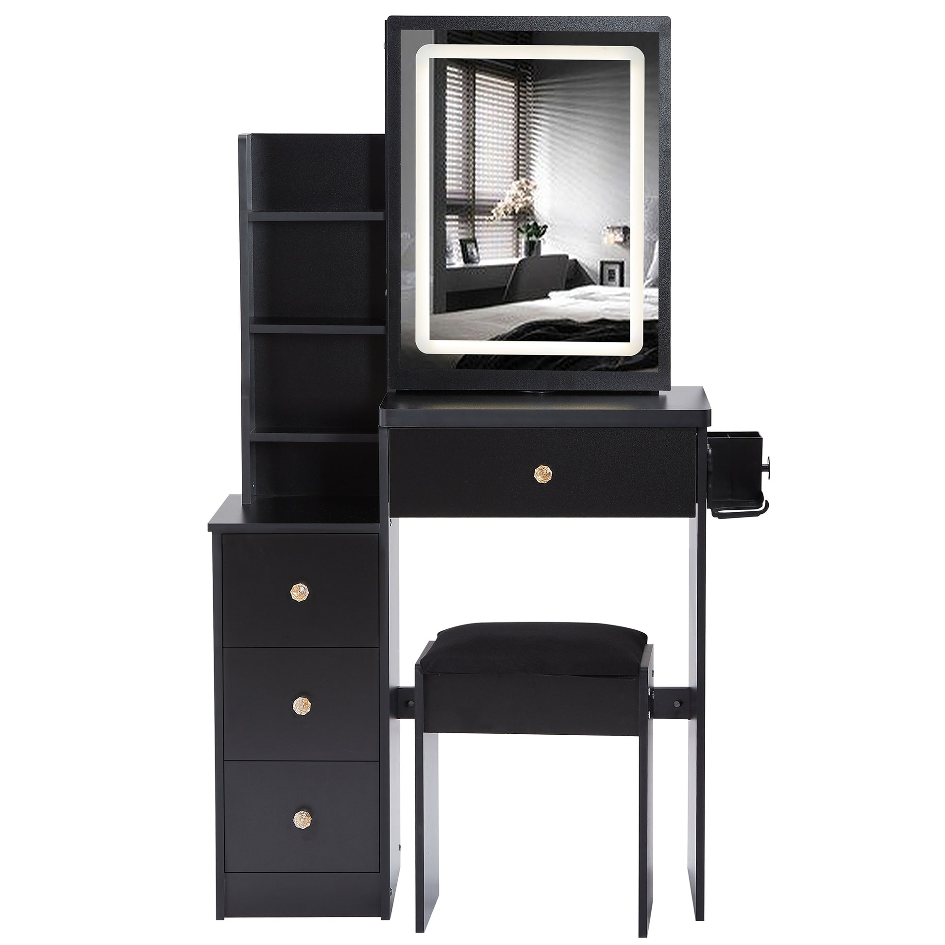 Small Size Left Bedside Cabinet Vanity Table Cushioned Stool, 2 Ac 2 Usb Power Station, Hair Dryer Bracket, Extra Large Touch Control Sliding Led Mirror, Tri Color Switching, Epa,Gcc,Ul Certificate
