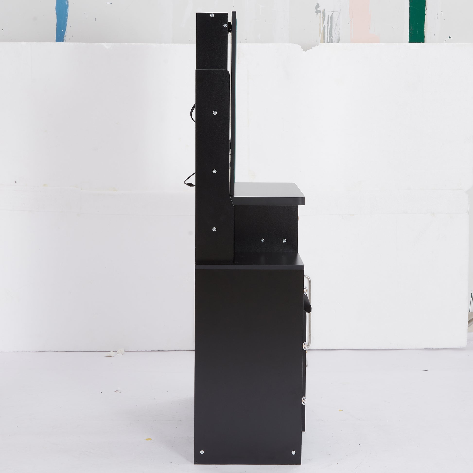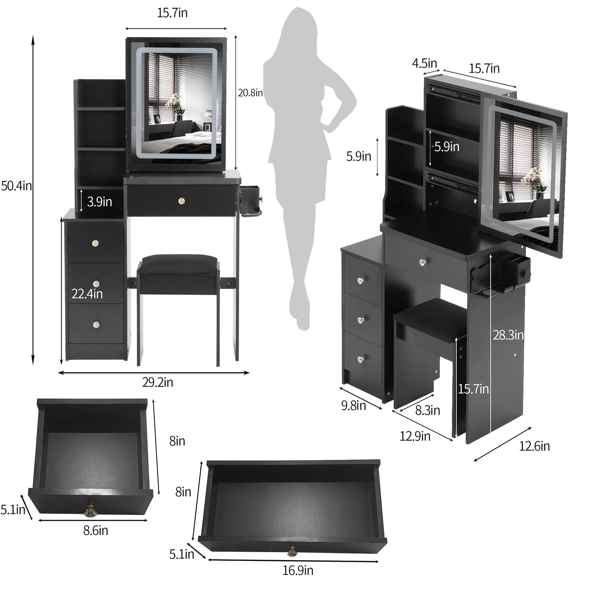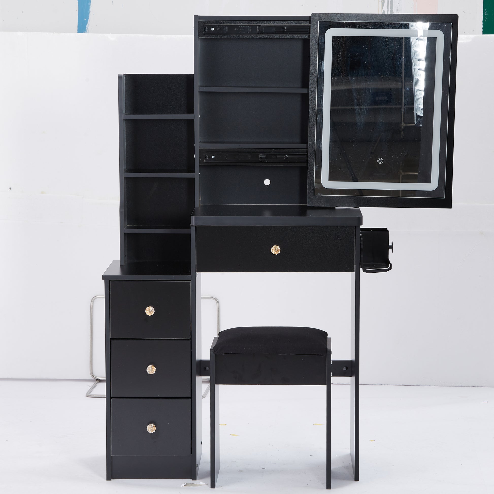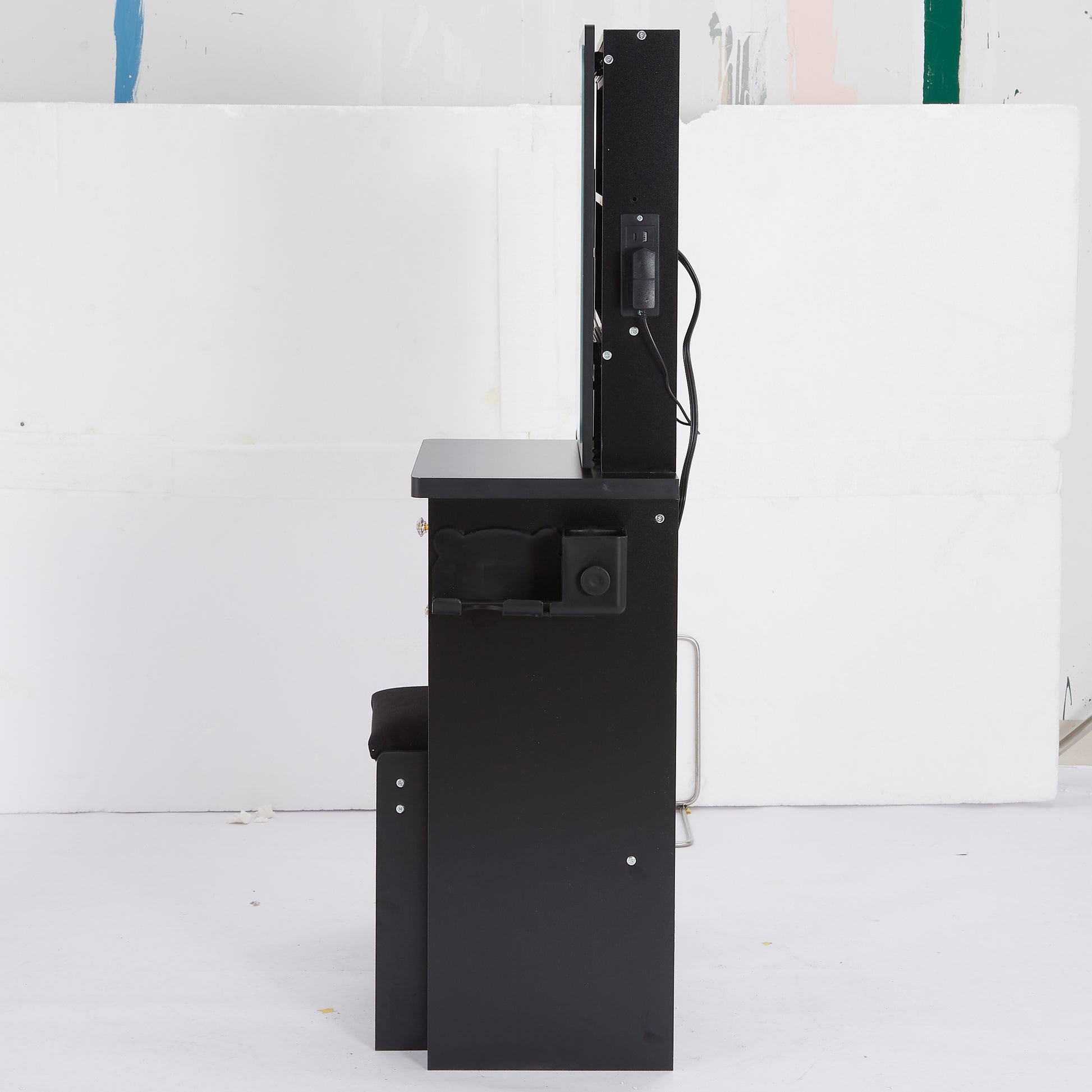 Small Size Left Bedside Cabinet Vanity Table Cushioned Stool, 2 Ac 2 Usb Power Station, Hair Dryer Bracket, Extra Large Touch Control Sliding Led Mirror, Tri Color Switching, Epa,Gcc,Ul Certificate