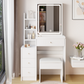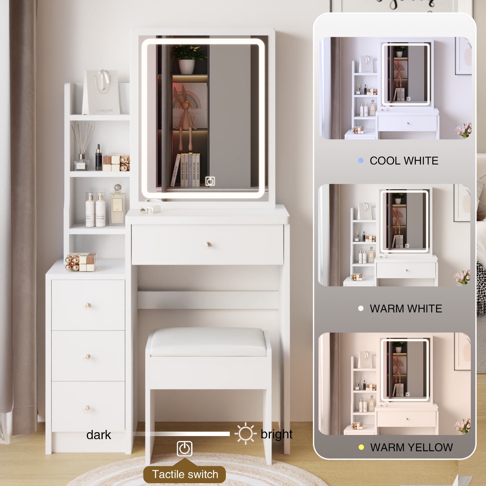Small Size Left Bedside Cabinet Vanity Table Cushioned Stool, Extra Large Touch Control Sliding Led Mirror, Tri Color Switching, Brightness Adjustable, Suitable For Girls No More Than 5.6Ft Tall White American Design Mdf