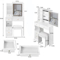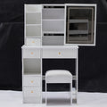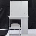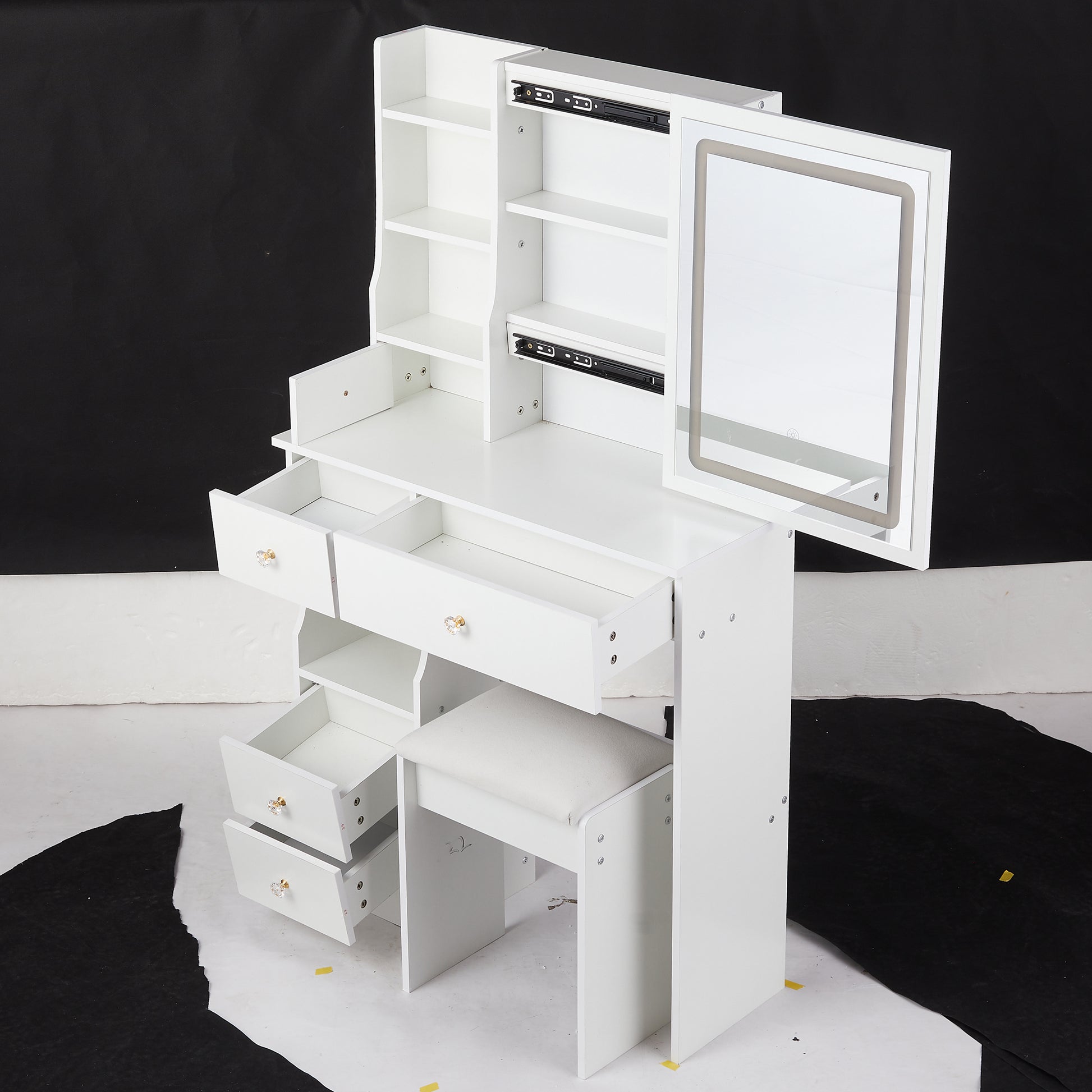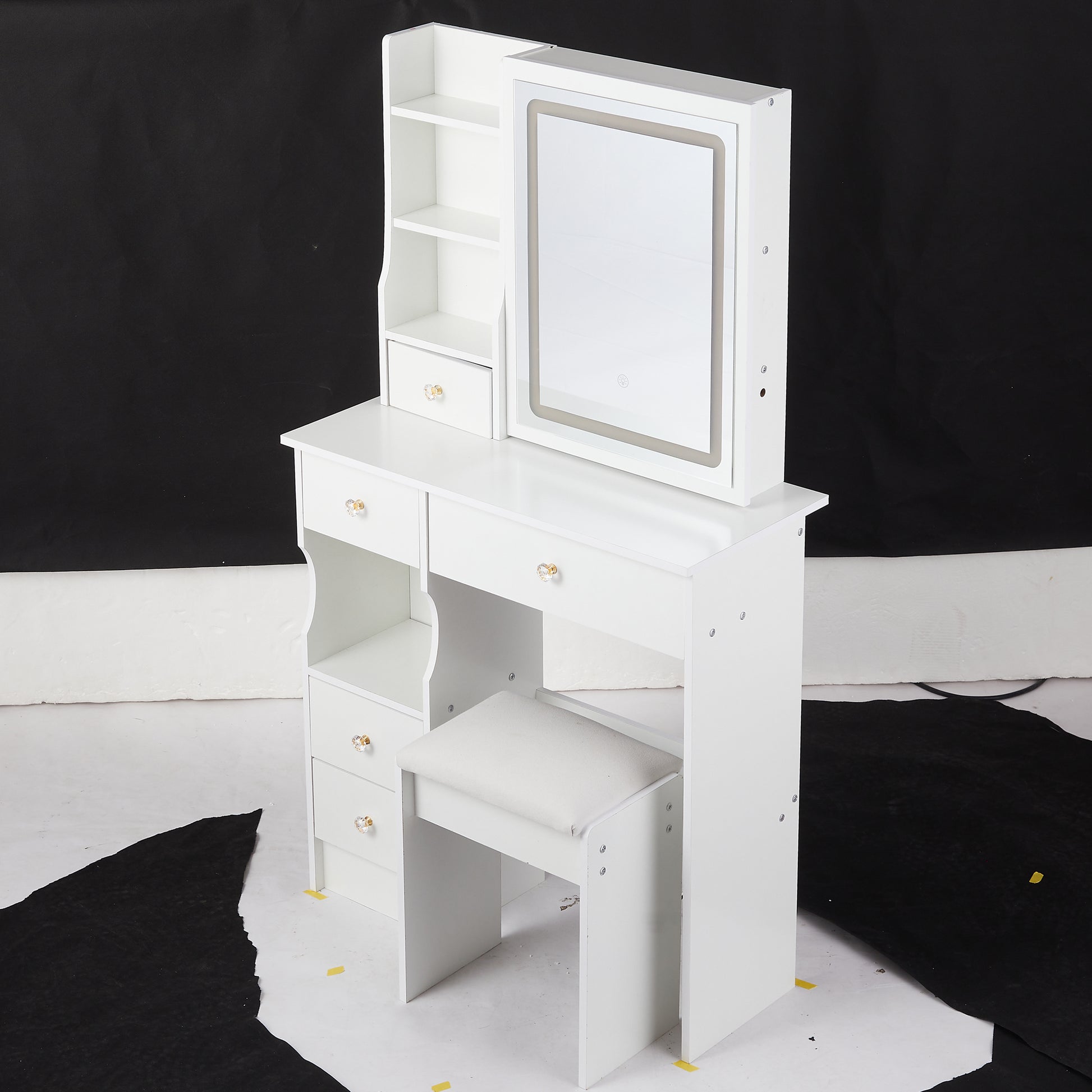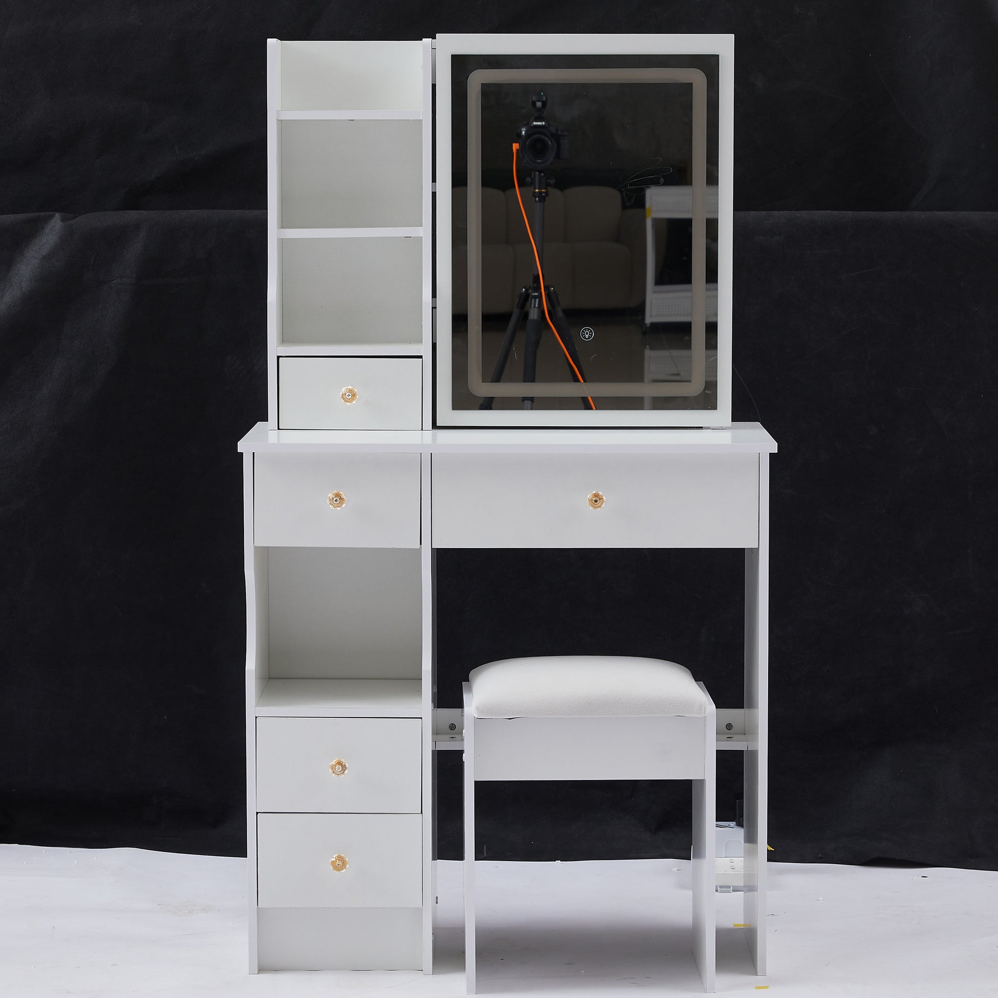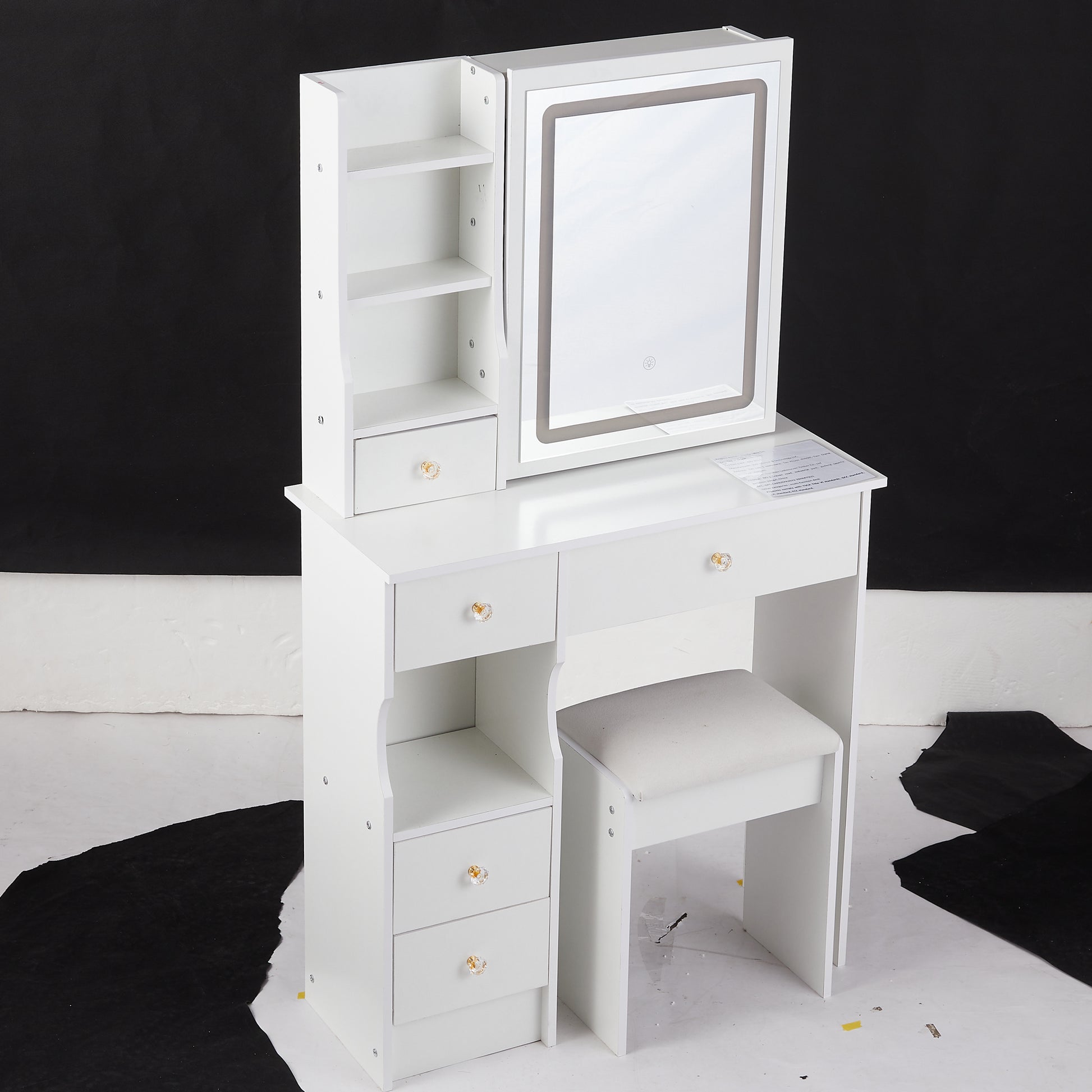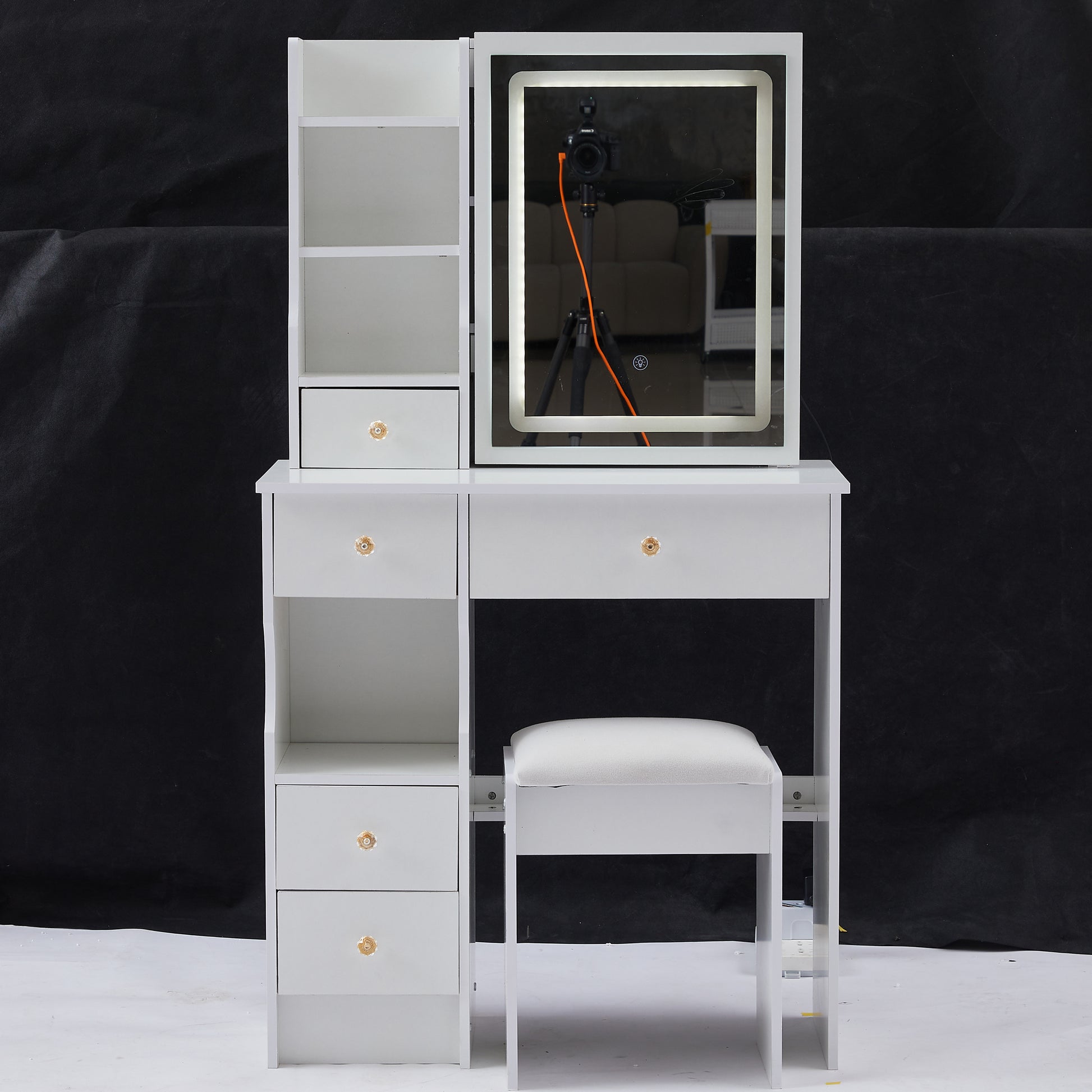 Small Size Left Drawer Desktop Vanity Table Cushioned Stool, Touch Control Sliding Led Mirror, Tri Color Switching, Brightness Adjust, Multi Layer, Suitable For Small Space, Epa,Gcc,Ul Certificate
