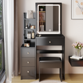 Small Space Left Bedside Cabinet Vanity Table Cushioned Stool, Extra Large Touch Control Sliding Led Mirror, Tri Color Switching, Brightness Adjustable, Suitable For Girls No More Than 5.6Ft Tall Black American Design Mdf
