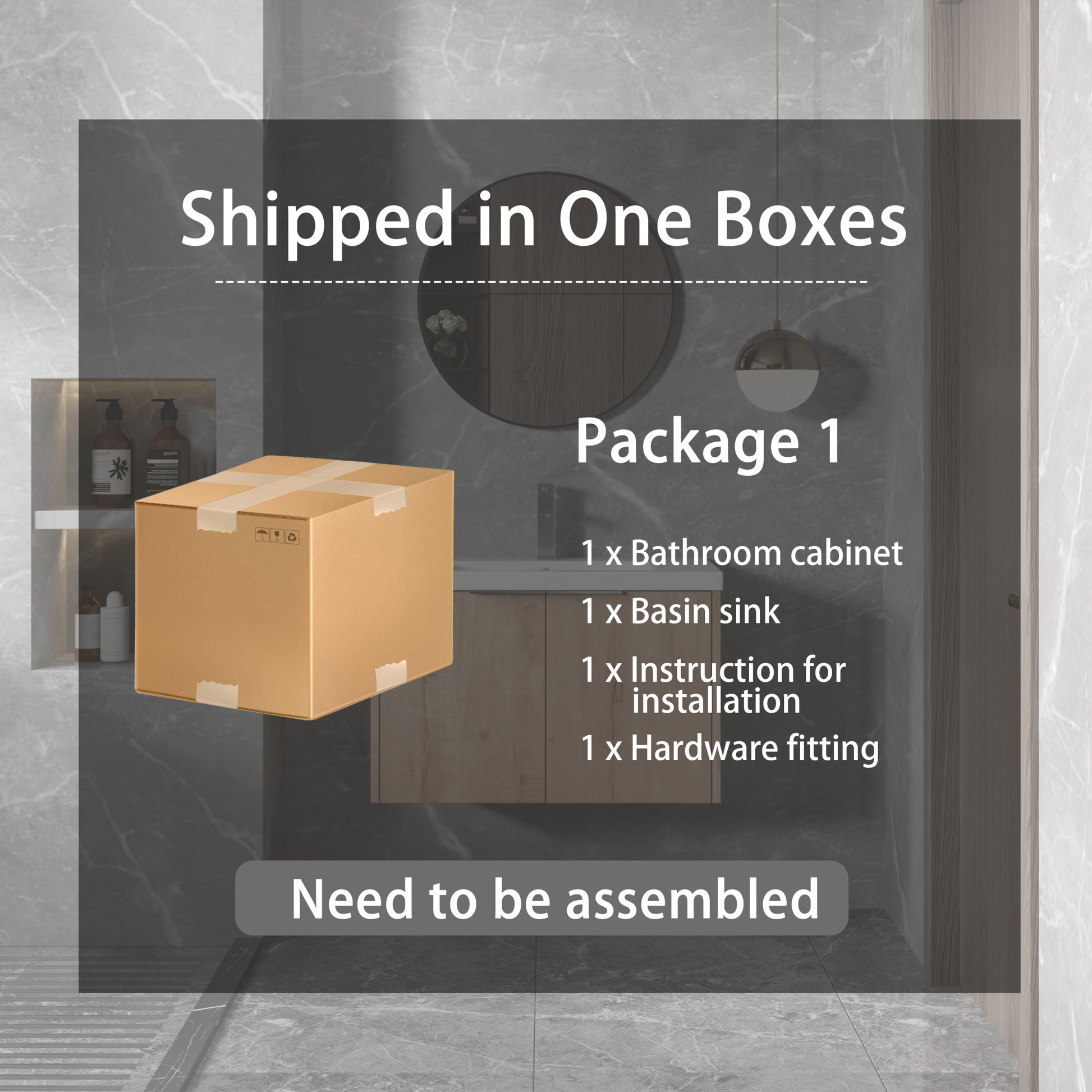 | Package includes: | - 1x Vanity Cabinet;- 1x Resin Sink; - 2x Metal Handle; Parts Package |
