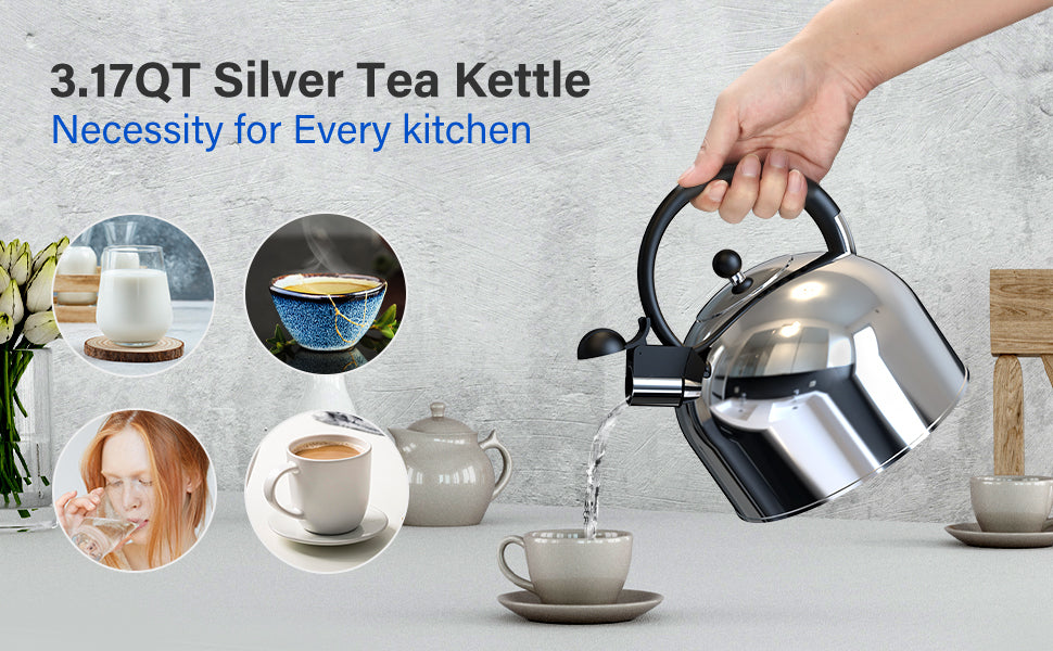 Stainless Steel Whistling Tea Kettle, 3.17 Quart, Teapot For Stove Top With Wide Mouth, Easy Pouring Spout And Ergonomic Handle, Silver Silver Stainless Steel