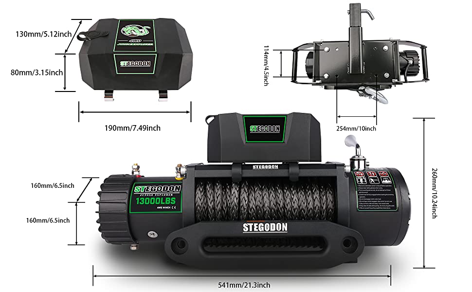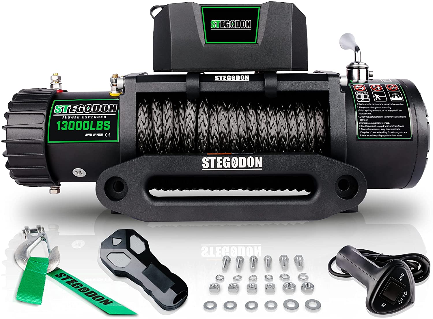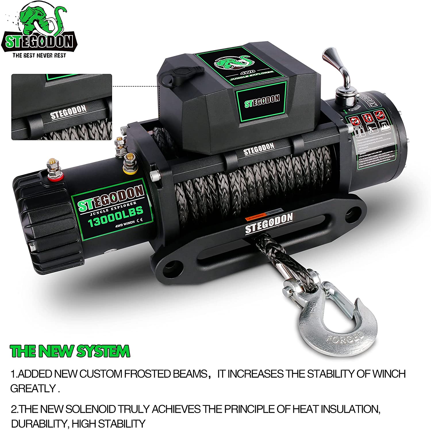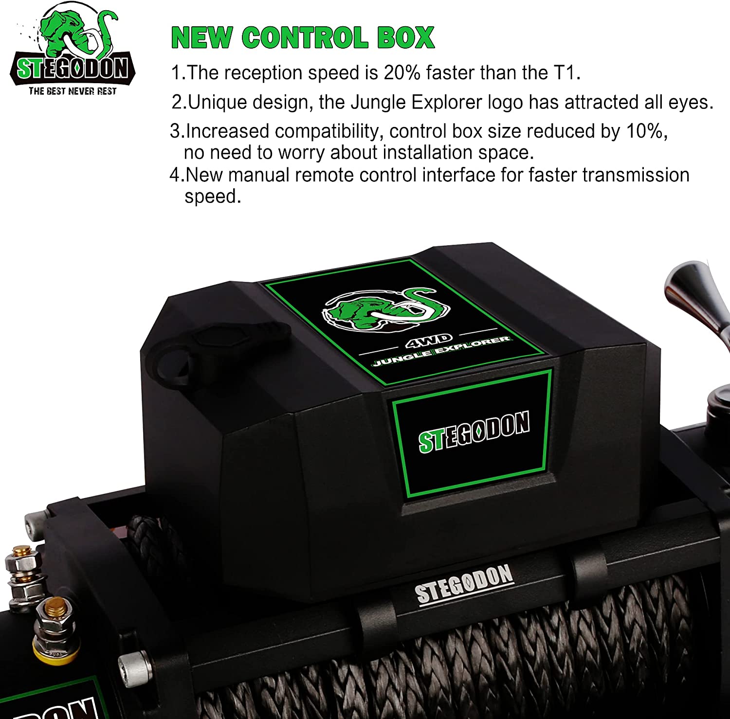 Stegodon 13000 Lbs Electric Winch T3,12V Synthetic Rope With Wireless Handheld Remotes And Wired Handle Black Aluminium