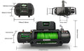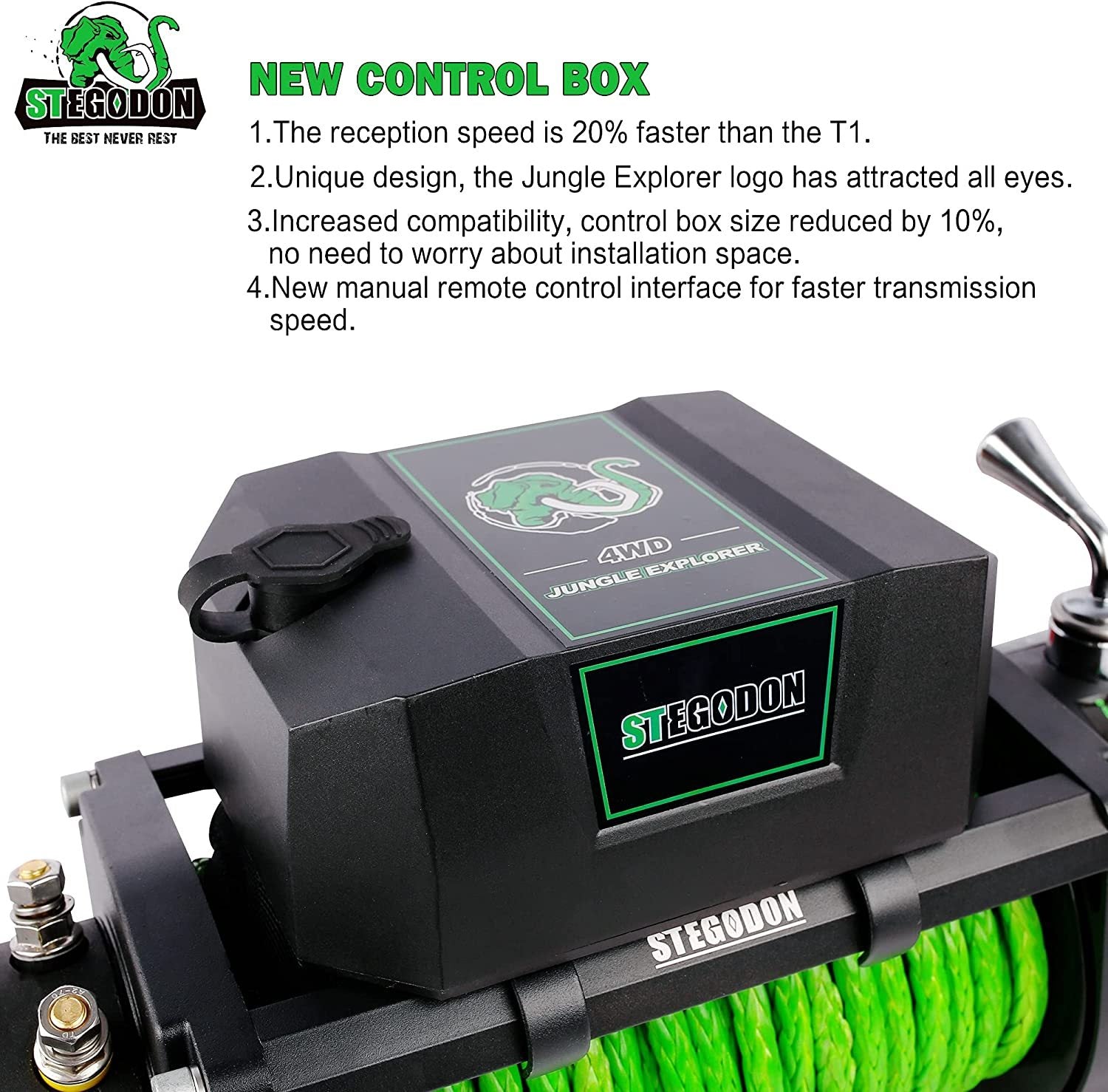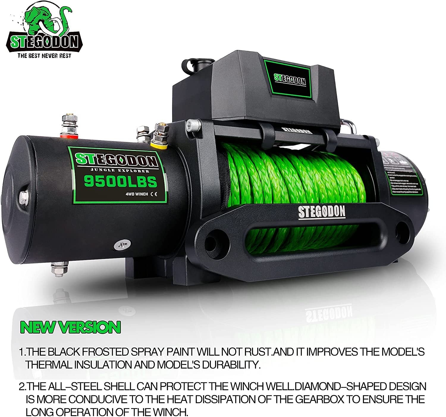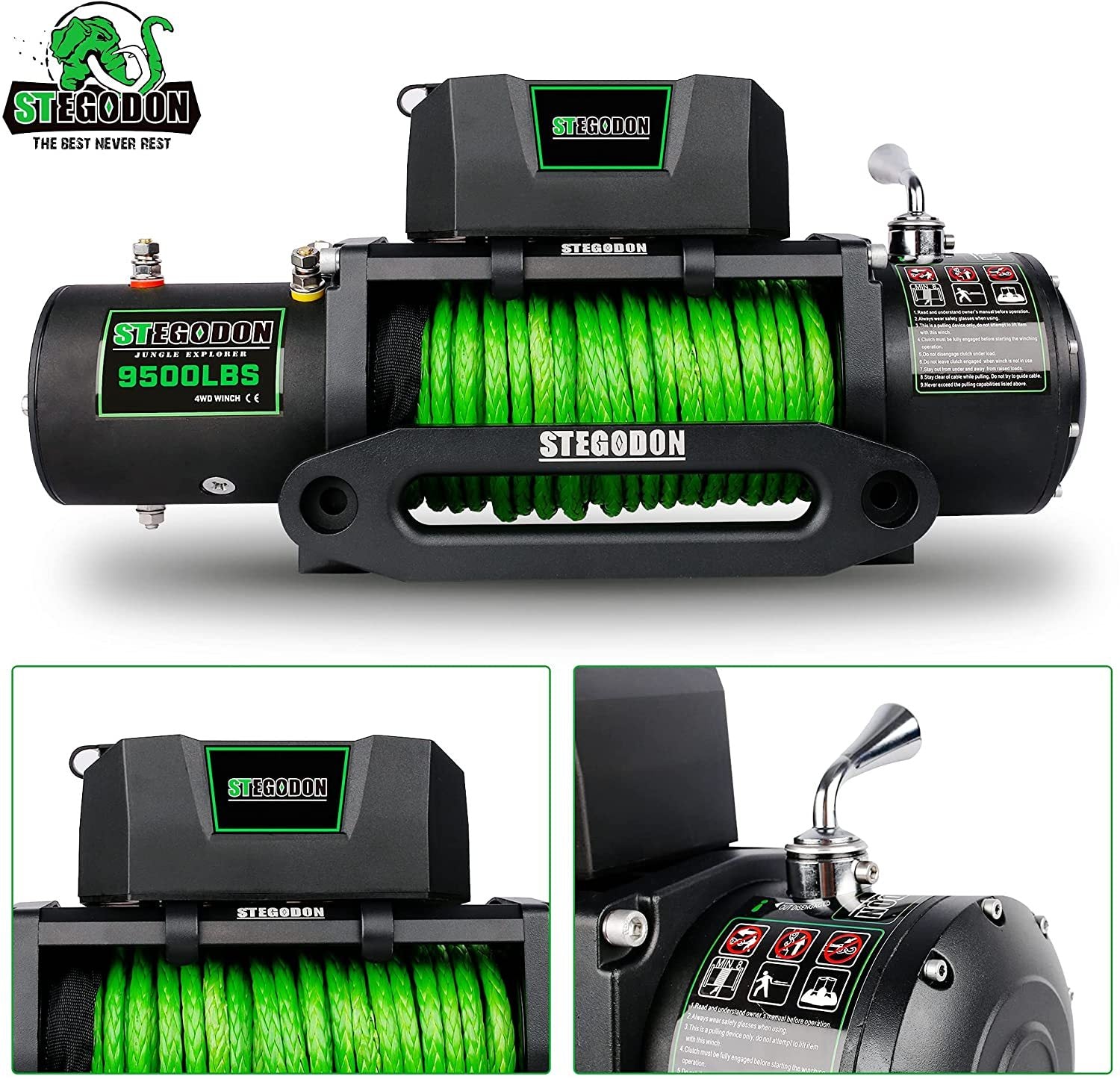Stegodon 9500 Lb. Load Capacity Electric Winch S3,12V Waterproof Ip67 Electric Winch With Hawse Fairlead, Synthetic Rope Winch With Wireless Handheld Remote And Wired Handle Green Rope Black Aluminium