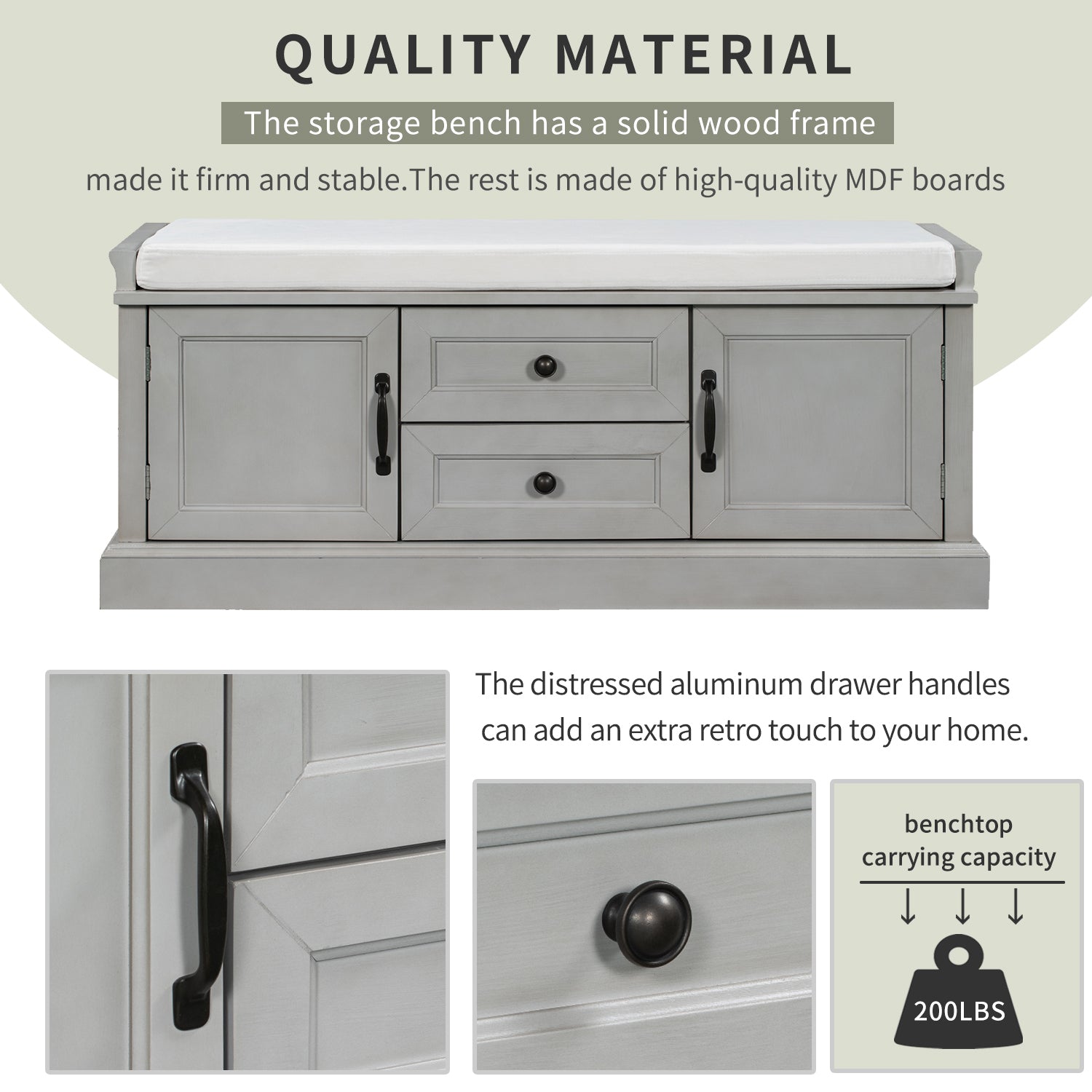 Storage Bench With 2 Drawers And 2 Cabinets, Shoe Bench With Removable Cushion For Living Room, Entryway Gray Wash Gray Wash Solid Wood