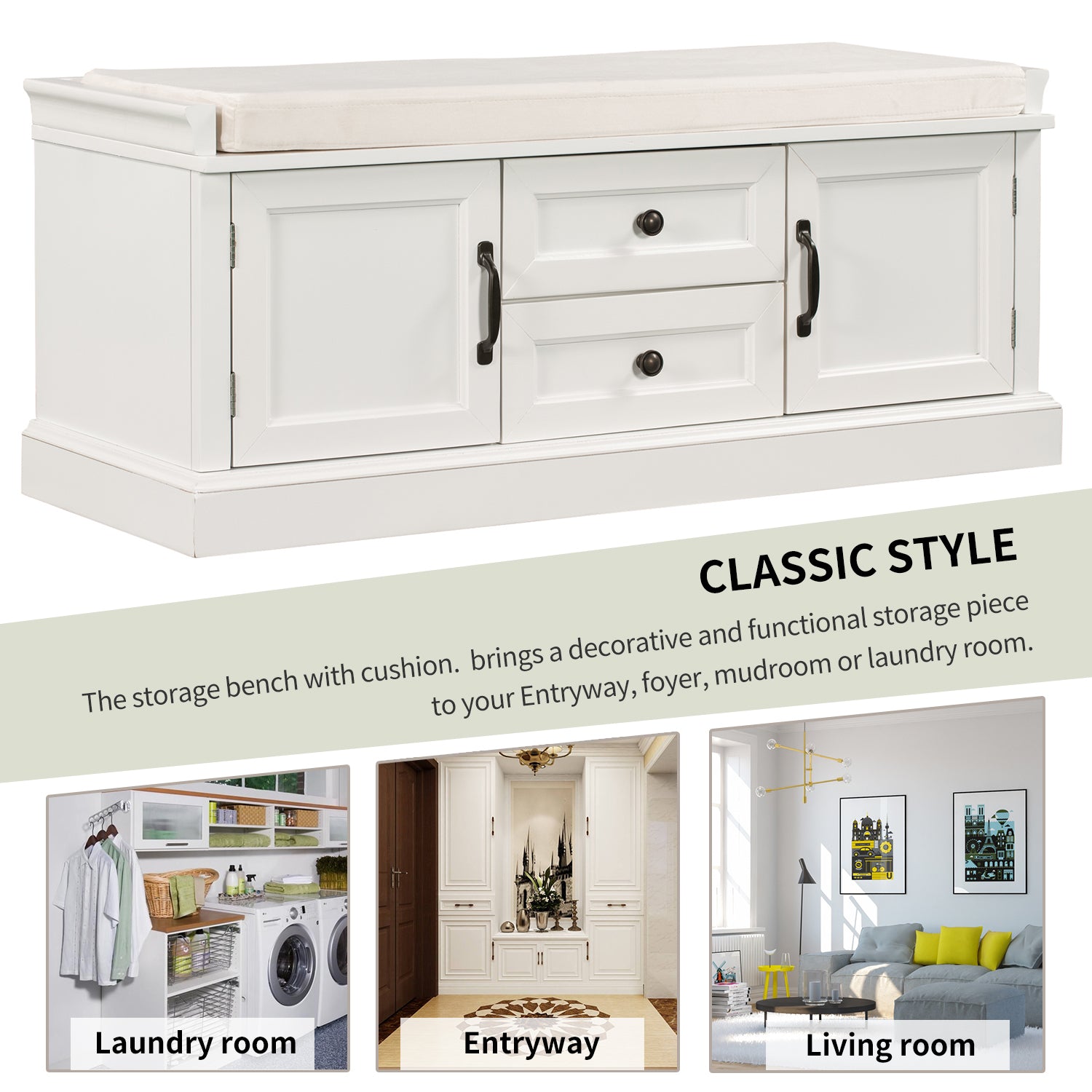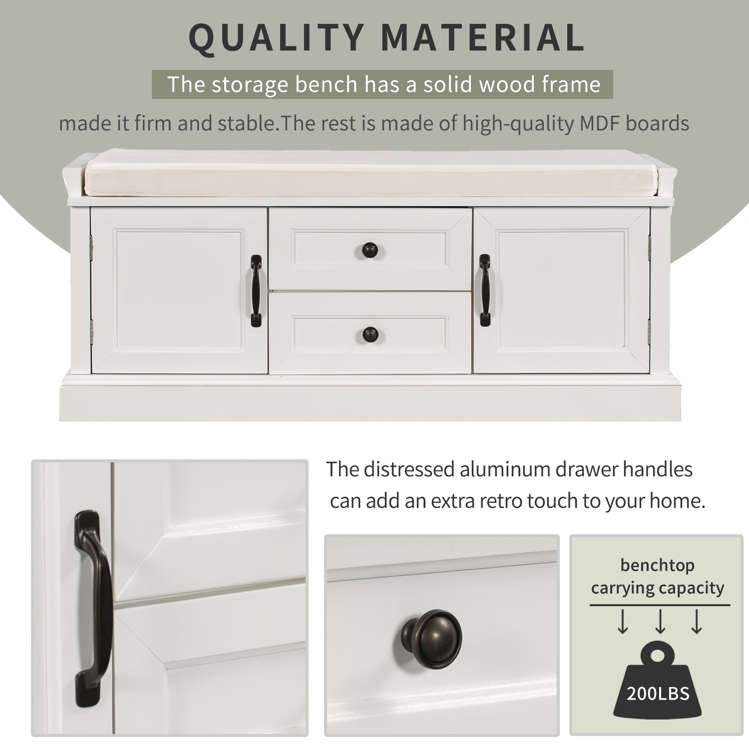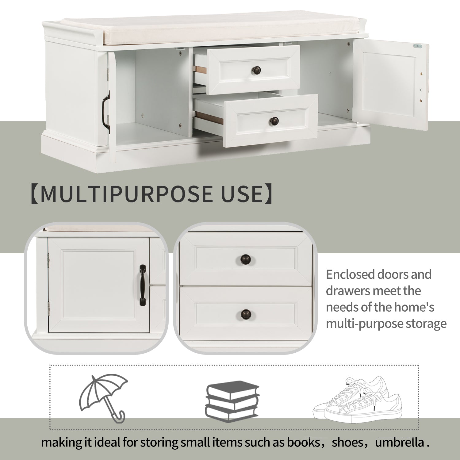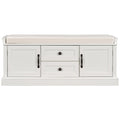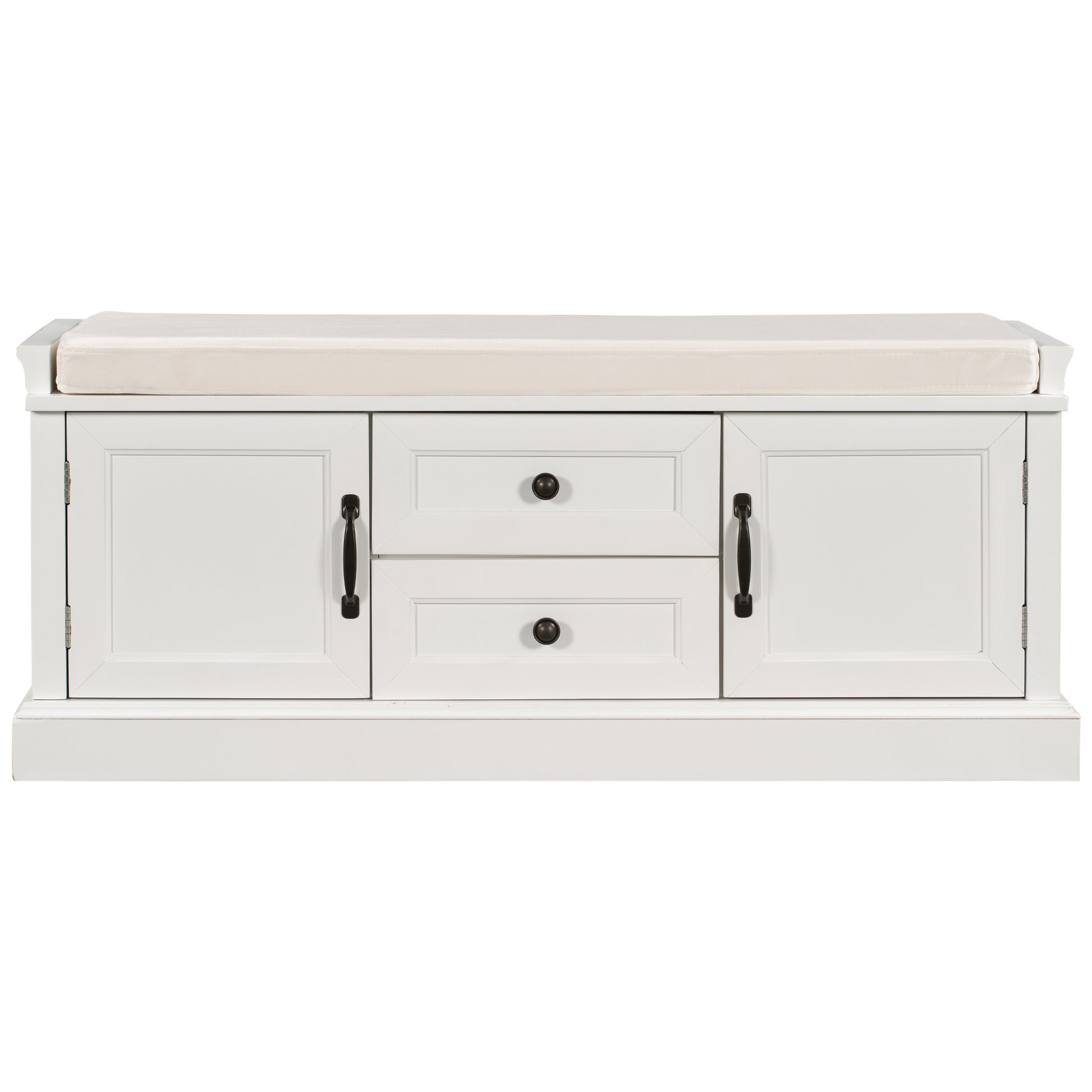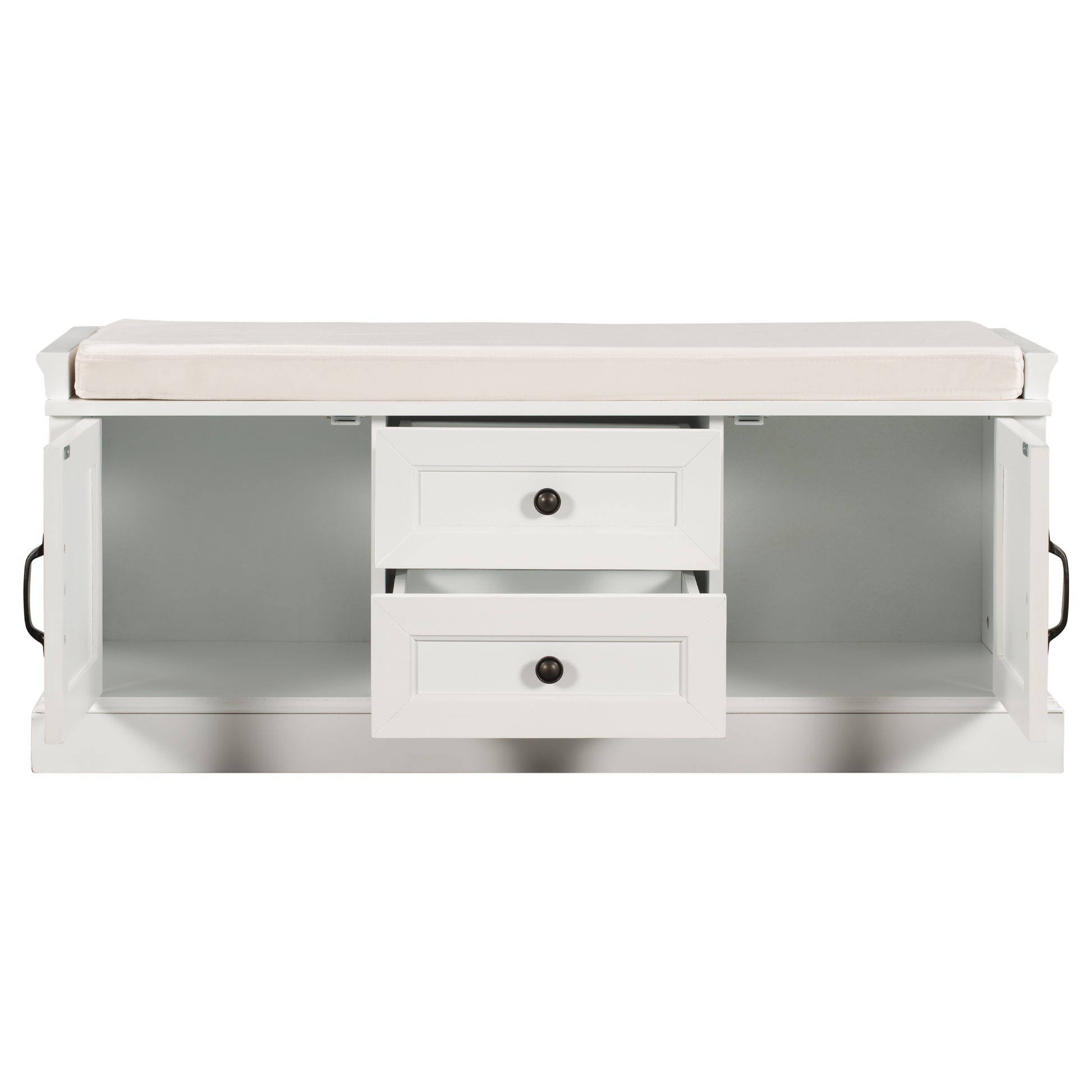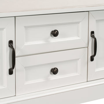 Storage Bench With 2 Drawers And 2 Cabinets, Shoe Bench With Removable Cushion For Living Room, Entryway White White Solid Wood