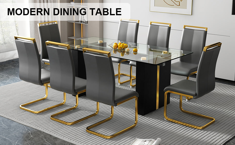 Table And Chair Set, Large Modern Minimalist Rectangular Glass Table, Can Accommodate 6 8 People, Equipped With Tempered Glass Tabletop And Large Mdf Table Legs, Comfortable And Minimalist Chairs. Transparent Mdf Glass