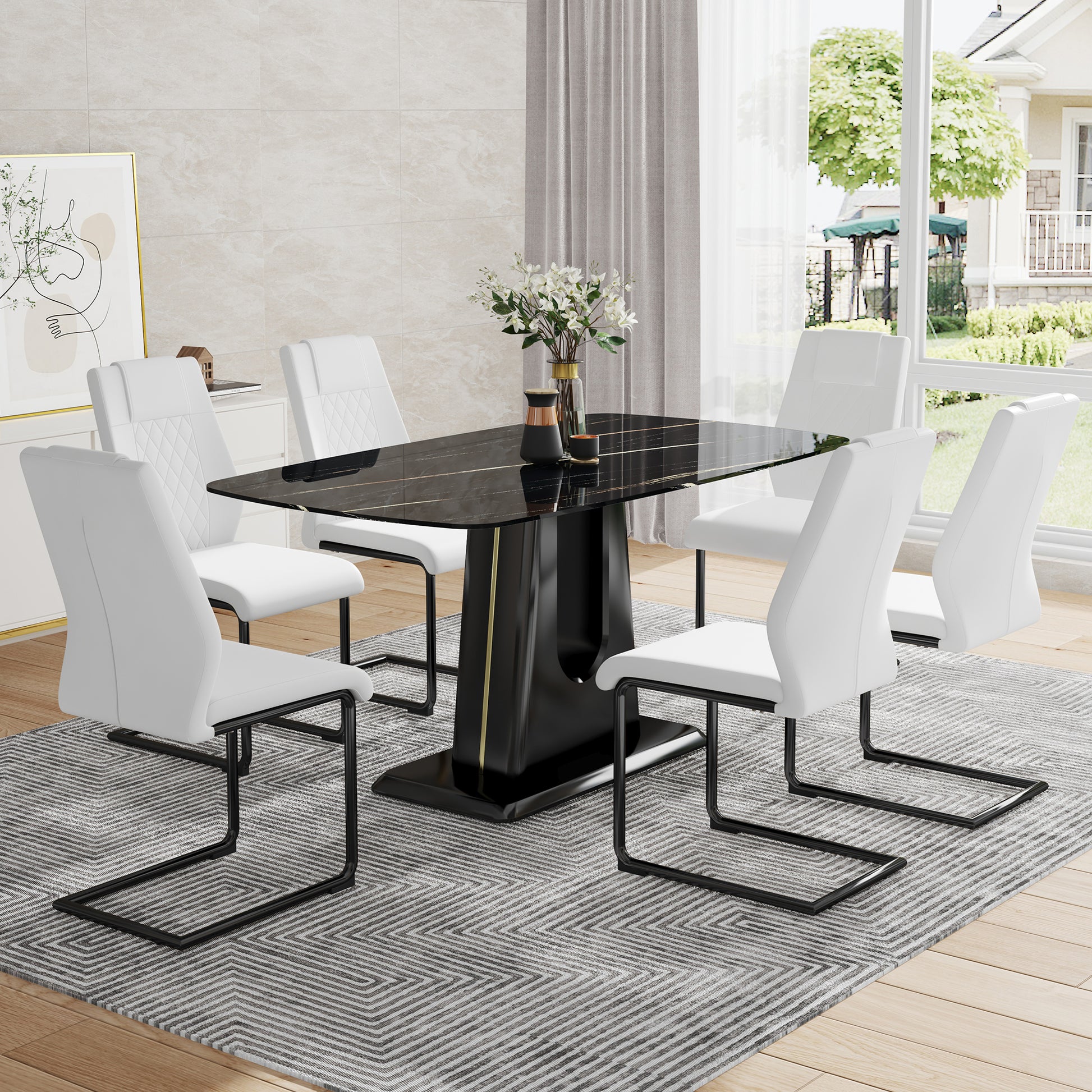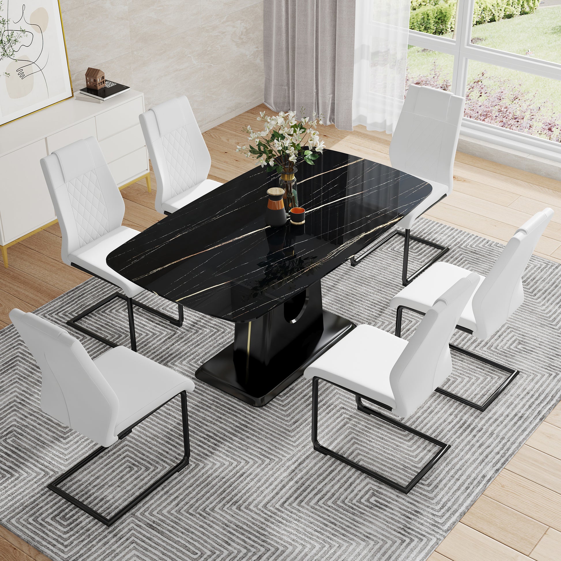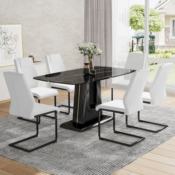 Table And Chair Set, Minimalist Dining Table, Imitation Marble Patterned Glass Tabletop, Mdf Legs With U Shaped Brackets. Paired With Comfortable Chairs, Suitable For Dining And Living Rooms. Black Mdf Glass