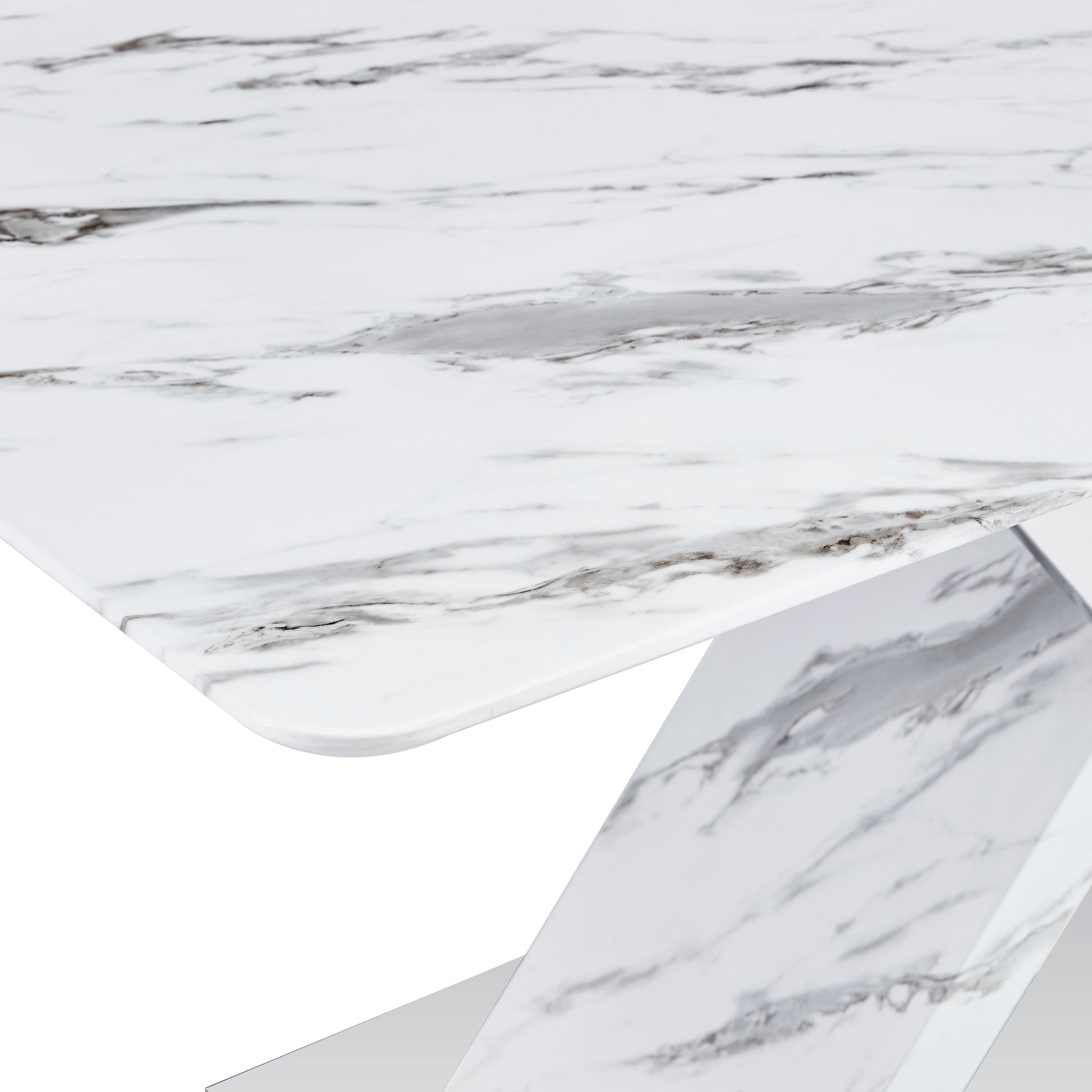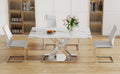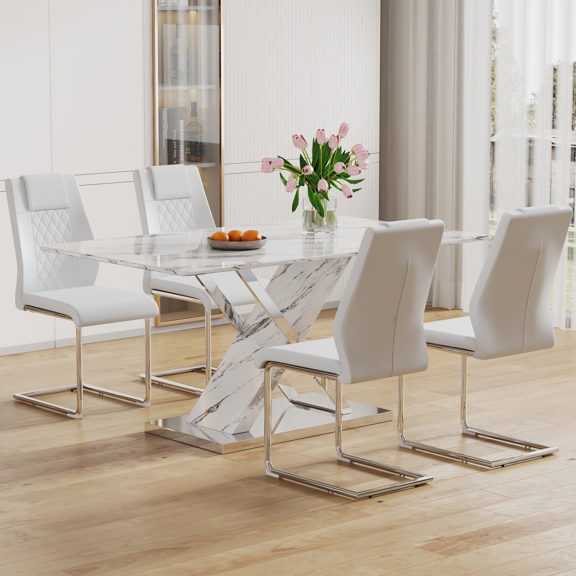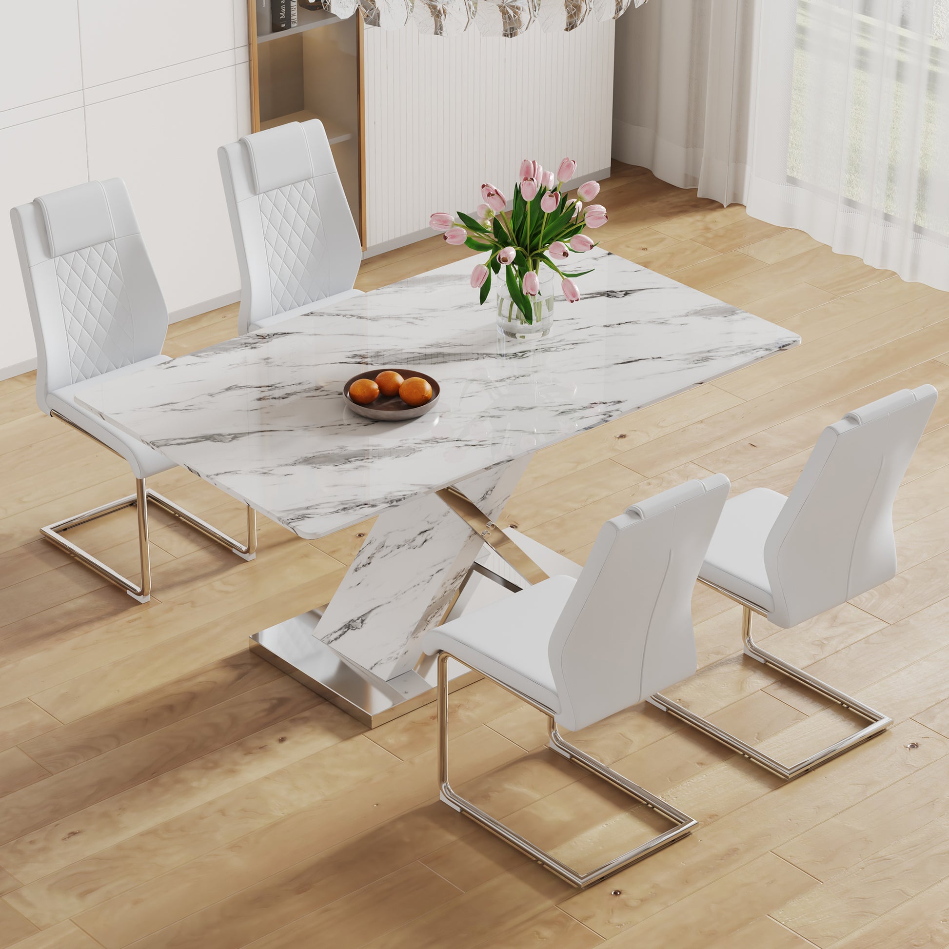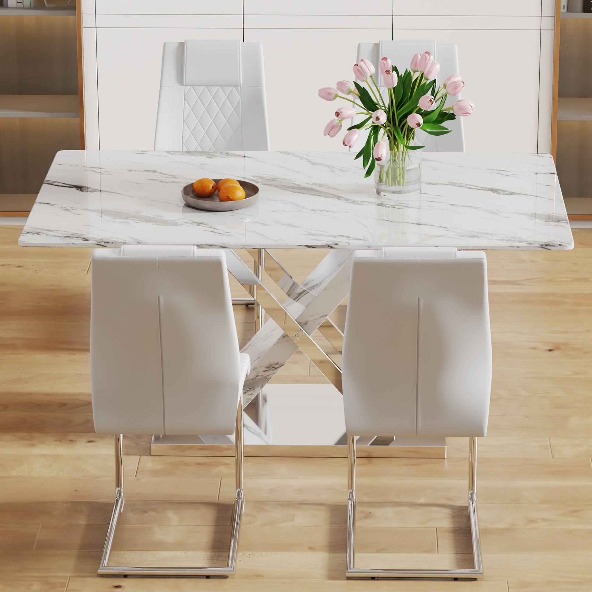 Table And Chair Set, Modern Dining Table, Imitation Marble White Top And Silver Legs, Soft And Comfortable Dining Chair, Perfect For Dinner, Meetings, Home And Office Decor White Silver Glass Metal