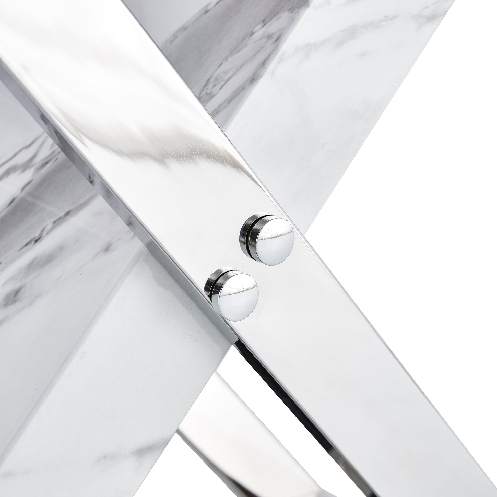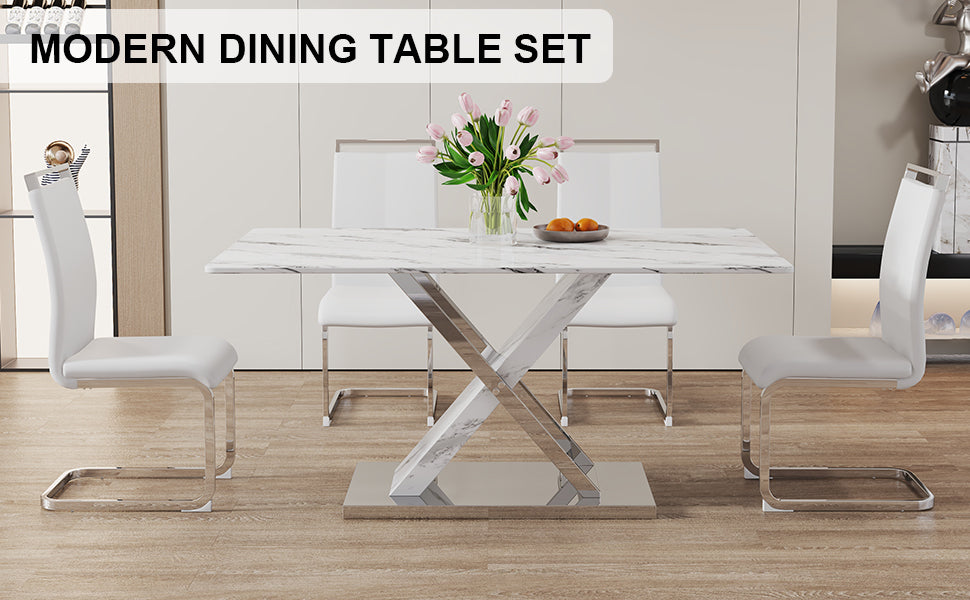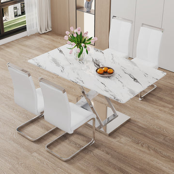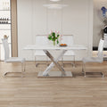 Table And Chair Set, Modern Dining Table, Imitation Marble White Top And Silver Legs, Soft And Comfortable Dining Chair, Perfect For Dinner, Meetings, Home And Office Decor White Silver Glass Metal