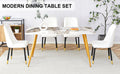 Table And Chair Set.Modern Minimalist Dining Table. White Imitation Marble Pattern Sintered Stone Desktop With Golden Metal Legs.Paried With 4 Comfortable Chairs With Pu Seats And Black Metal Legs.