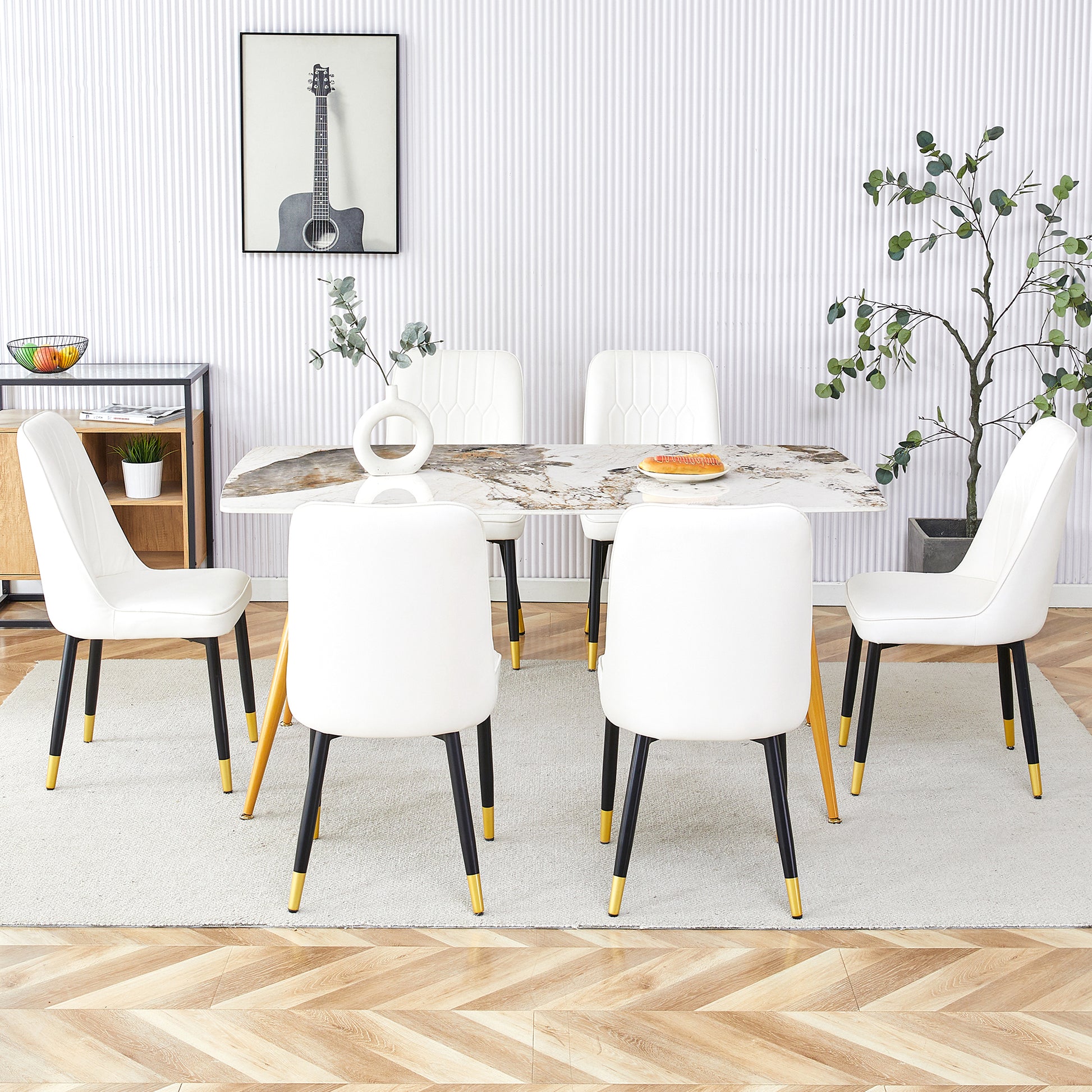 Table And Chair Set.Modern Minimalist Dining Table. White Imitation Marble Pattern Sintered Stone Desktop With Golden Metal Legs.Paried With 6 Comfortable Chairs With Pu Seats And Black Metal Legs.