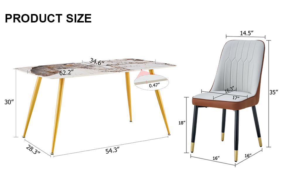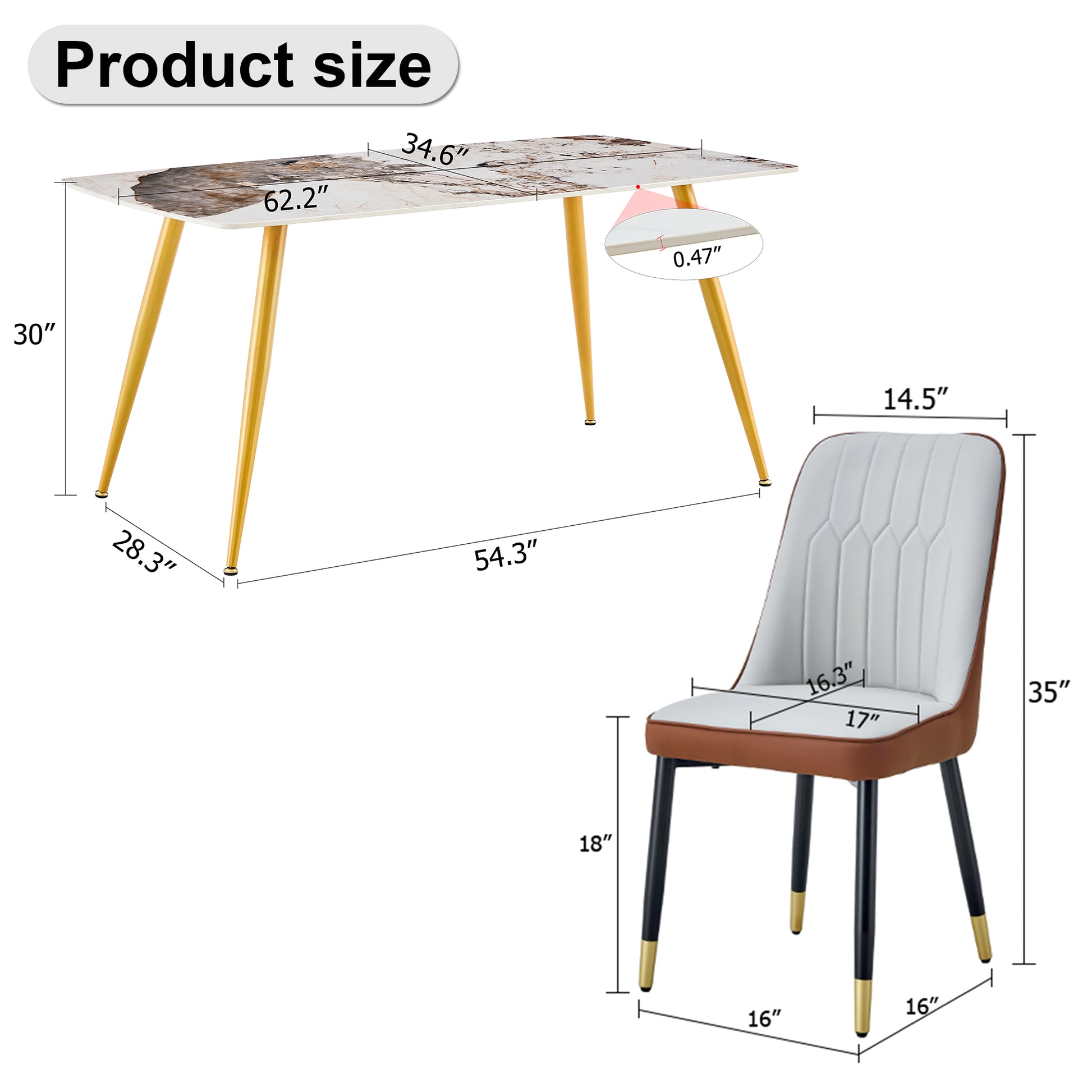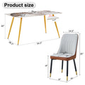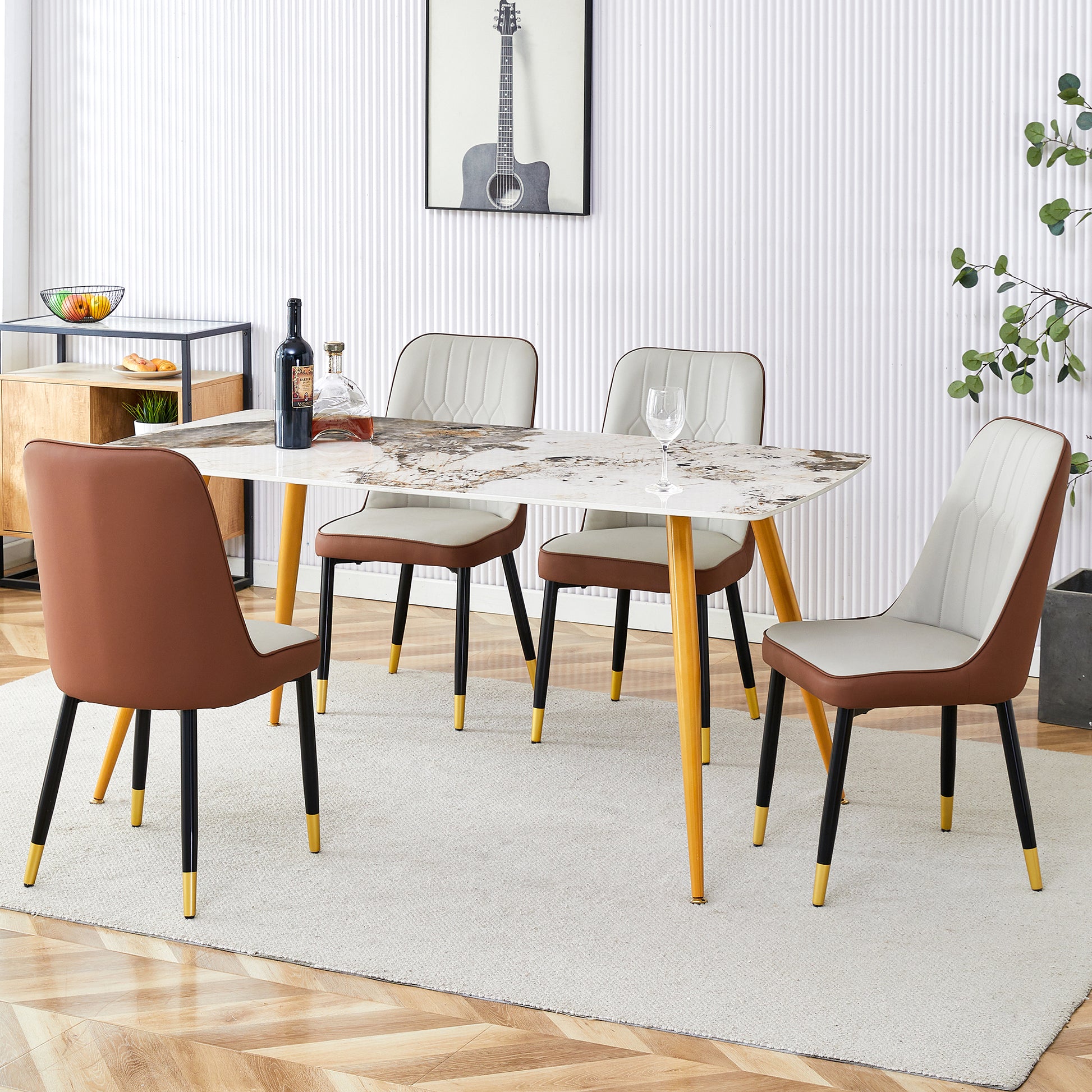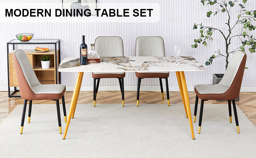 Table And Chair Set.Modern Minimalist Dining Table. White Imitation Marble Pattern Sintered Stone Desktop With Golden Metal Legs.Paried With 4 Comfortable Chairs With Pu Seats And Black Metal Legs.