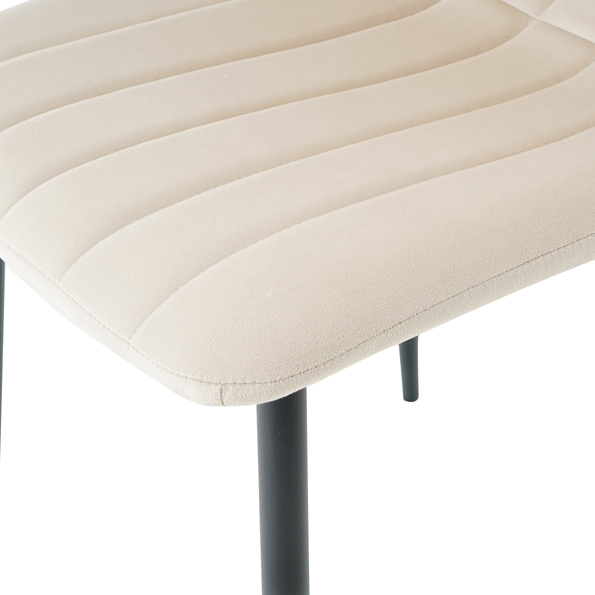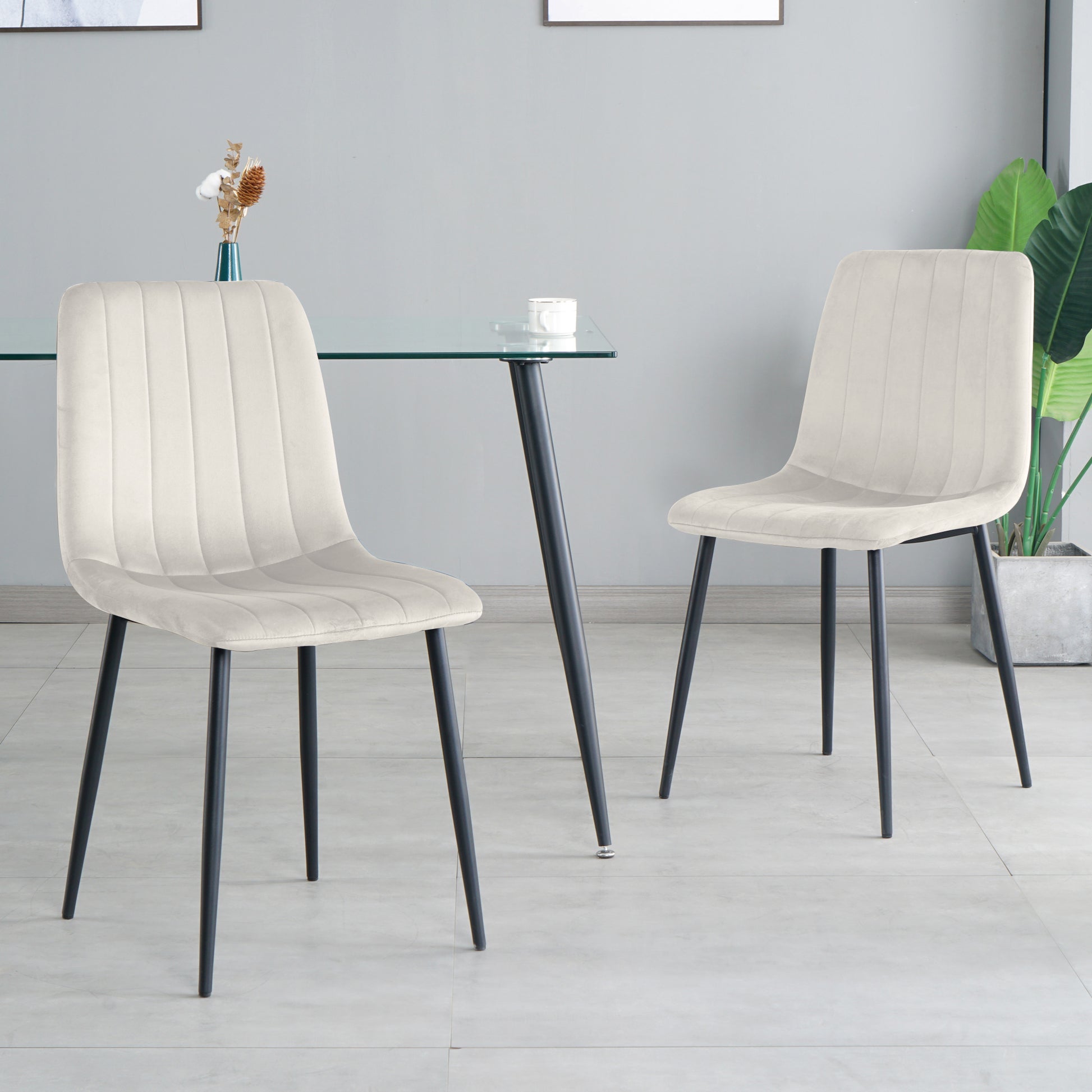 Table And Chair Set, One Table And Four Chairs. Clear Tempered Glass Table Top, 0.3 Feet Thick, Black Wrought Iron Legs. Black Spray Paint Chair Legs. Upholstered Chair Glass Cream White Metal