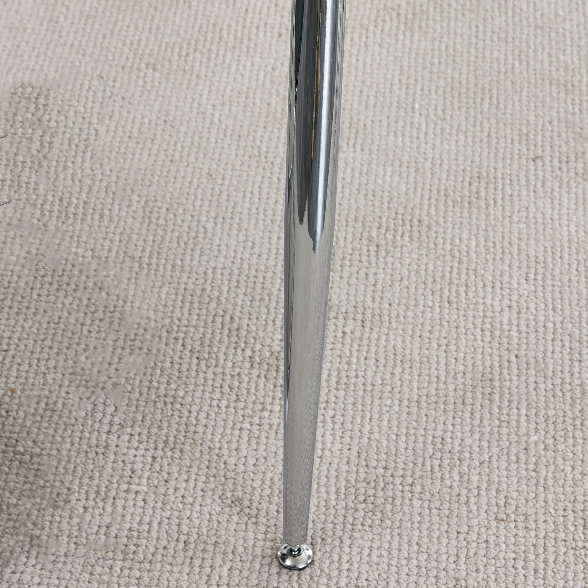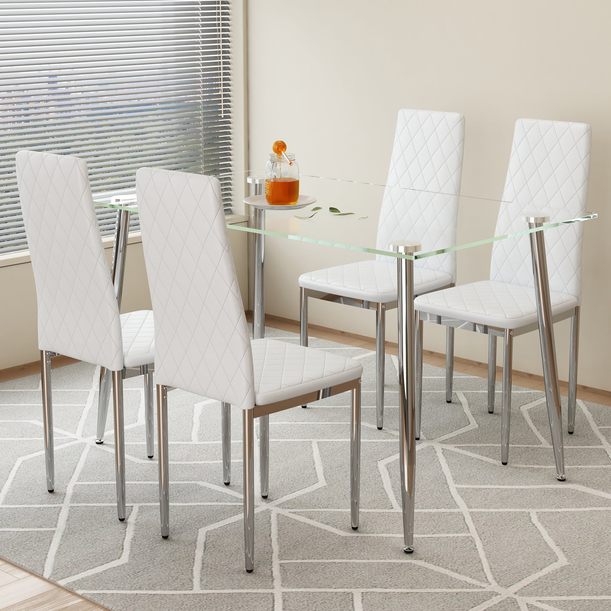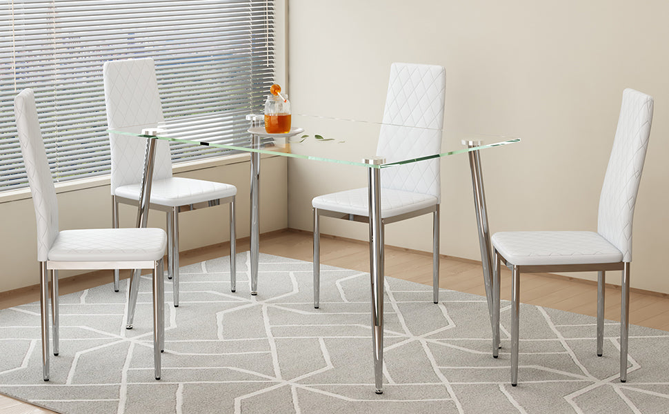 Table And Chair Set.Rectangular Dining Table With Tempered Glass Tabletop And Silver Plating Metal Legs.Paired With 4 Checkered Armless High Back White Chairs With Electroplated Metal Legs. White Seats 4 Glass Metal