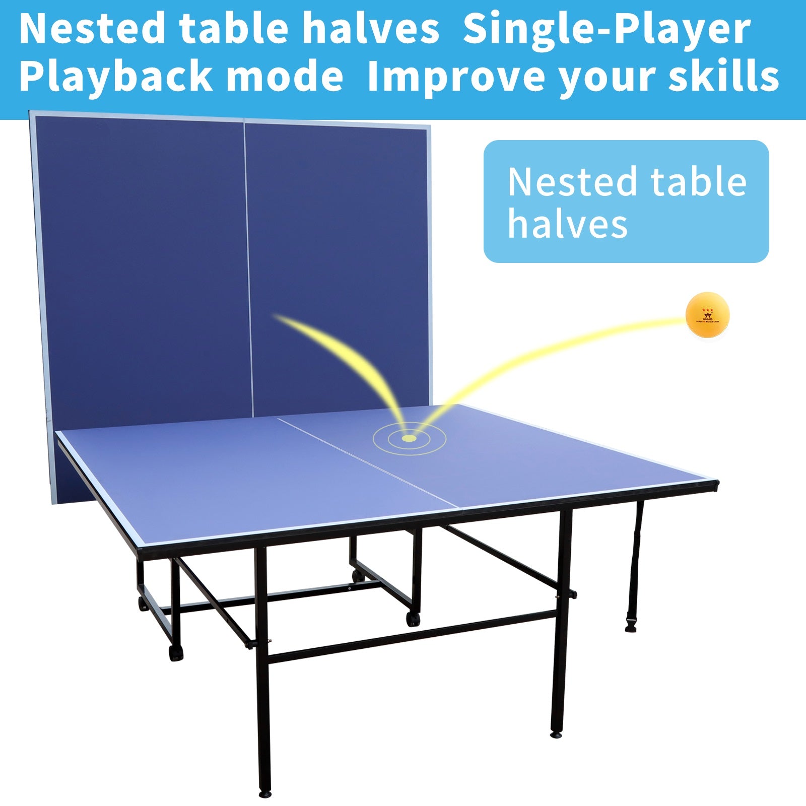 Table Tennis Table, 9Ft Foldable & Portable Ping Pong Table Set With Net For Indoor Outdoor Game Balls Sports Blue Foldable Mdf