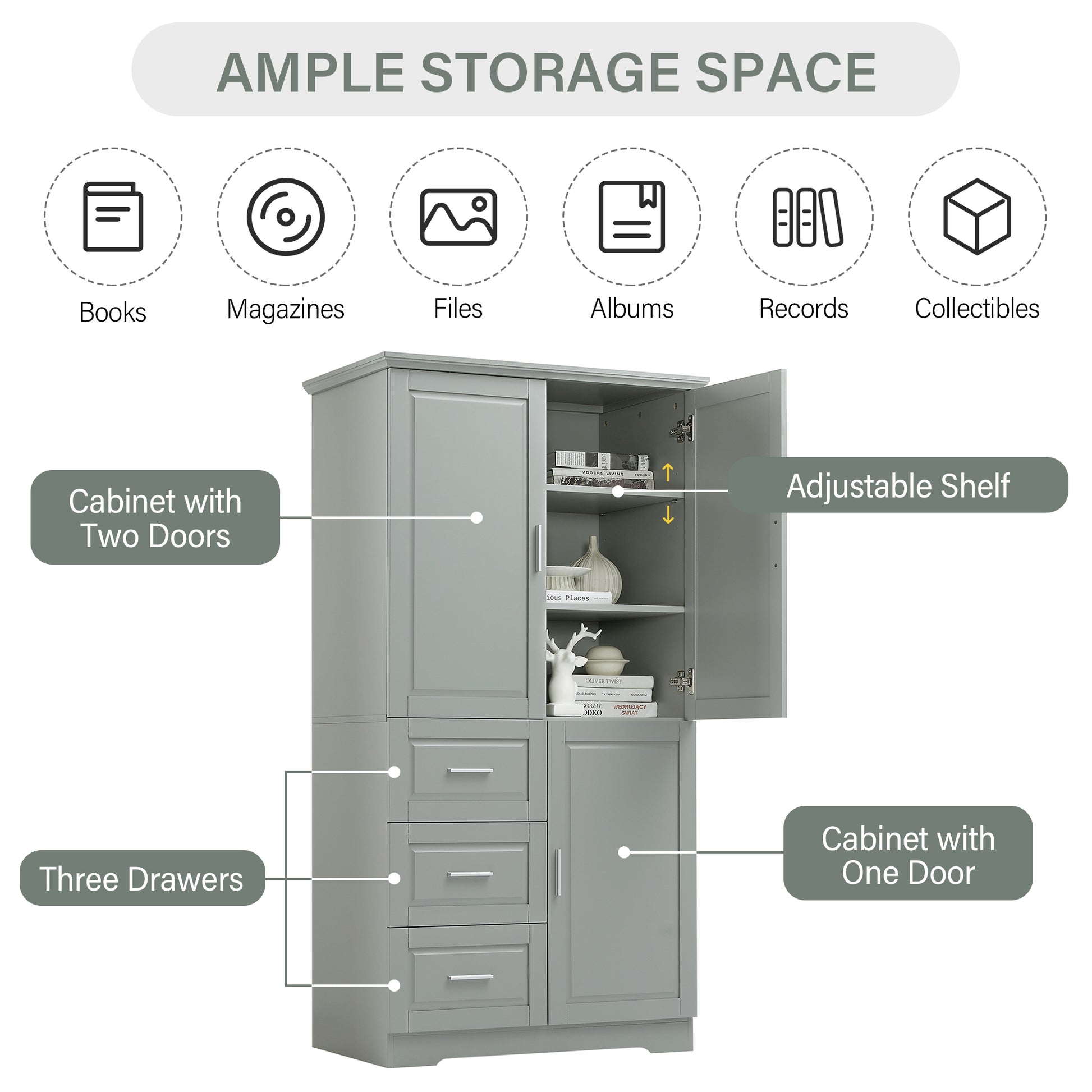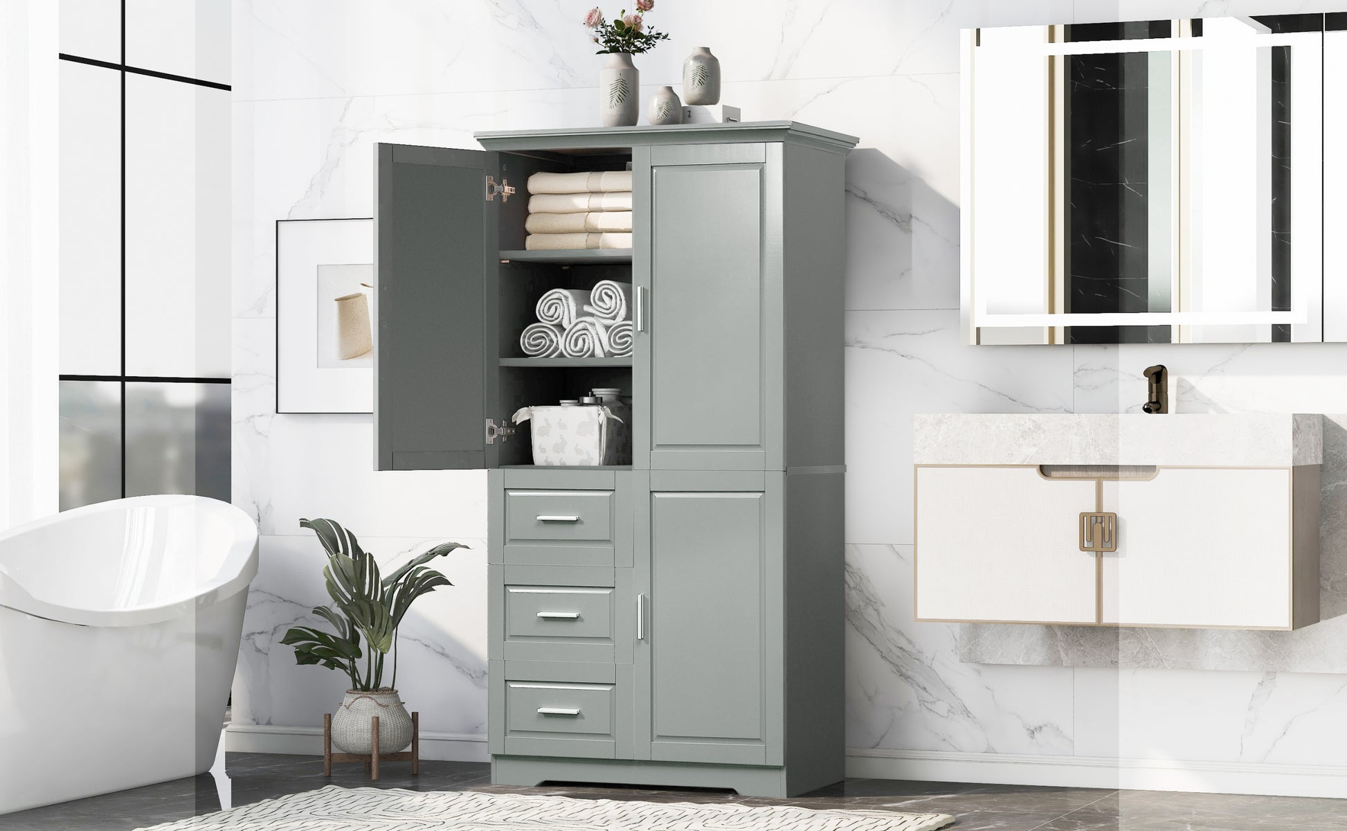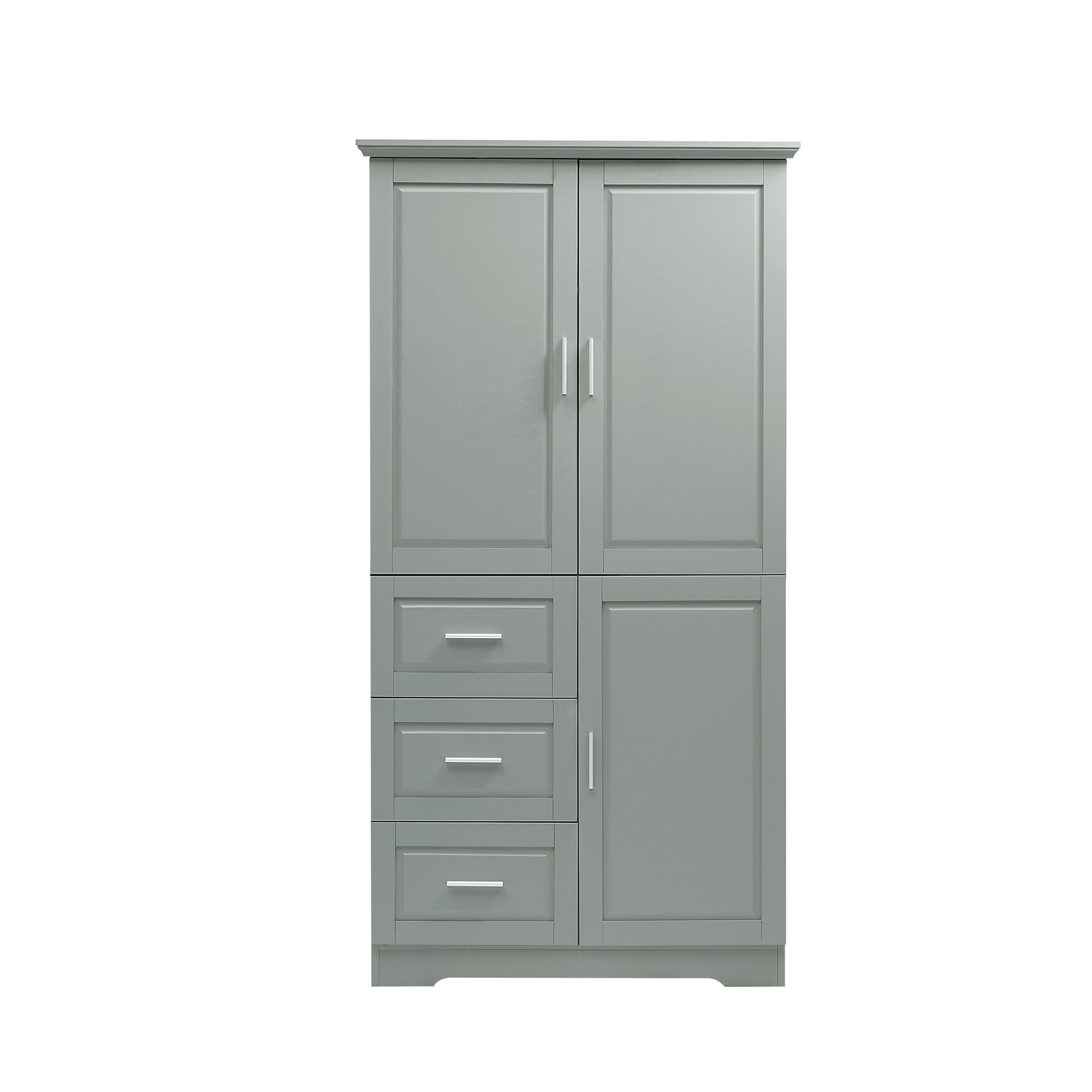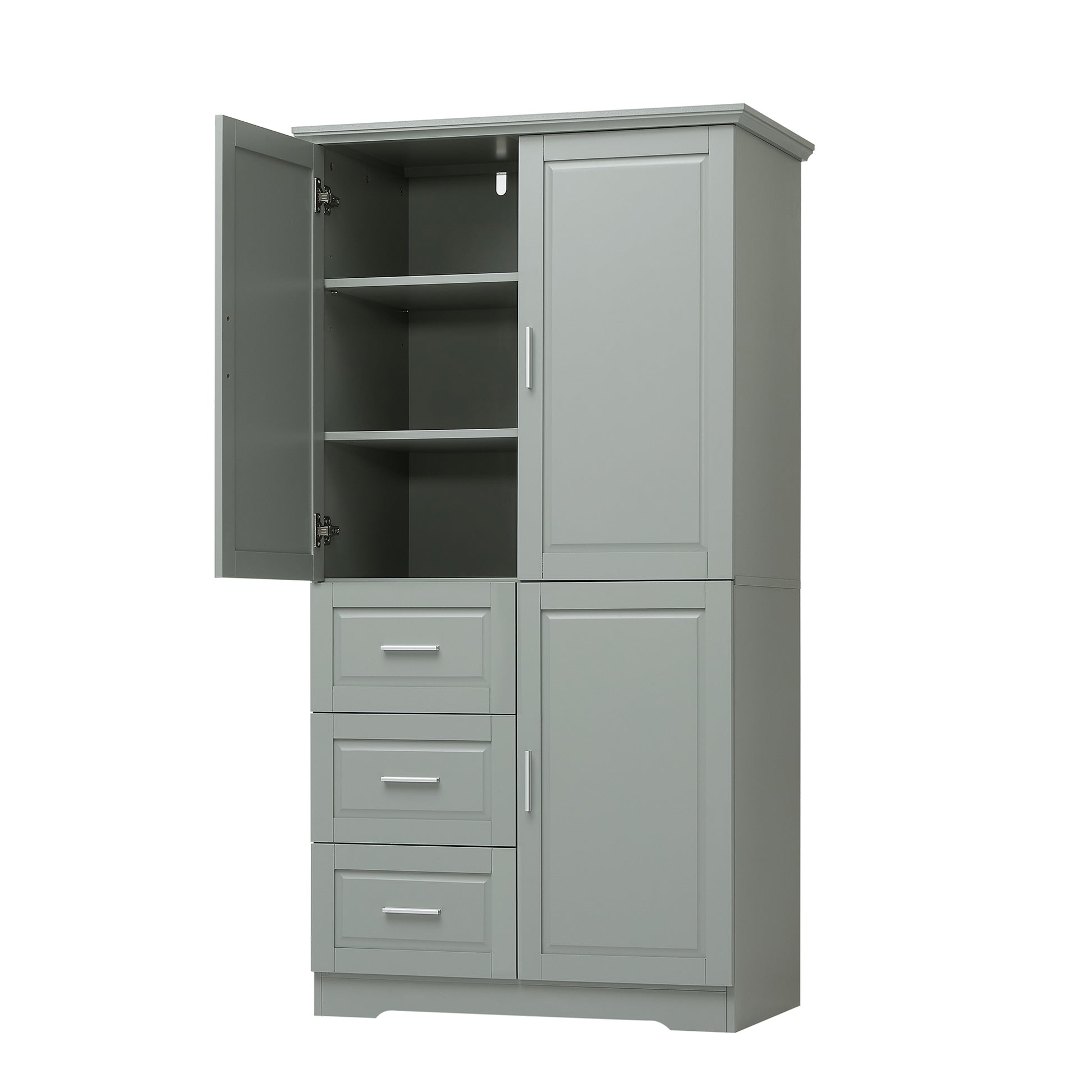 Tall And Wide Storage Cabinet With Doors For Bathroom Office, Three Drawers, Grey Grey Mdf