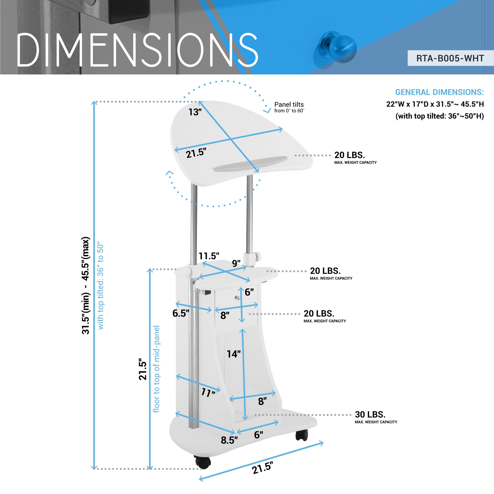 Techni Mobili Sit To Stand Rolling Adjustable Laptop Cart With Storage, White White White Standing Desk Converter Office Modern Manual Floor Mount Rectangular Mdf Steel
