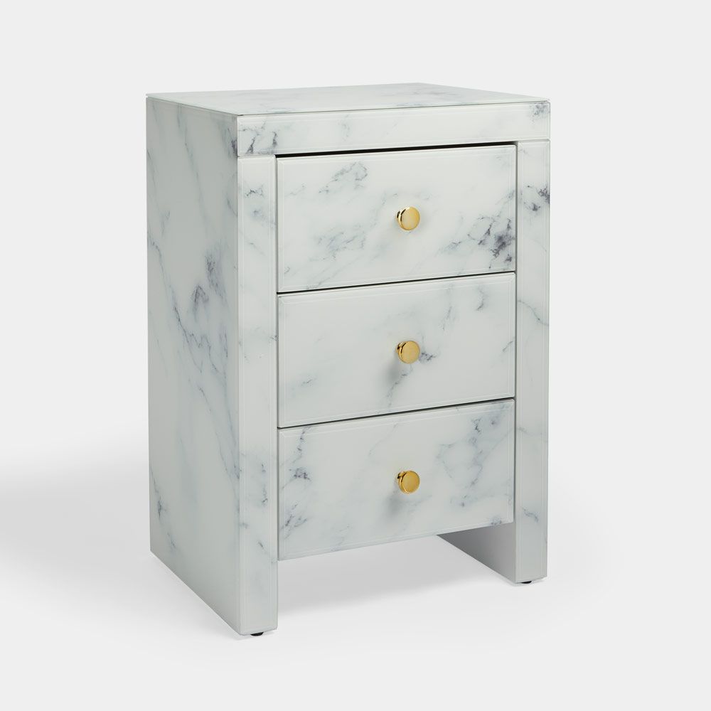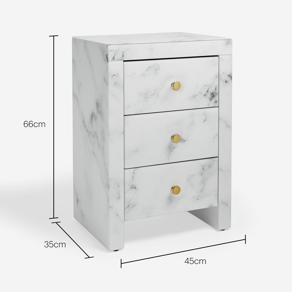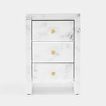 Tempered Glass Nightstand, Marble Nightstand With 3 Drawers,Side Table For Bedroom, Living Room Matte White Mdf