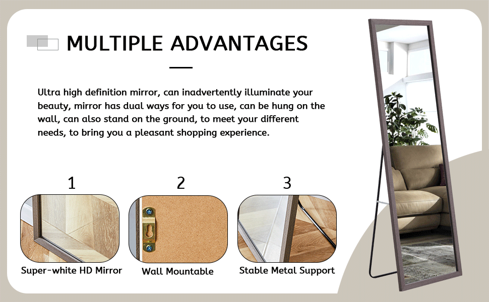 Third Generation Packaging Upgrade, Thickened Frame, Gray Wood Grain Solid Wood Frame Full Length Mirror, Dressing Mirror, Bedroom Entrance, Decorative Mirror, Floor Standing Mirror. 57.9 "* 18.1" Gray Solid Wood