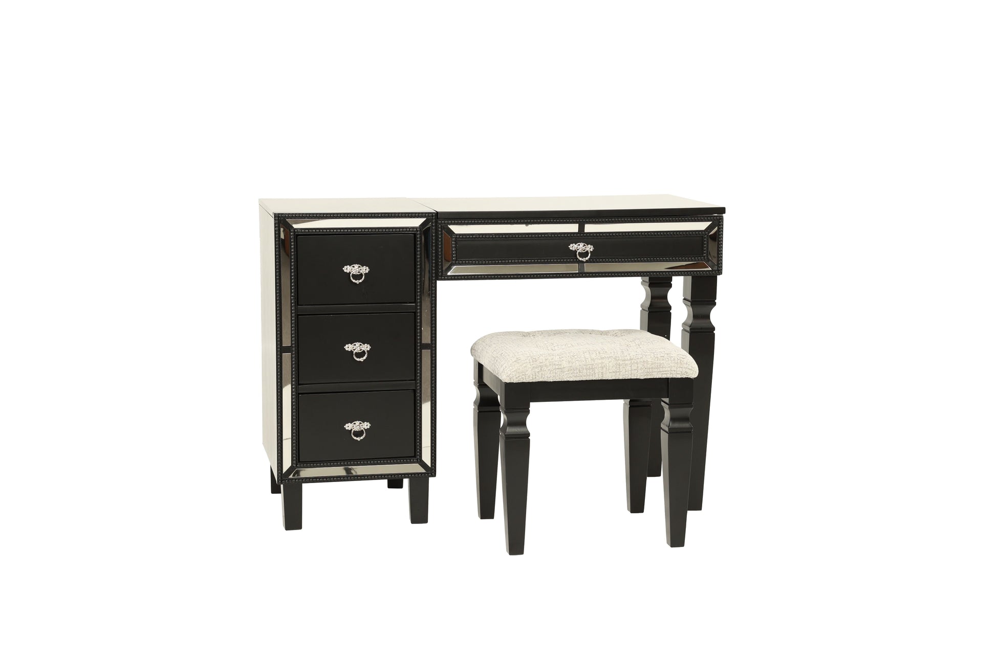 Including one mirror with three drawers that can categorize and store all your makeup sets, this vanity set with matching stool is the perfect choice for anyone who loves classic and simplicity. The makeup table also has enough room to place your lamp to have more lightings for you, or even showcase your favorite vase and candle stand. With the elegant finishing makeup table and soft cushions for the stool, this American traditional vanity set create a elegant look for your room. Available in black, cherry, white, and silver.