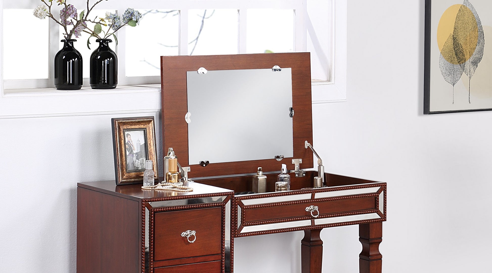 Including one mirror with three drawers that can categorize and store all your makeup sets, this vanity set with matching stool is the perfect choice for anyone who loves classic and simplicity. The makeup table also has enough room to place your lamp to have more lightings for you, or even showcase your favorite vase and candle stand. With the elegant finishing makeup table and soft cushions for the stool, this American traditional vanity set create a elegant look for your room. Available in black, cherry, white, and silver.