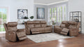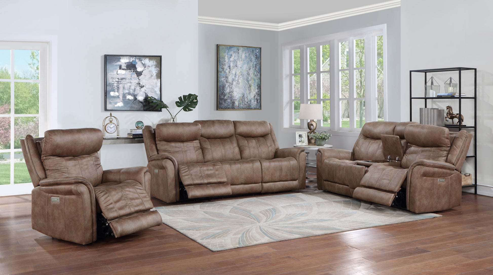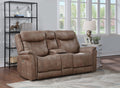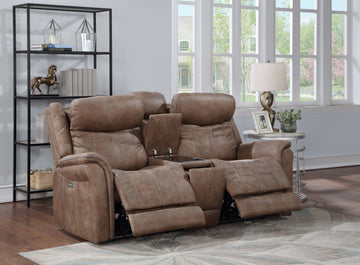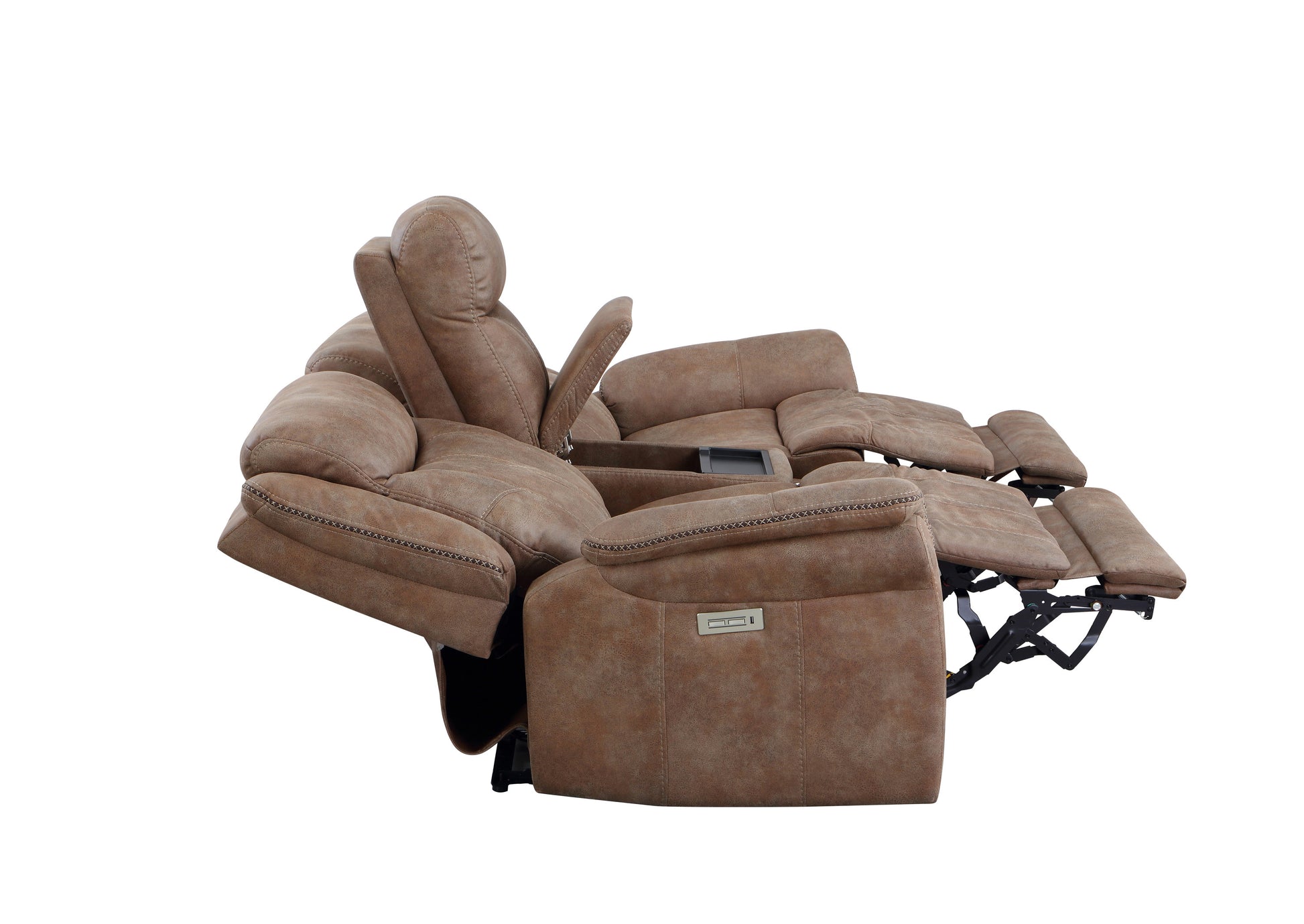 Transitional Console Loveseat Warm Camel Faux Suede, Power Footrest, Power Headrest Concealed Cupholders, Built In Console Camel Foam Fabric