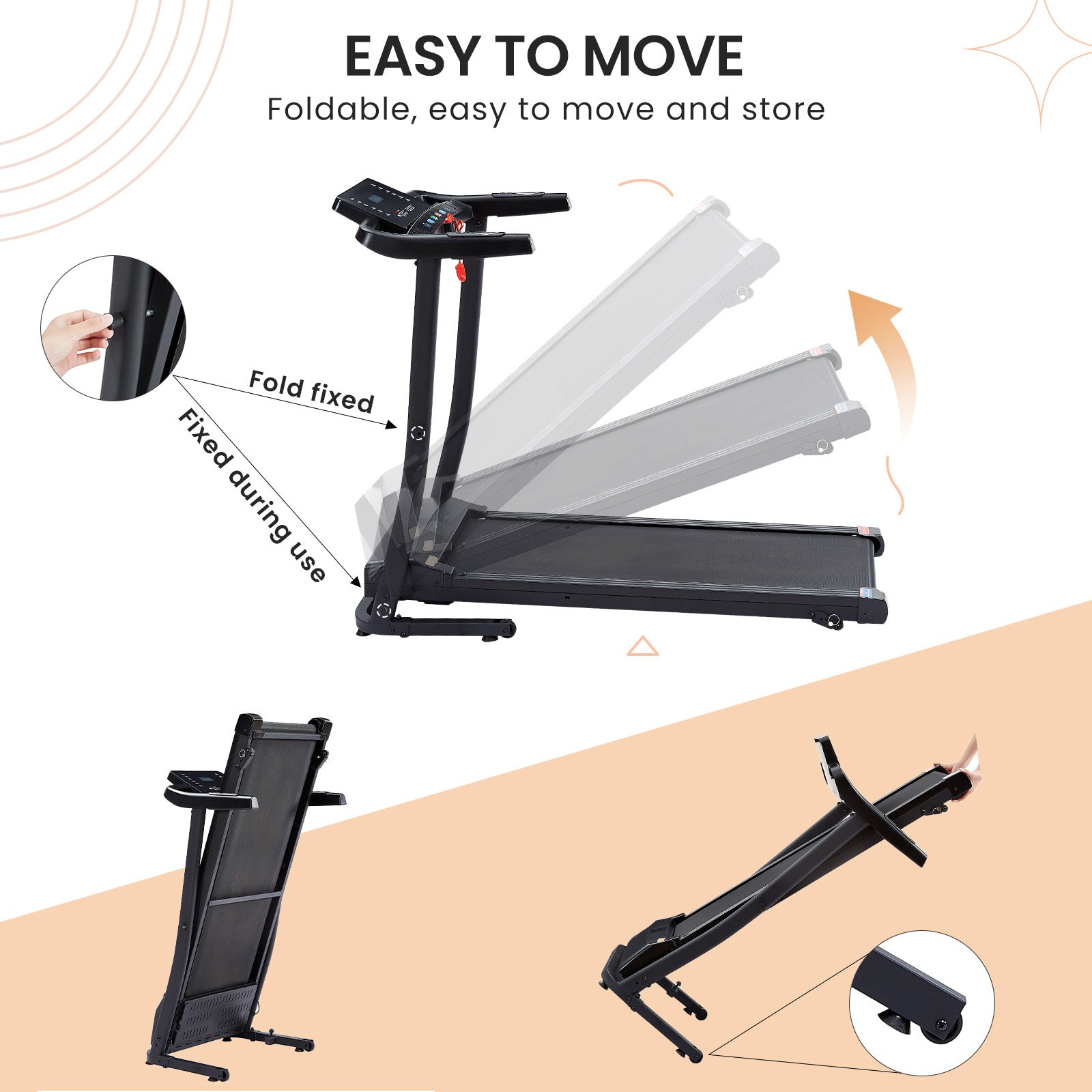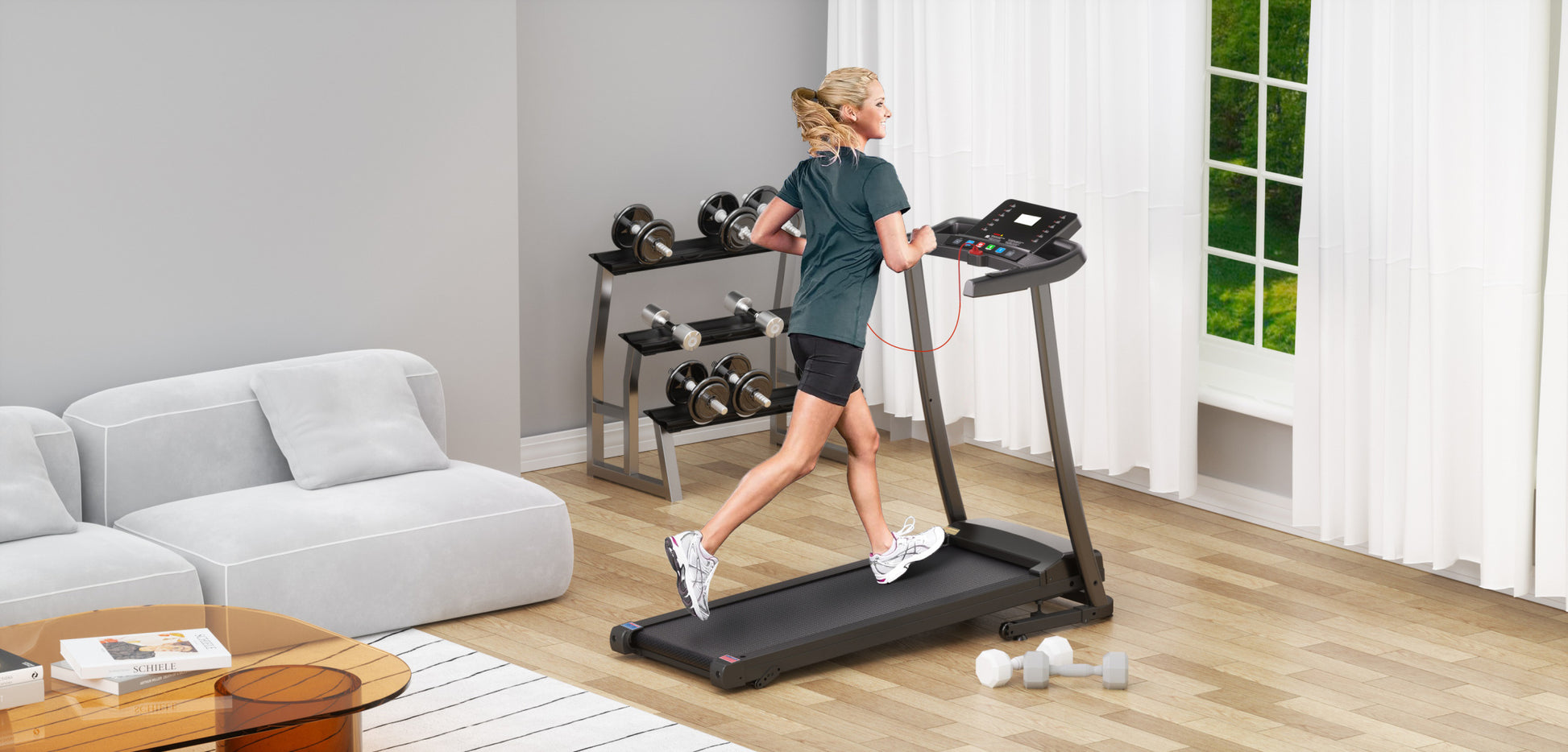 | Function | Bluetooth, audio, speed, distance, heart rate, calories, time, 12 preset programs, 3 levels of incline adjustment, 3 countdown tracking modes, foldable, cell phone holder, cup holder, safety lock, etc. |