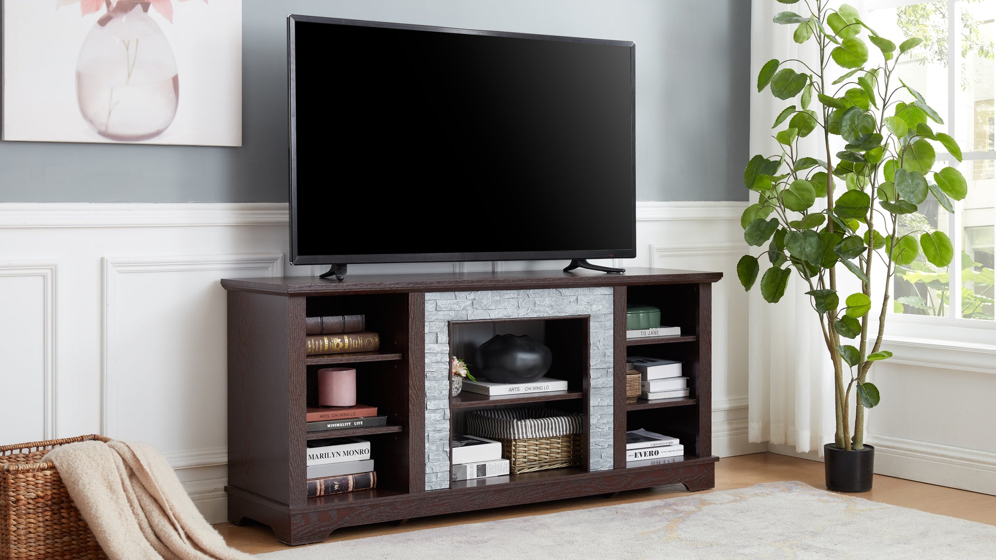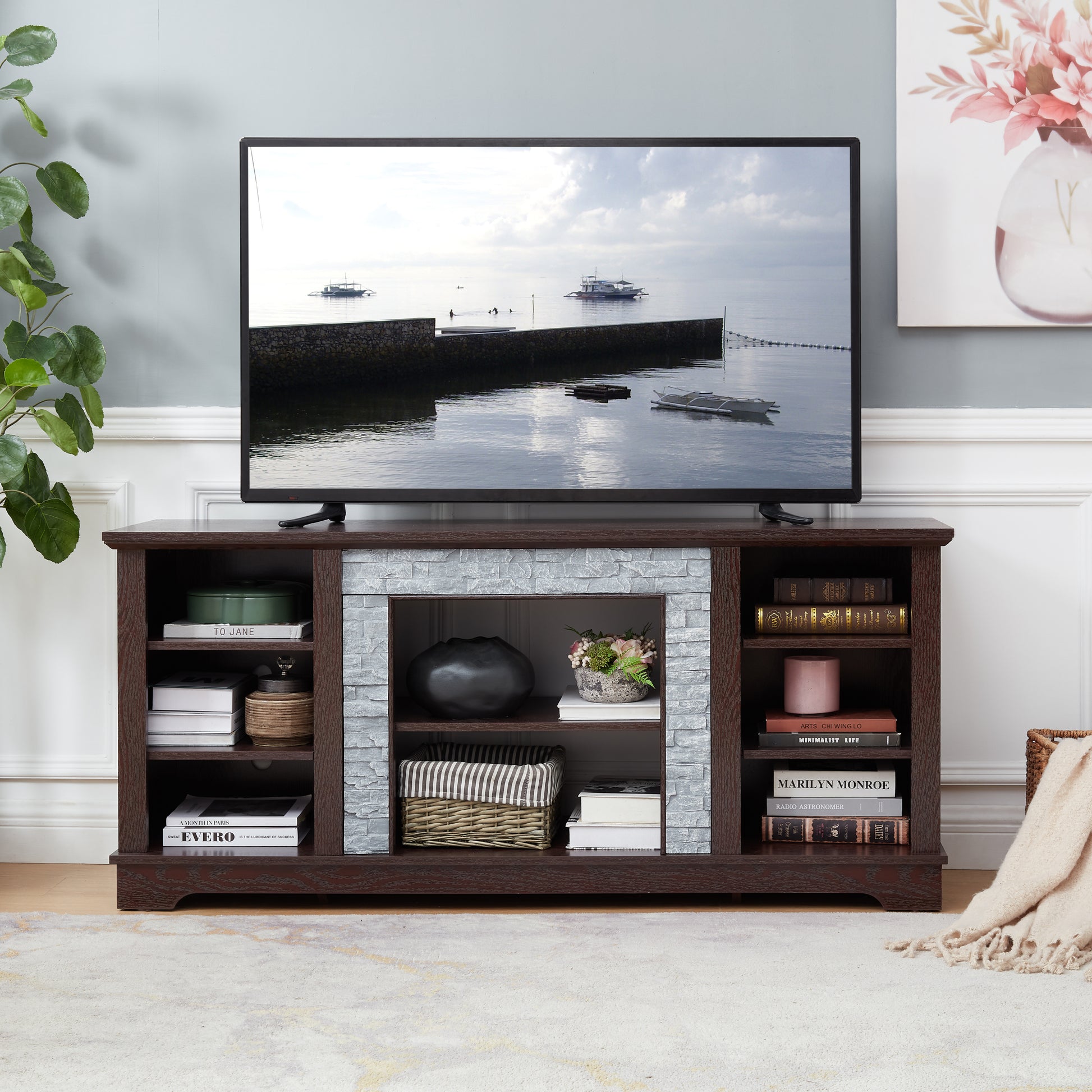 Tv Media Stand With With Faux Stacked Stone Surround, Modern Entertainment Console With Open Storage Space, Cherry, 58.31"W*15.39"D*26.06"H Cherry 60 69 Inches Mdf
