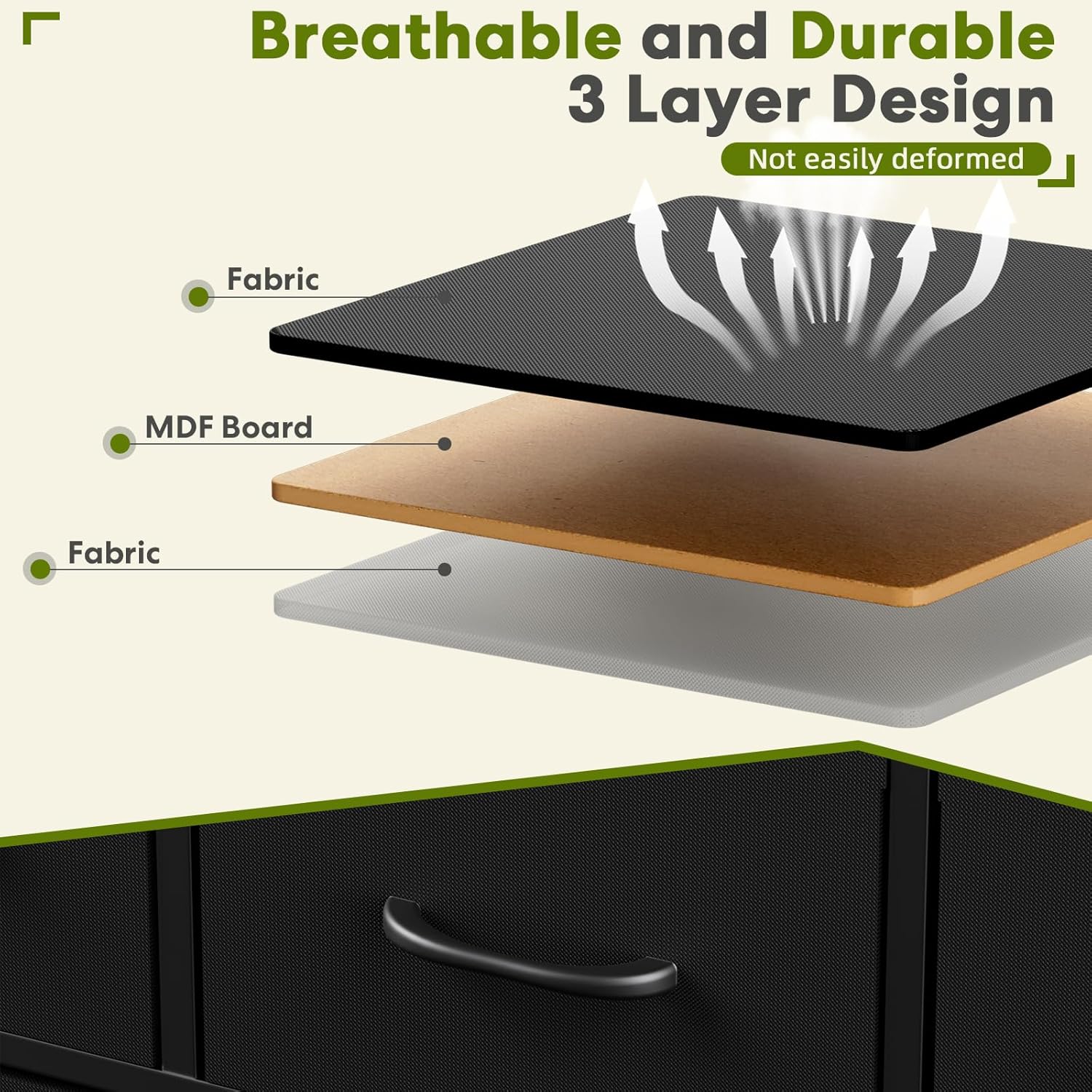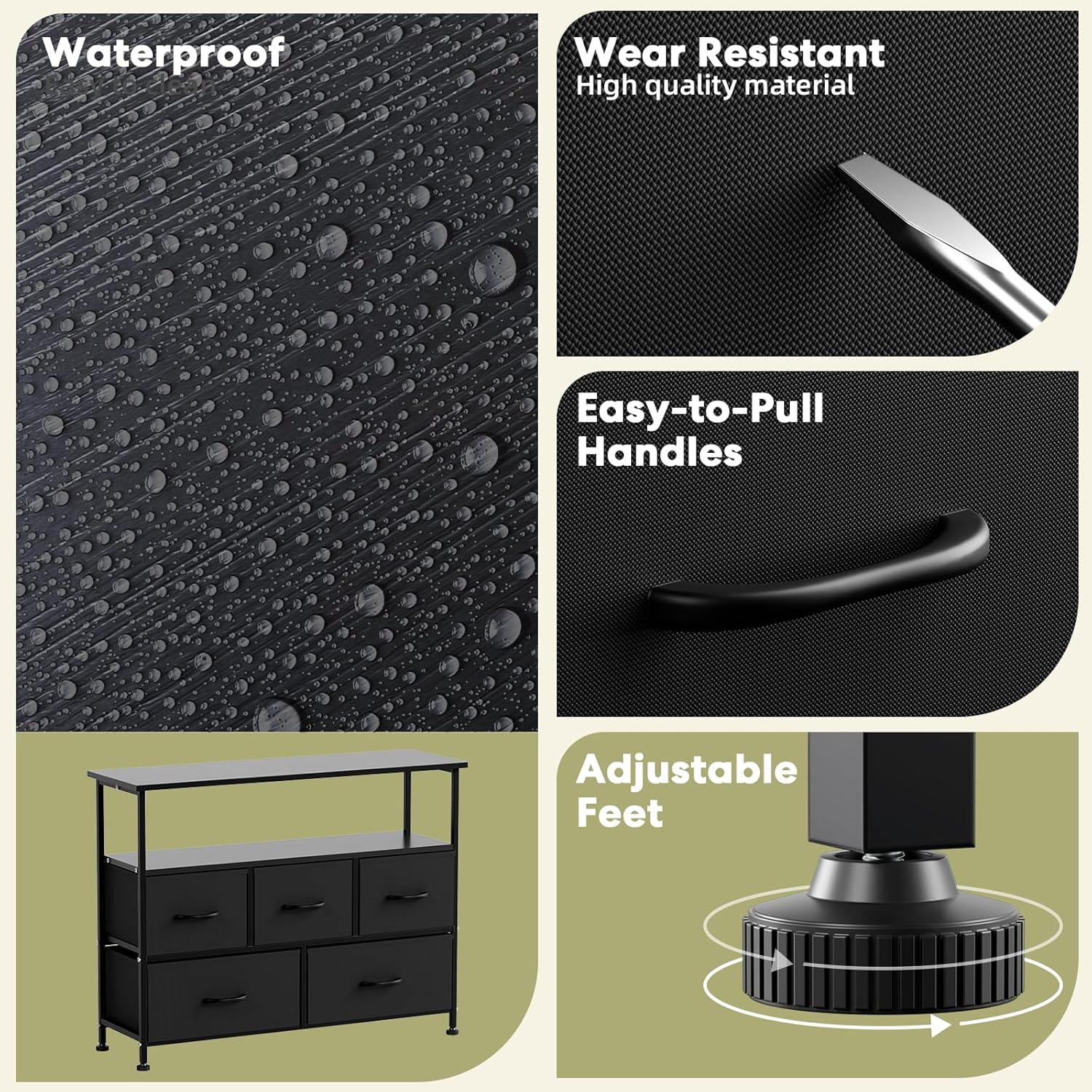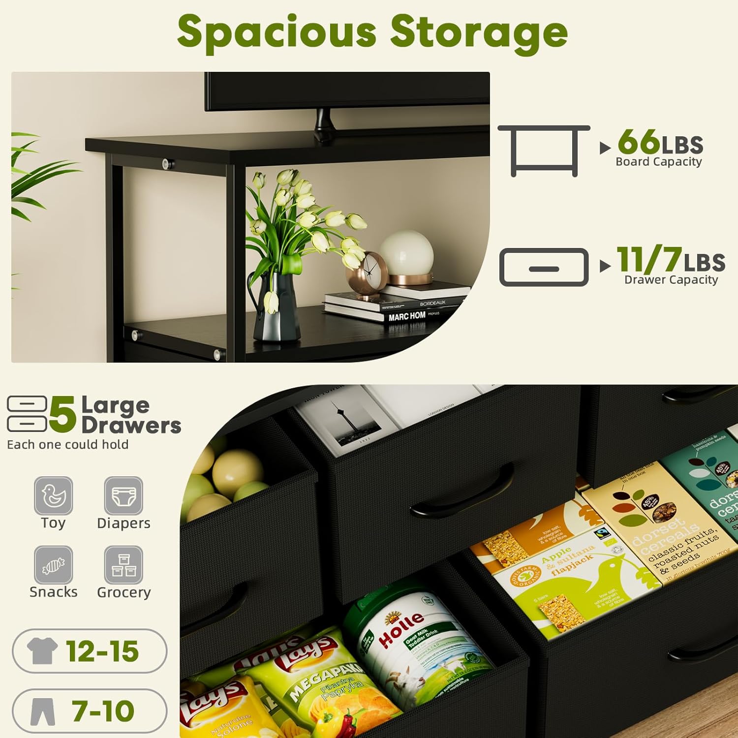 Tv Stand Dresser For Bedroom Entertainment Center With 5 Fabric Drawers, Storage Organizers Units For Living Room, Media Console Table With Open Shelf Up For 45" Tv, Black, Wood Top Black 39 Inches