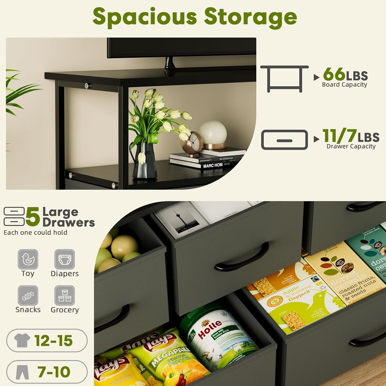 Tv Stand Dresser For Bedroom Entertainment Center With 5 Fabric Drawers, Storage Organizers Units For Living Room, Media Console Table With Open Shelf Up For 45" Tv, Gray, Wood Top Gray Wood