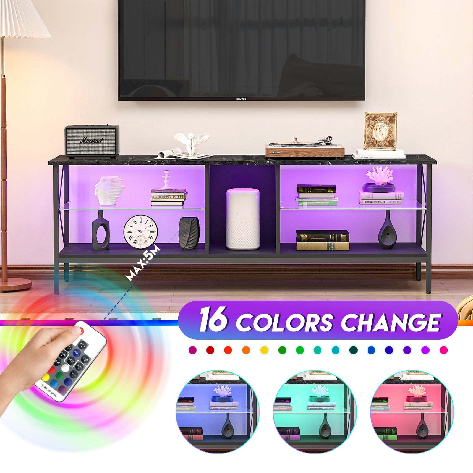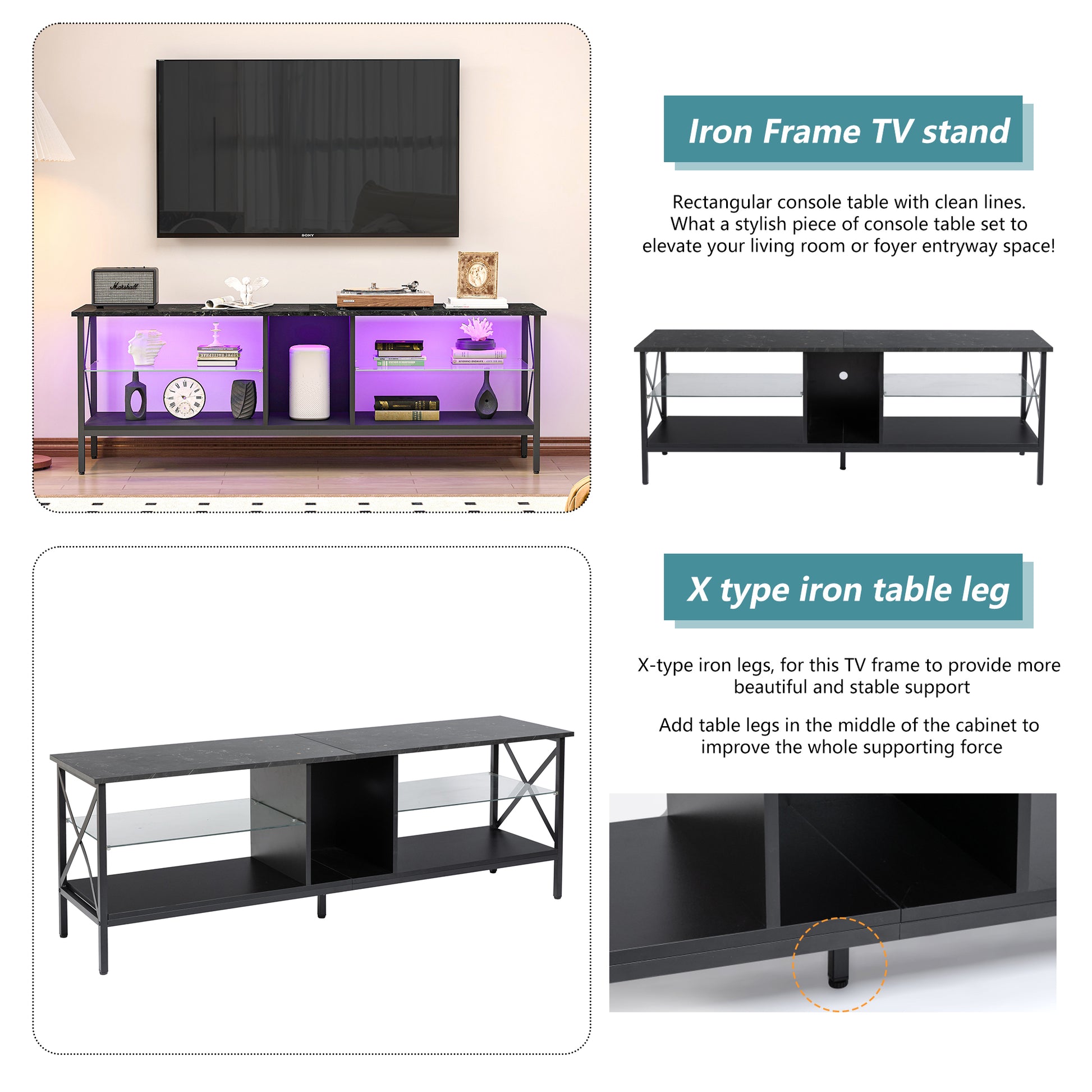 Tv Stand,Iron Tv Cabinet,Entertainment Center, Tv Set, Media Console, With Led Lights, Remote Control,Toughened Glass Stand,Can Be Placed In The Living Room, Bedroom, Color:Black With Marble Texture Black Primary Living Space 60 69 Inches 60 69 Inches 65