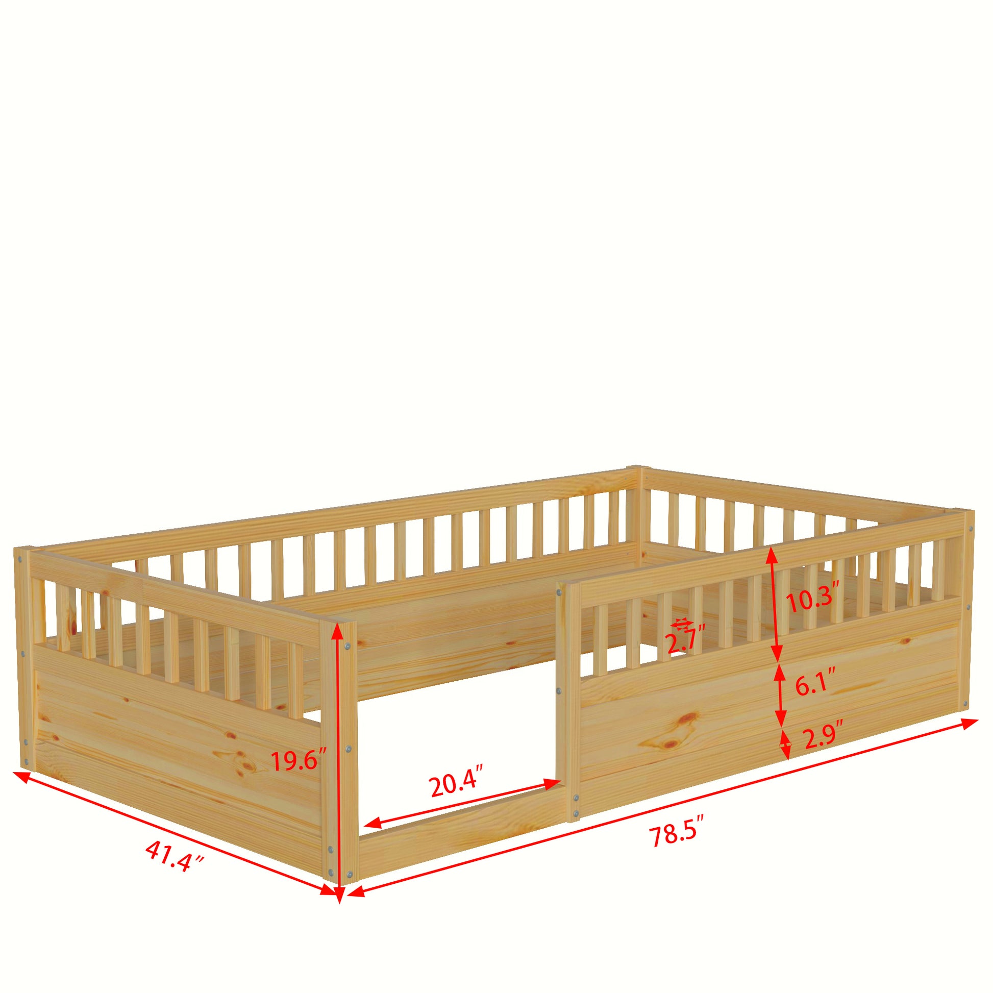 Twin Floor Bed Frame With Fence, Wood Kids Floor Beds Frame For Bedroom Playroom,Natural Expect Arrive Date Jun. 21St Twin Natural Pine