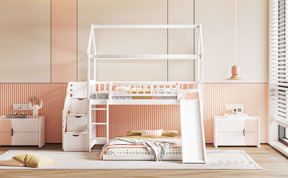Twin Over Twin Bunk Bed With Two Drawers And Slide, House Bed With Slide, White Old Sku :Lt000129Aak White Pine