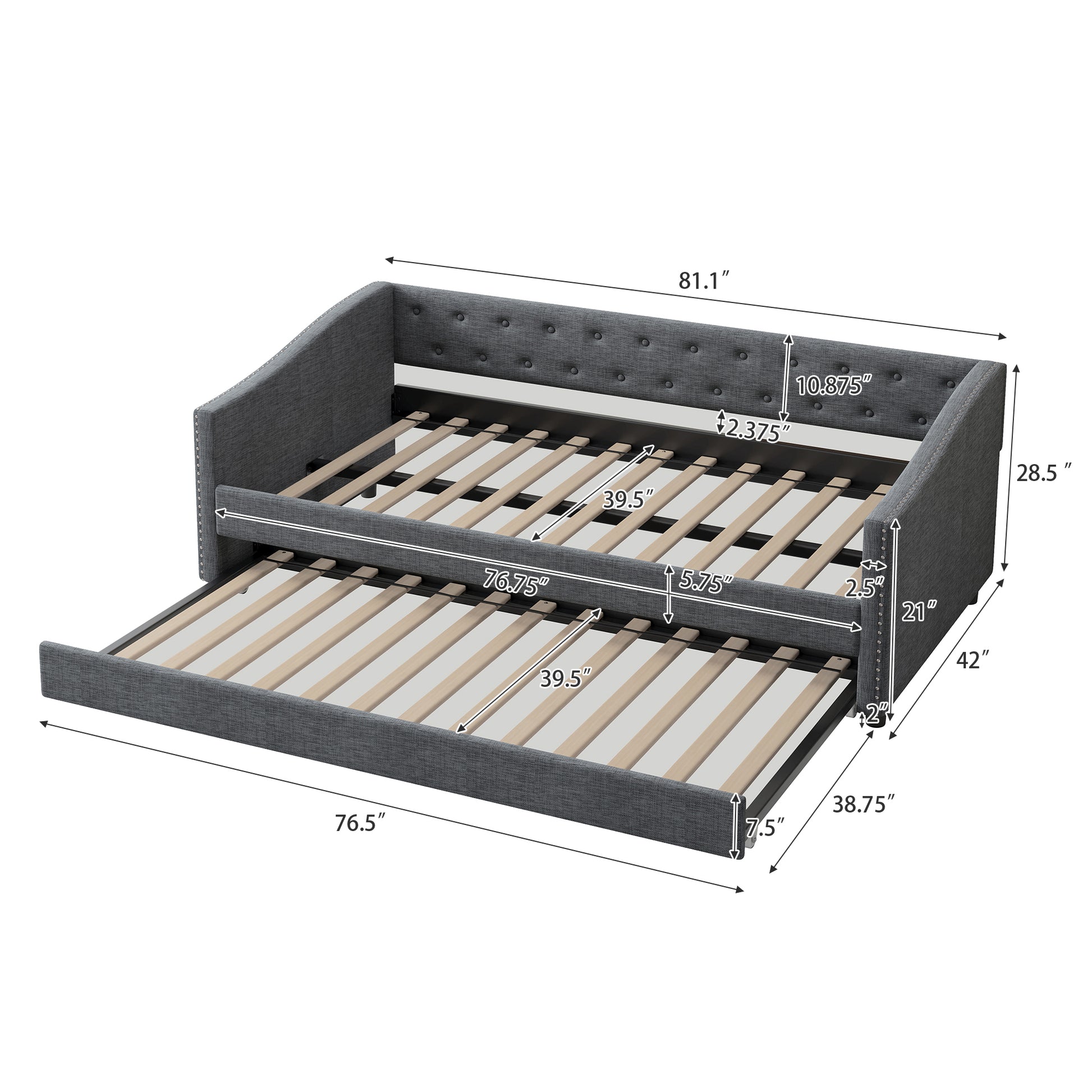 Twin Size Daybed With Twin Size Trundle Upholstered Tufted Sofa Bed, With Button On Back And Copper Nail On Waved Shape Arms Dark Grey Twin Dark Grey Wood Fabric