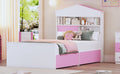 Twin Size House Shaped Wooden Bed With Storage Shelf On The Headboard, Built In Two Storage Drawers, Pink Pink White Wood