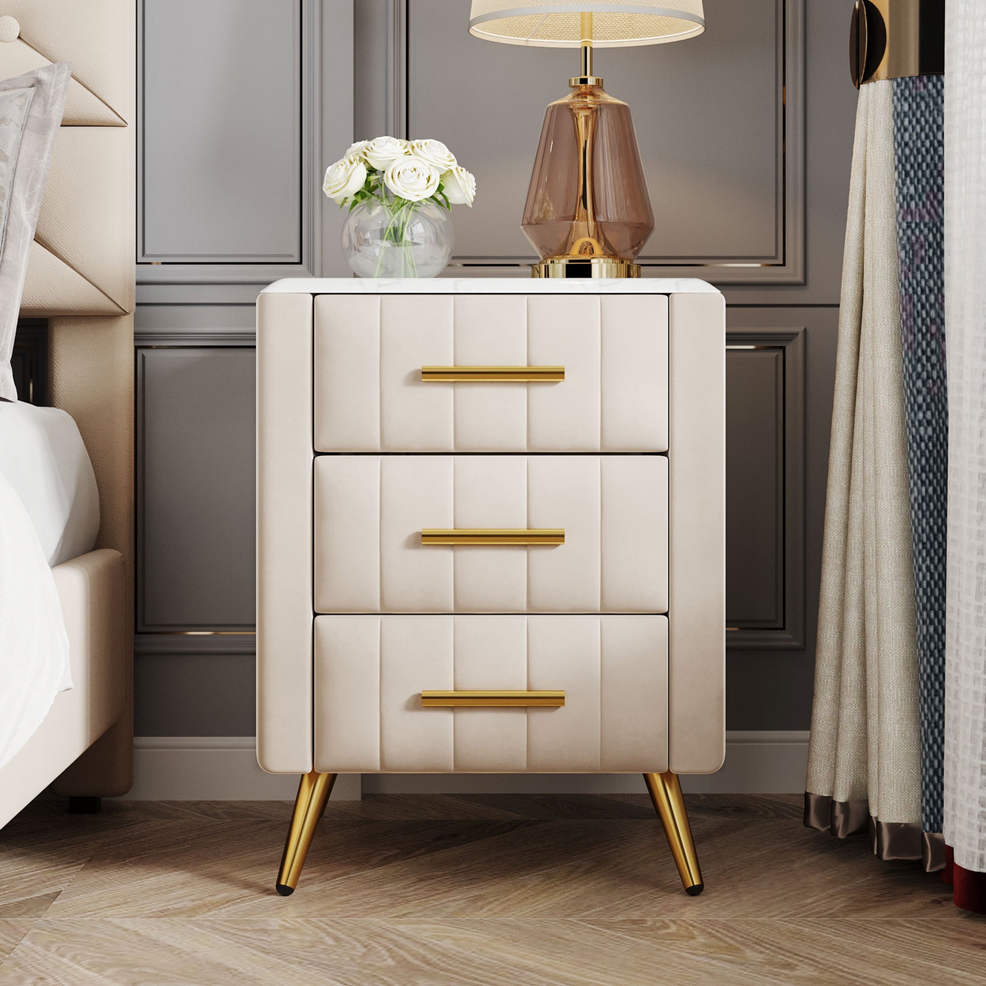 Upholstered Wooden Nightstand With 3 Drawers And Metal Legs&Handles,Fully Assembled Except Legs&Handles,Bedside Table With Marbling Worktop Beige Beige Velvet