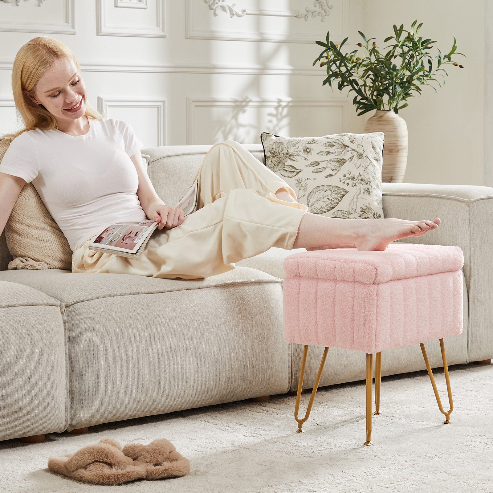 Vanity Stool Chair With Storage, Ottoman Faux Fur Soft Padded Makeup Footstools Seat With 4 Metal Legs Anti Slip Adjustable Feet Modern,Pink Pink Faux Fur