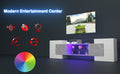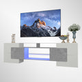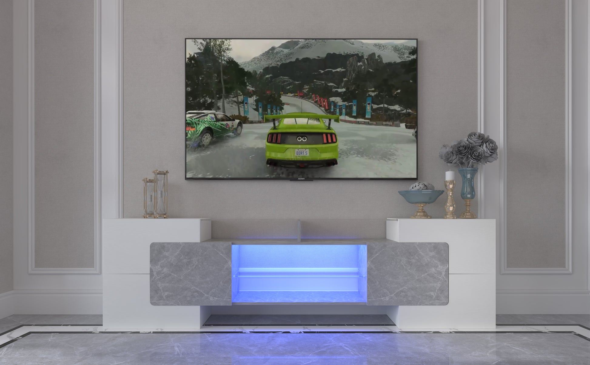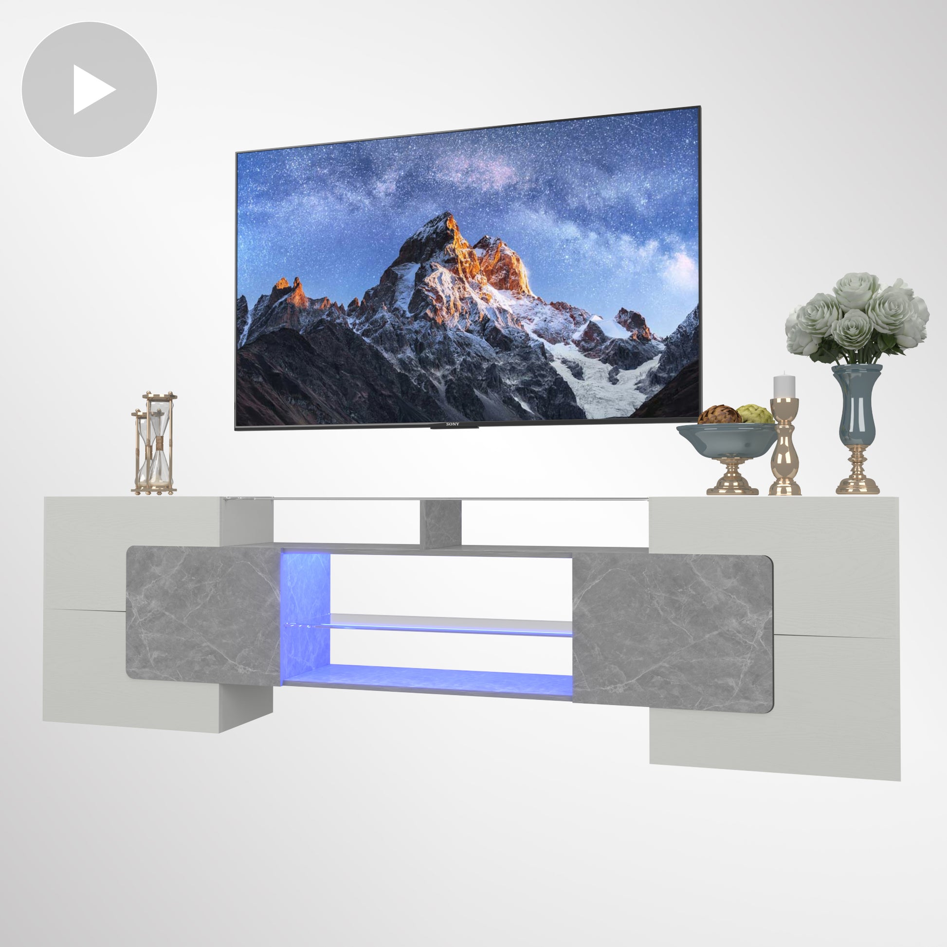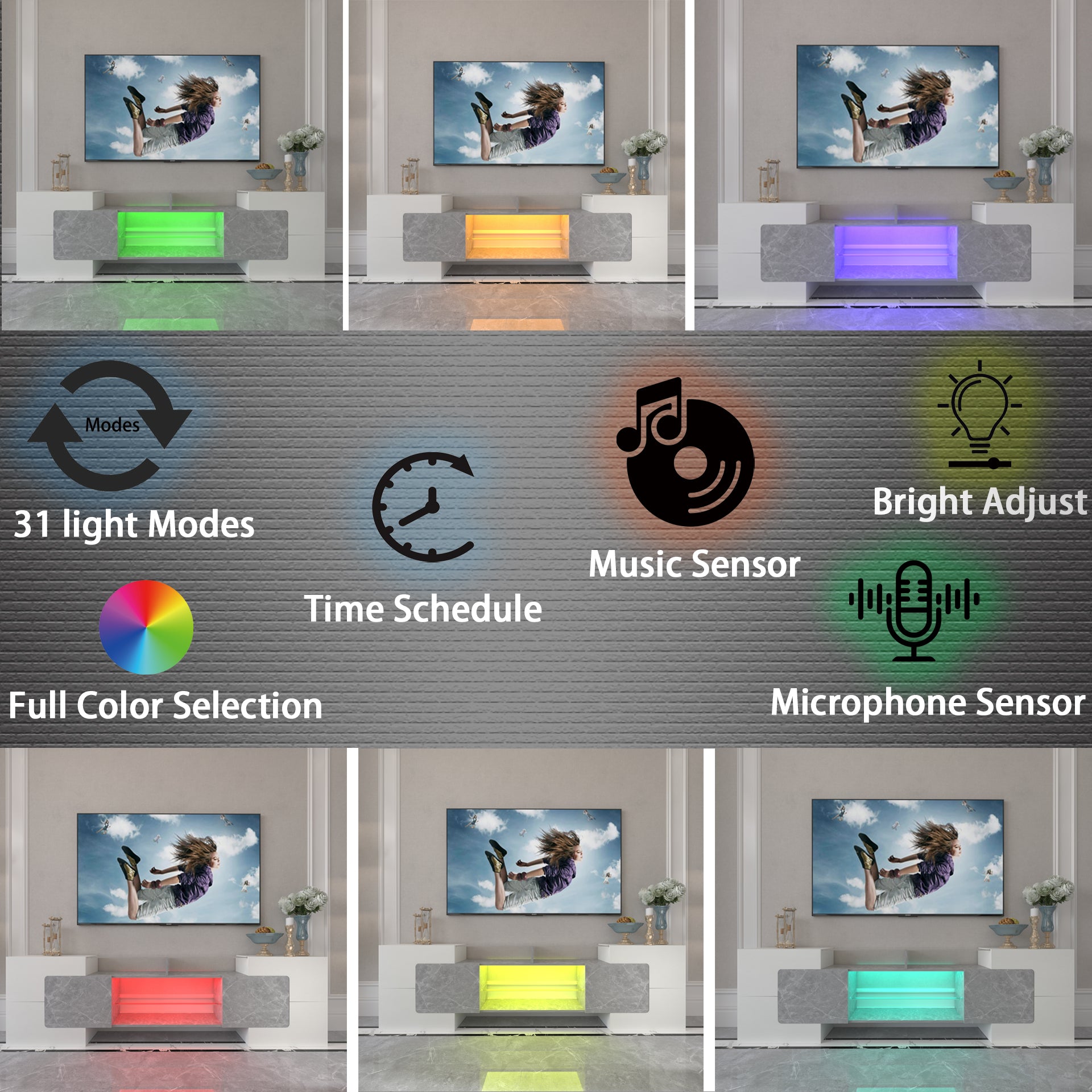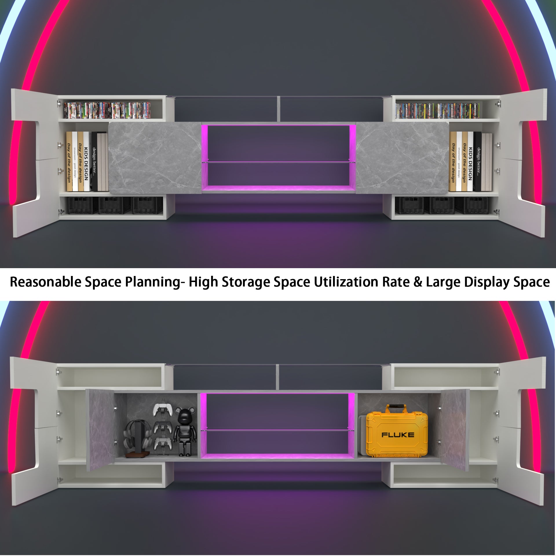Video Tv Console With Storage Cabinets, Long Led Tv Stand Full Rgb Color Selection, 31 Modes Changing Lights Modern Entertainment Center With 2 Tempered Glass Shelves Grey White, For 80 Inches Marble Primary Living Space 80 89 Inches 80 89 Inches Modern