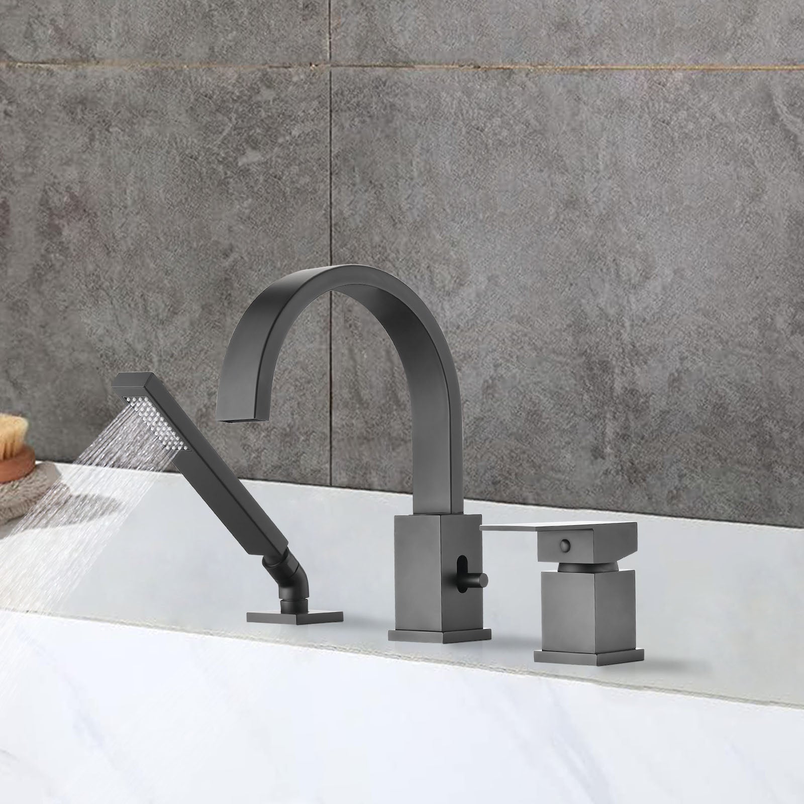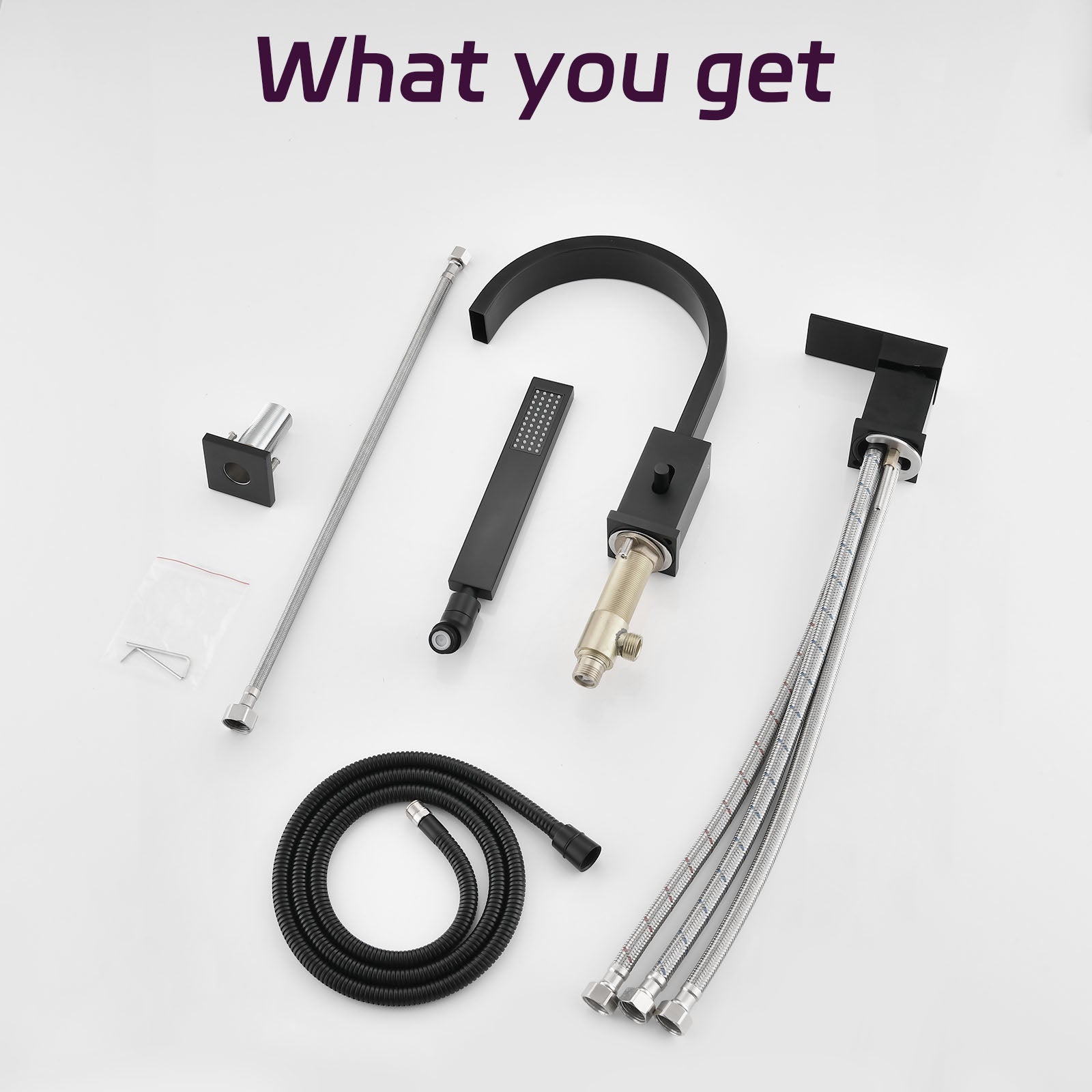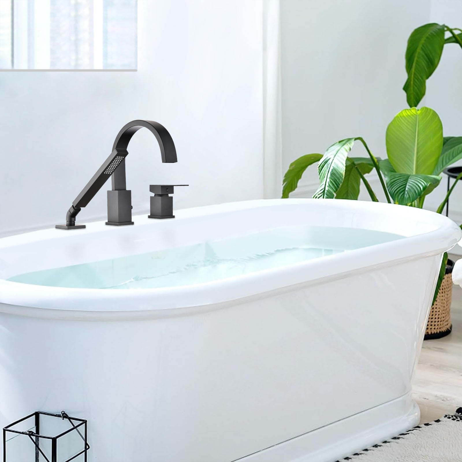 Waterfall Bathtub Faucet With Sprayer, 3 Hole Roman Tub Filler With Hand Shower Deck Mount Waterfall Tub Spout Set Matte Black Stainless Steel