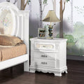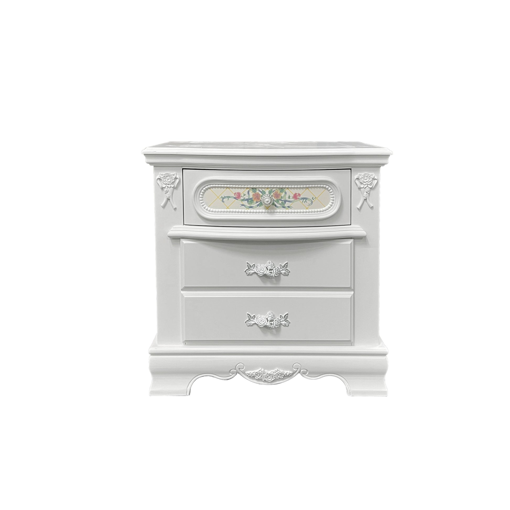 White 2 Drawer Nightstand With Floral Motifs White 3 Drawers Bedroom Rectangle Felt Lined Drawers White Wood