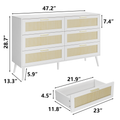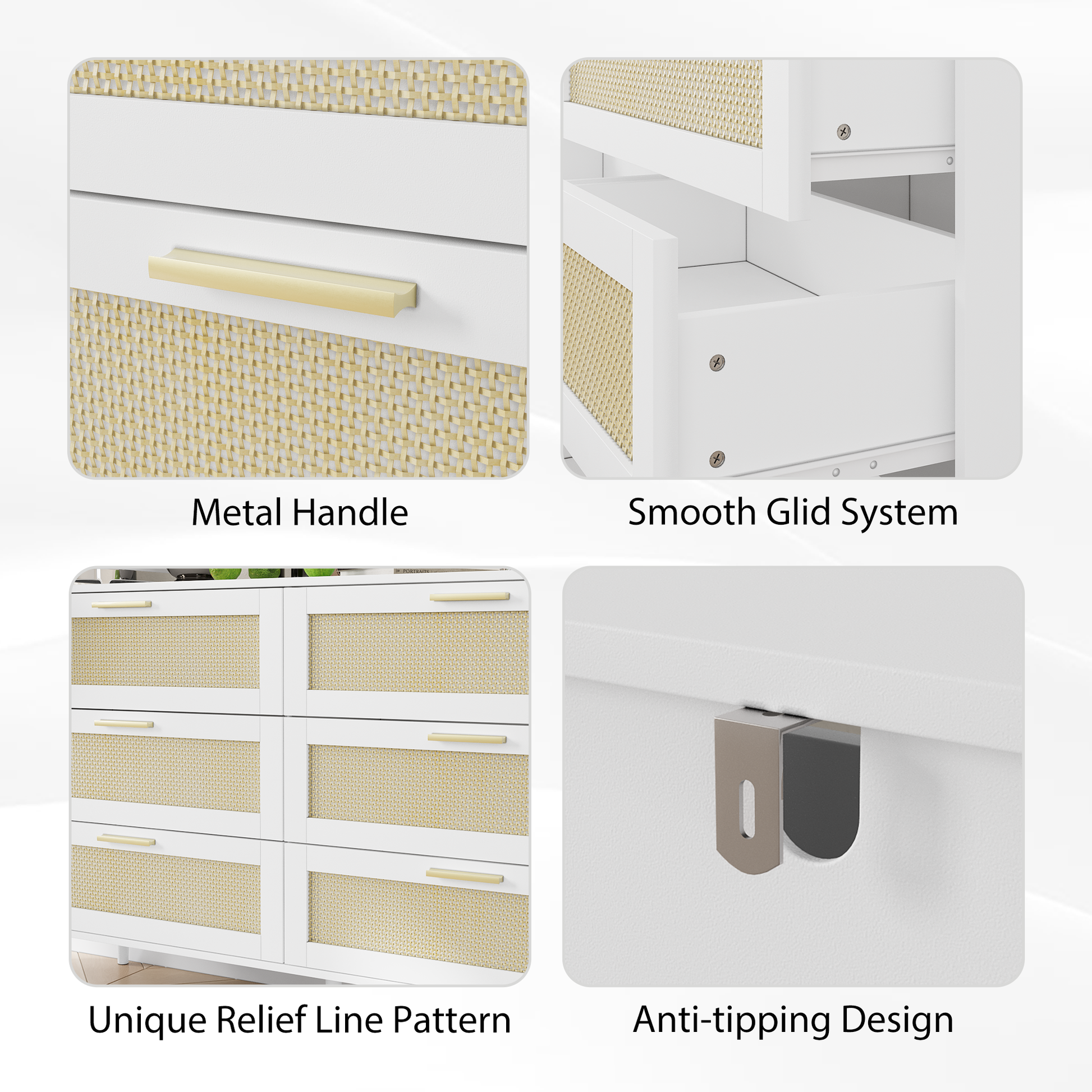 White Rattan 6 Drawers Chest Of Dressers For Bedroom Modern 6 Drawer Dresser, Wide Chest Of Drawers With Gold Handles, Rattan Dresser Storage Cabinet For Living Room, Bedroom, Hallway White American Design,American Traditional,Antique,Casual,Wild Style